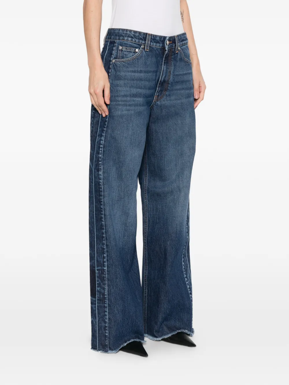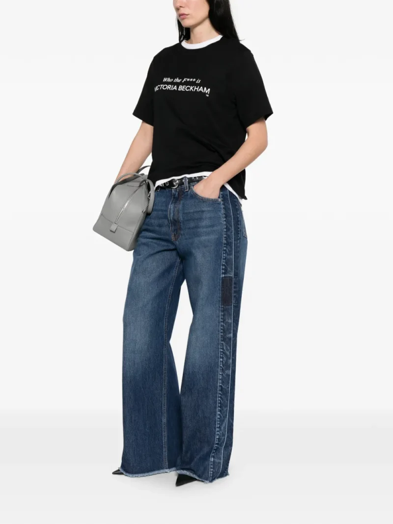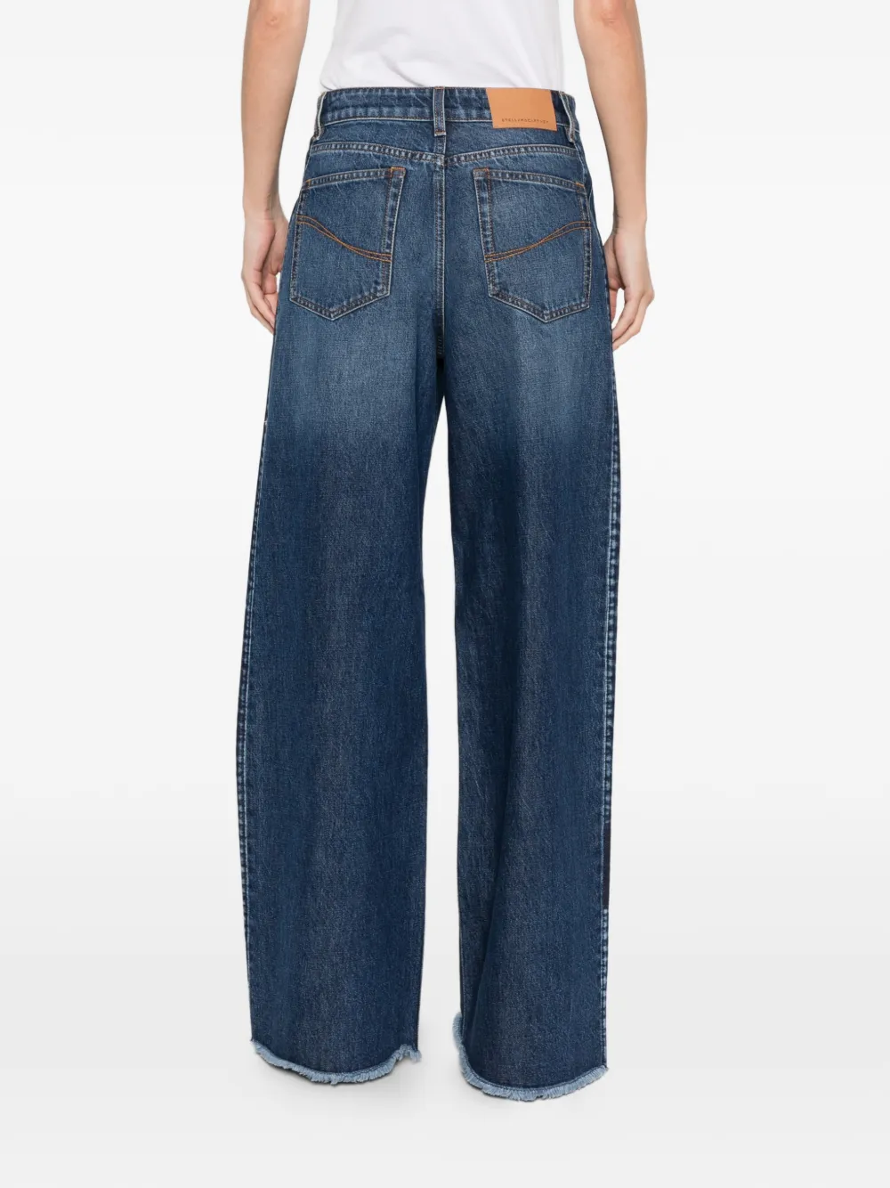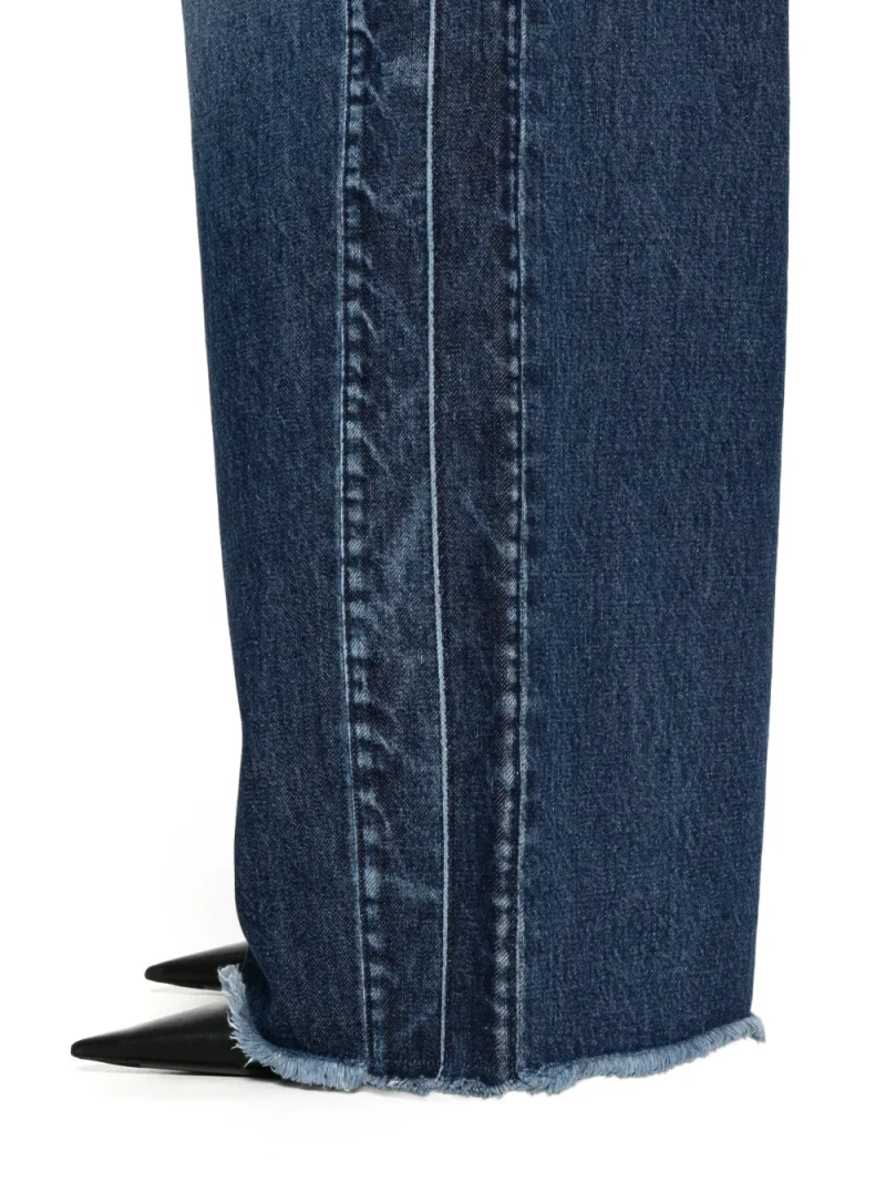 Pantaloni denim Stella McCartney Panelled Frayed bleumarin, realizati din bumbac denim, cu inchidere nasture si fermoar, model 5-pockets, laterale compuse din panouri, croiala wide-fit si tiv franjurat. Potriviti pentru sezonul primavara/vara. 100% bumbac.