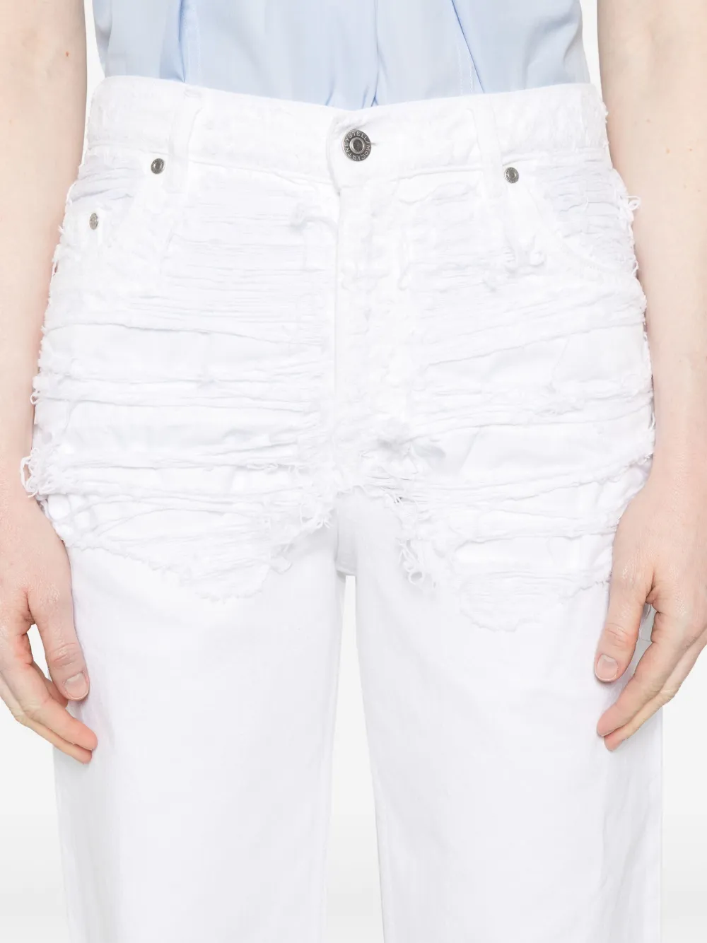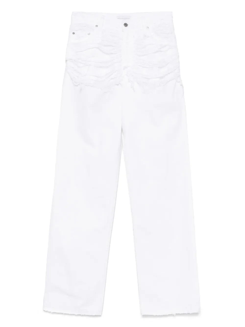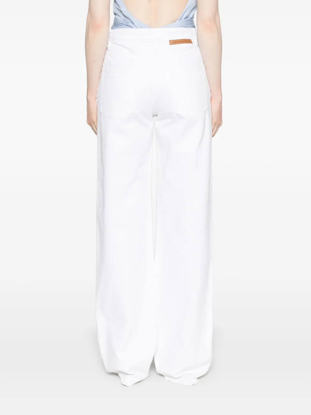 Pantaloni denim Stella McCartney Ripped alb, din bumbac denim, cu inchidere nasture si fermoar, model „5-pockets”, eticheta cu logo la spate, detalii cu aspect uzat, croiala larga si tiv drept. Potriviti pentru sezonul primavara/vara. 57% poliester; 40% bumbac; 3% viscoza; 100% bumbac denim.