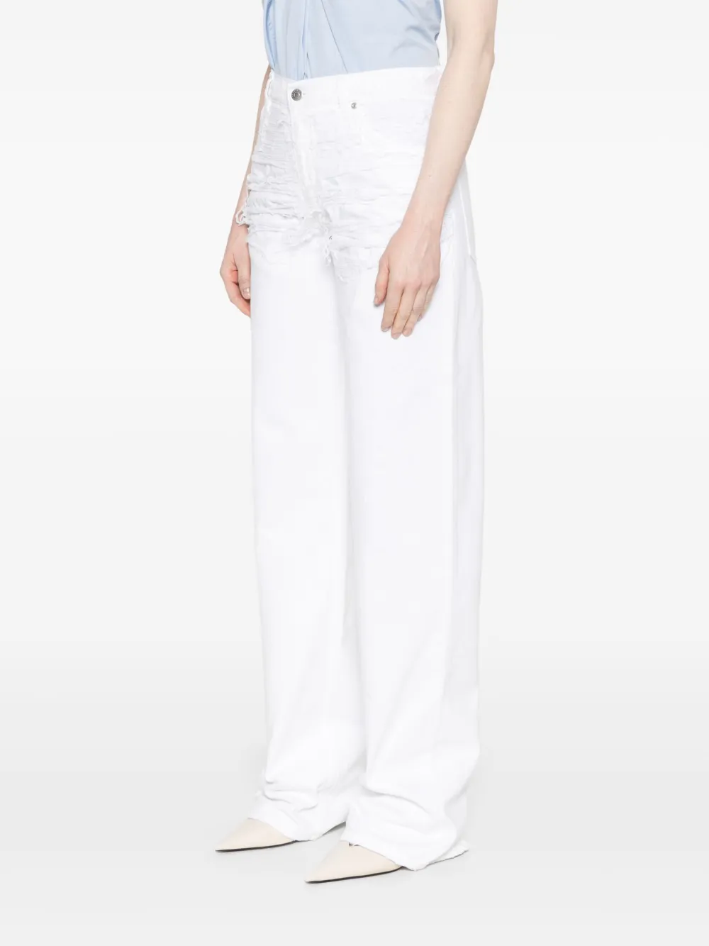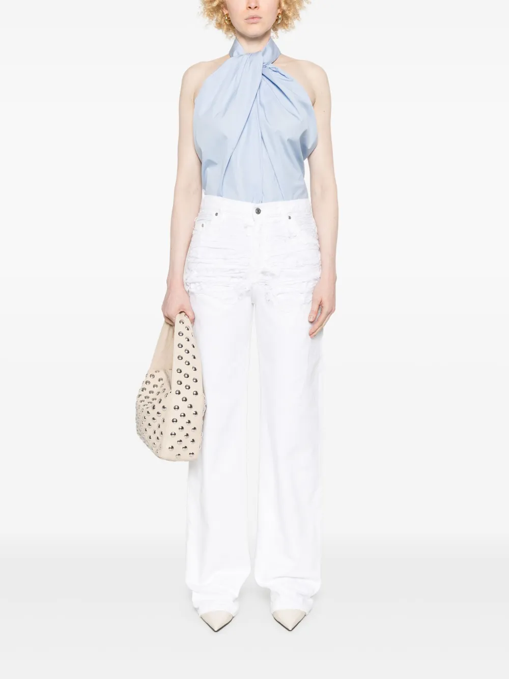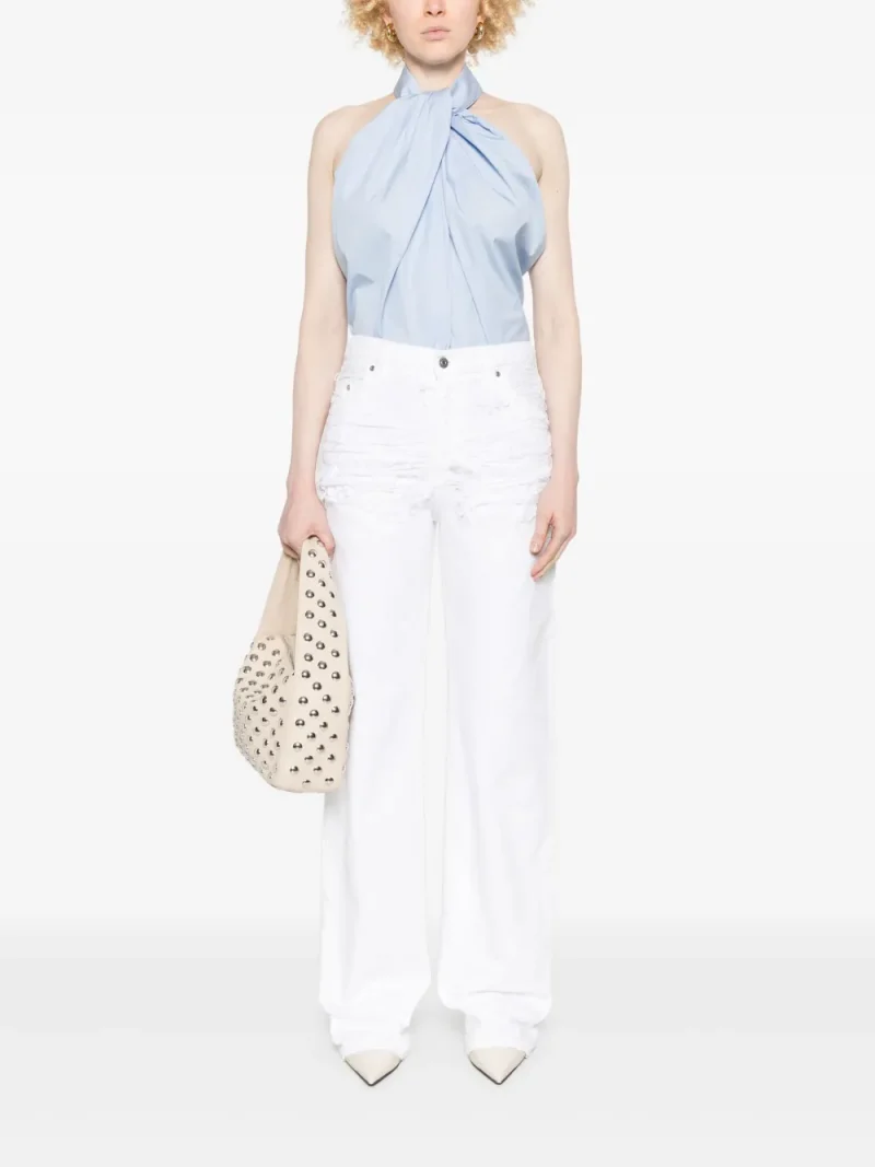 Pantaloni denim Stella McCartney Ripped alb, din bumbac denim, cu inchidere nasture si fermoar, model „5-pockets”, eticheta cu logo la spate, detalii cu aspect uzat, croiala larga si tiv drept. Potriviti pentru sezonul primavara/vara. 57% poliester; 40% bumbac; 3% viscoza; 100% bumbac denim.