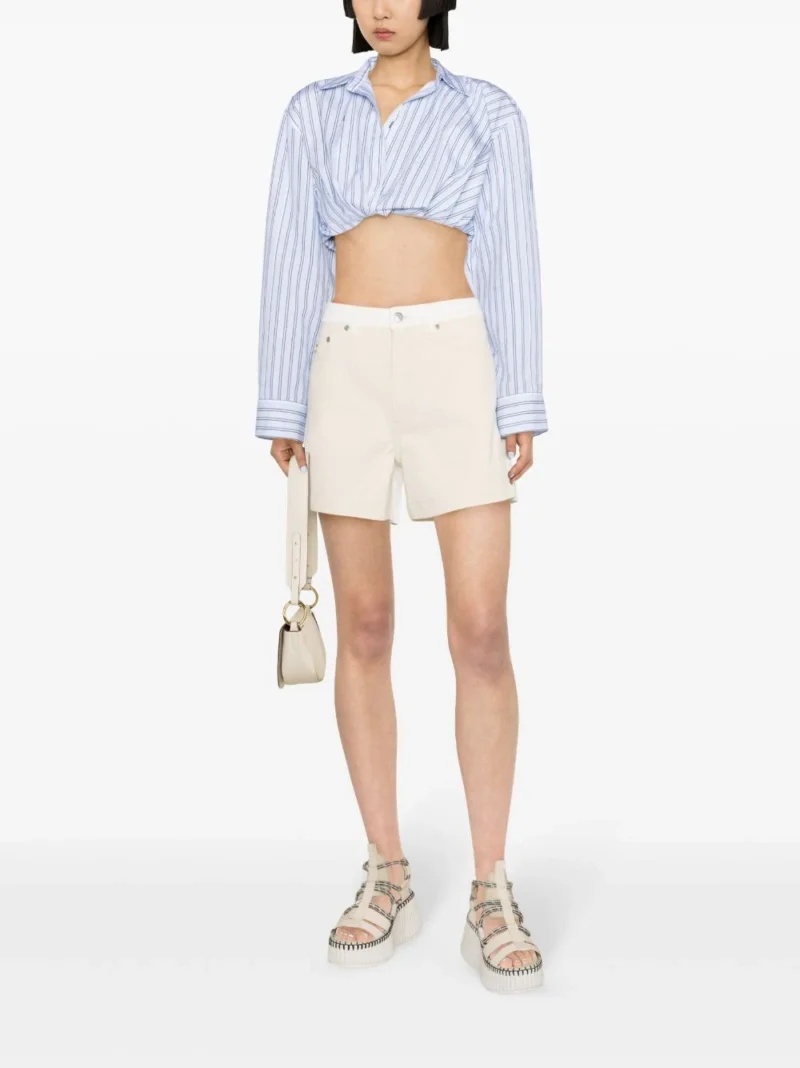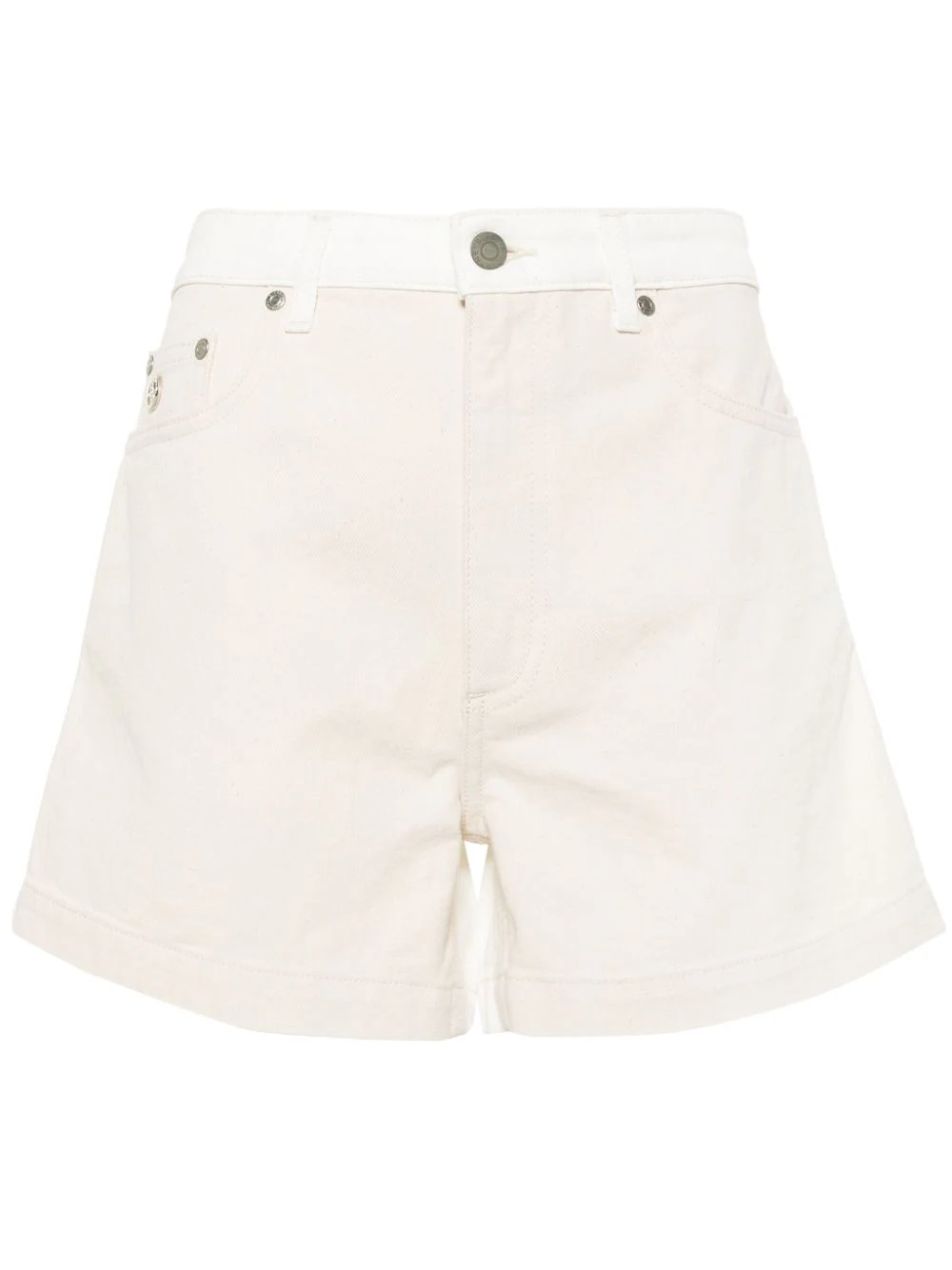 Pantaloni bej din denim, cu talie inalta, inchidere cu nasture si fermoar, croiala „5pockets”, eticheta logo cusuta la spate si tiv drept. Potriviti pentru sezonul primavara/vara. 100% denim; 54% poliester; 46% bumbac.
