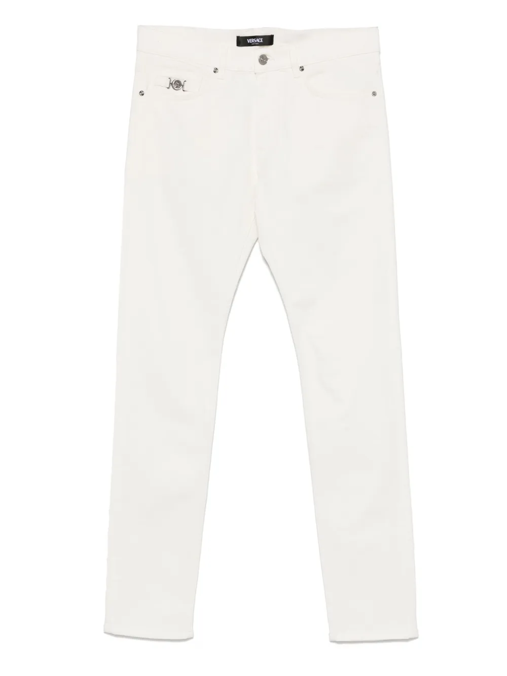 Pantaloni denim Versace Medusa Biggie alb, din bumbac denim, cu inchidere nasture si fermoar, model „5-pockets”, logo metalic Medusa aplicat si tiv drept. Potriviti pentru sezonul toamna/iarna. 1% spandex; 100% piele de vitel; 99% bumbac.