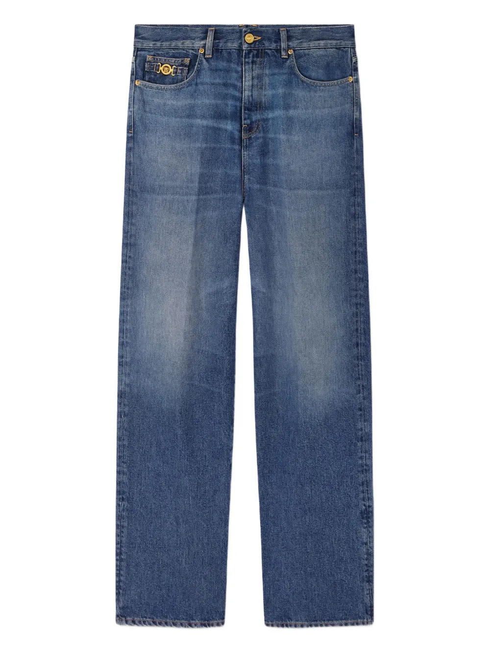 Pantaloni denim Versace Medusa Biggie albastru, cu talie inalta, inchidere cu nasture si fermoar, model „5-pockets”, logo metalic Medusa aplicat, eticheta din piele Versace cusuta la spate si tiv drept. Potriviti pentru sezonul toamna/iarna. 100% bumbac denim.