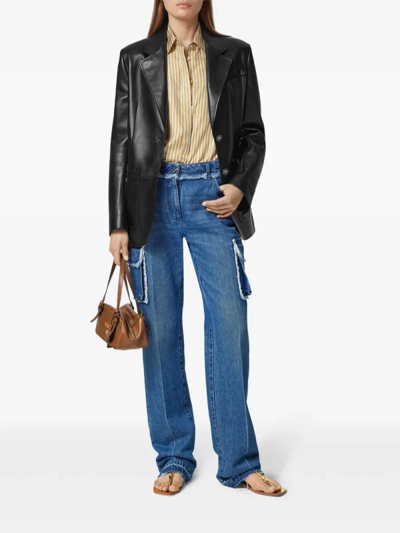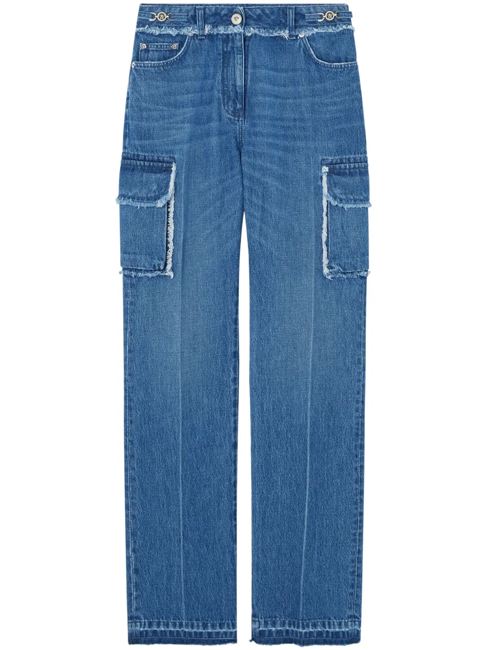 Pantaloni denim Versace Medusa-Plaque Cargo albastru, din bumbac denim, cu inchidere nasture si fermoar, model „5-pockets” si buzunare aplicate lateral, talie decorata cu franjuri, eticheta cu logo Versace cusuta la spate si tiv cu aspect uzat. Potriviti pentru sezonul primavara/vara. 100% textil.