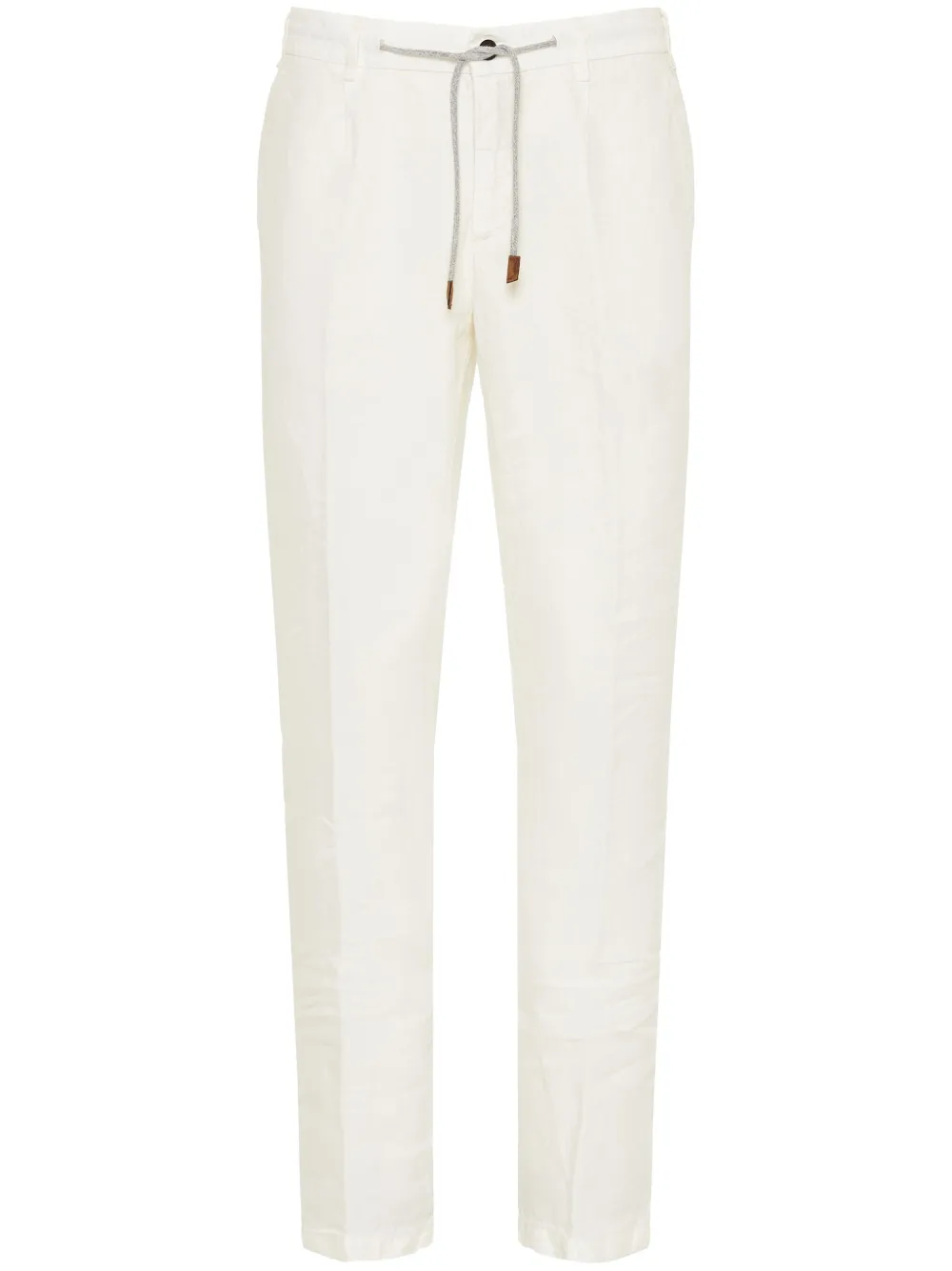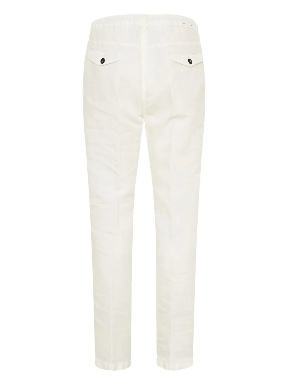 Pantaloni Eleventy Drawstring Tapered alb, din in, cu inchidere nasture si fermoar, buzunare laterale, buzunare la spate cu clapeta, dunga verticala, snur textil in jurul taliei si tiv drept. Potriviti pentru sezonul primavara/vara. 100% in.