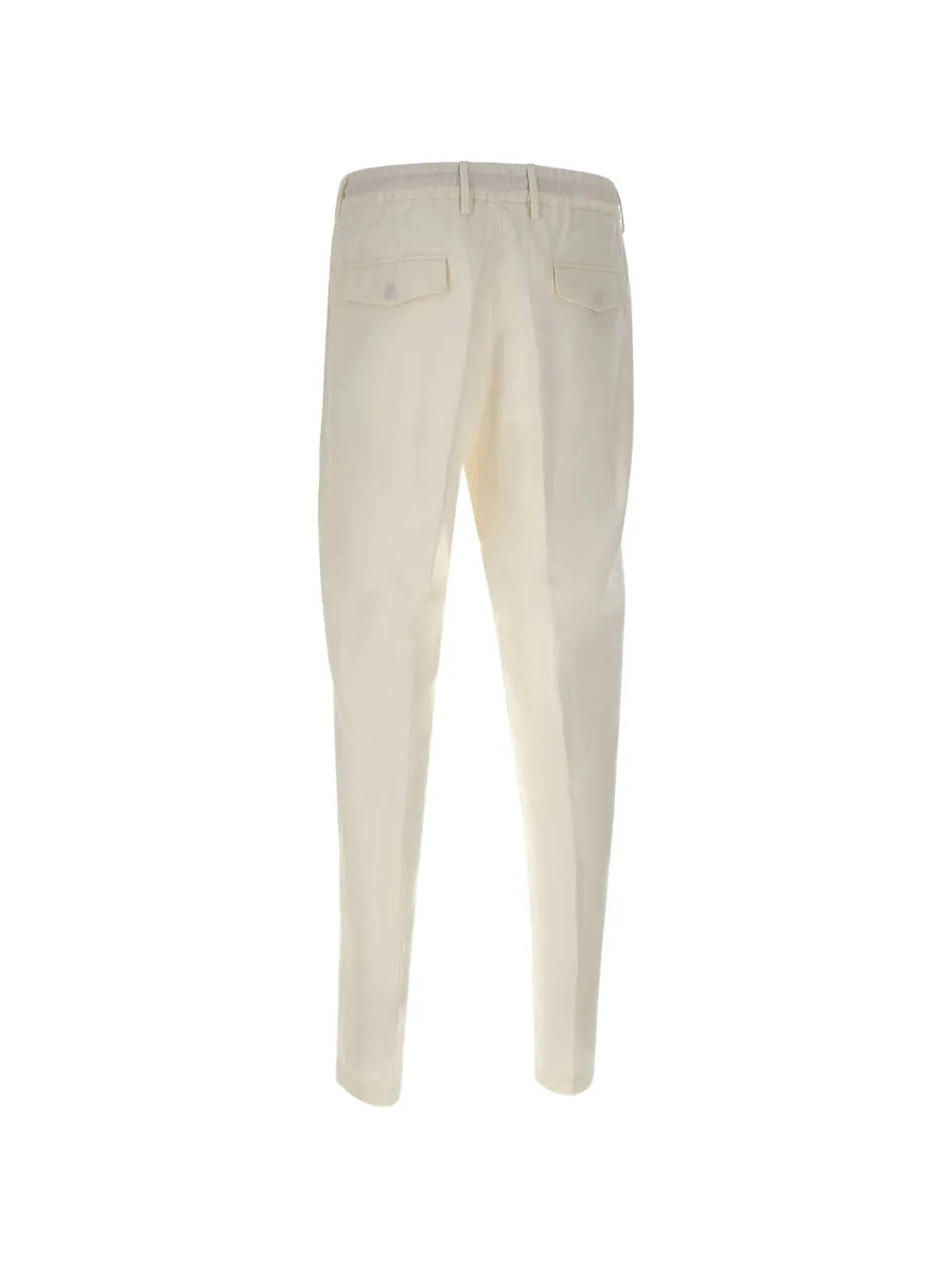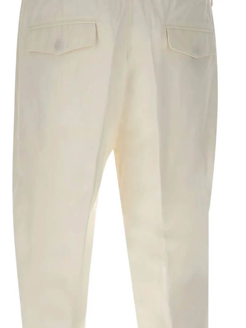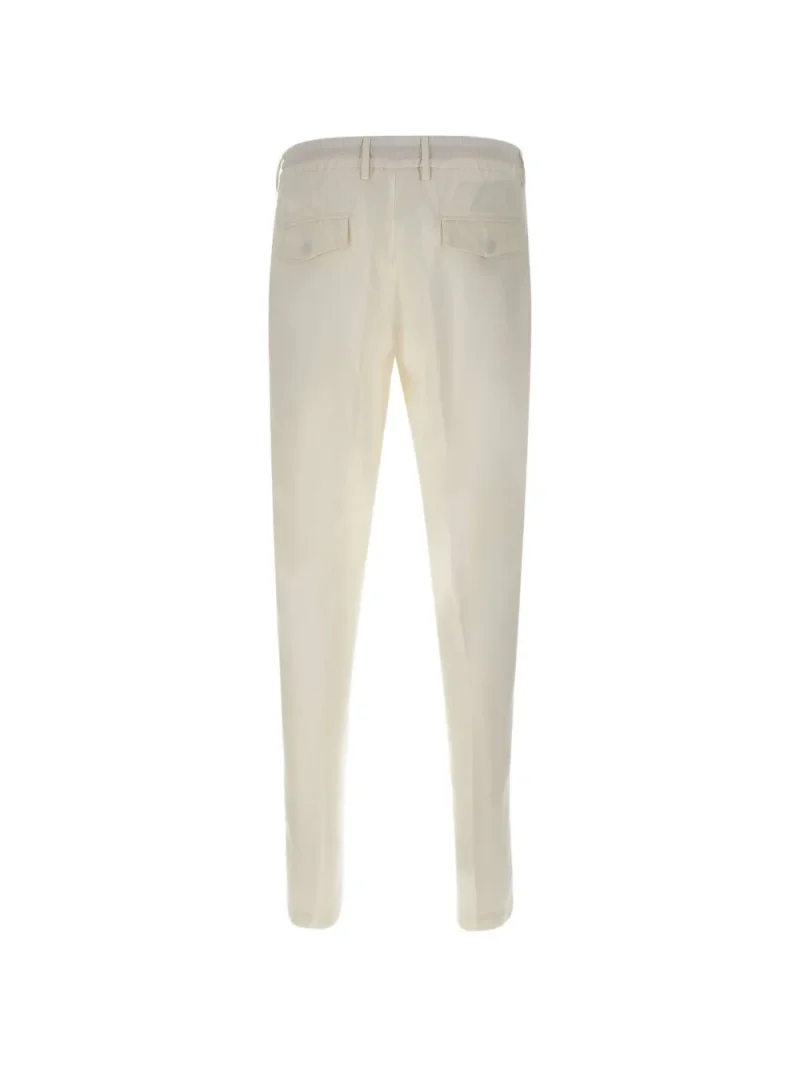 Pantaloni Eleventy Drawstring Flap alb, cu inchidere nasture si fermoar, buzunare laterale, snur textil in jurul taliei si tiv drept. Potriviti pentru sezonul primavara/vara. 68% lioncell; 32% in.