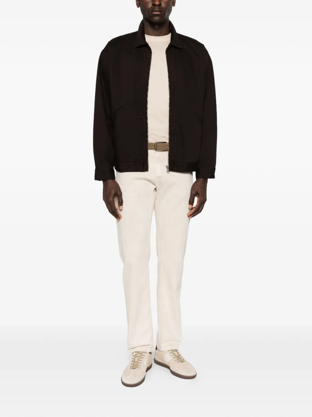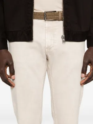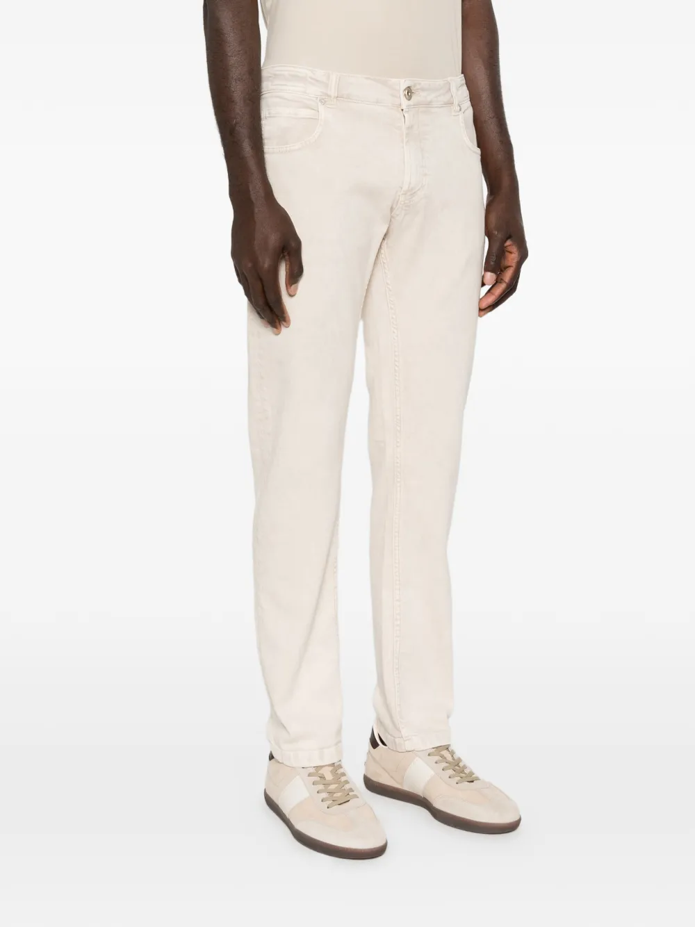 Pantaloni Eleventy Five-Pocket bej, realizati din bumbac premium, cu inchidere nasture gravat si fermoar, talie joasa, model „5-pockets”, găici pentru curea, tesatura twill, croiala slim fit si tiv drept. Potriviti pentru sezonul primavara/vara. 98% bumbac; 2% elastan.