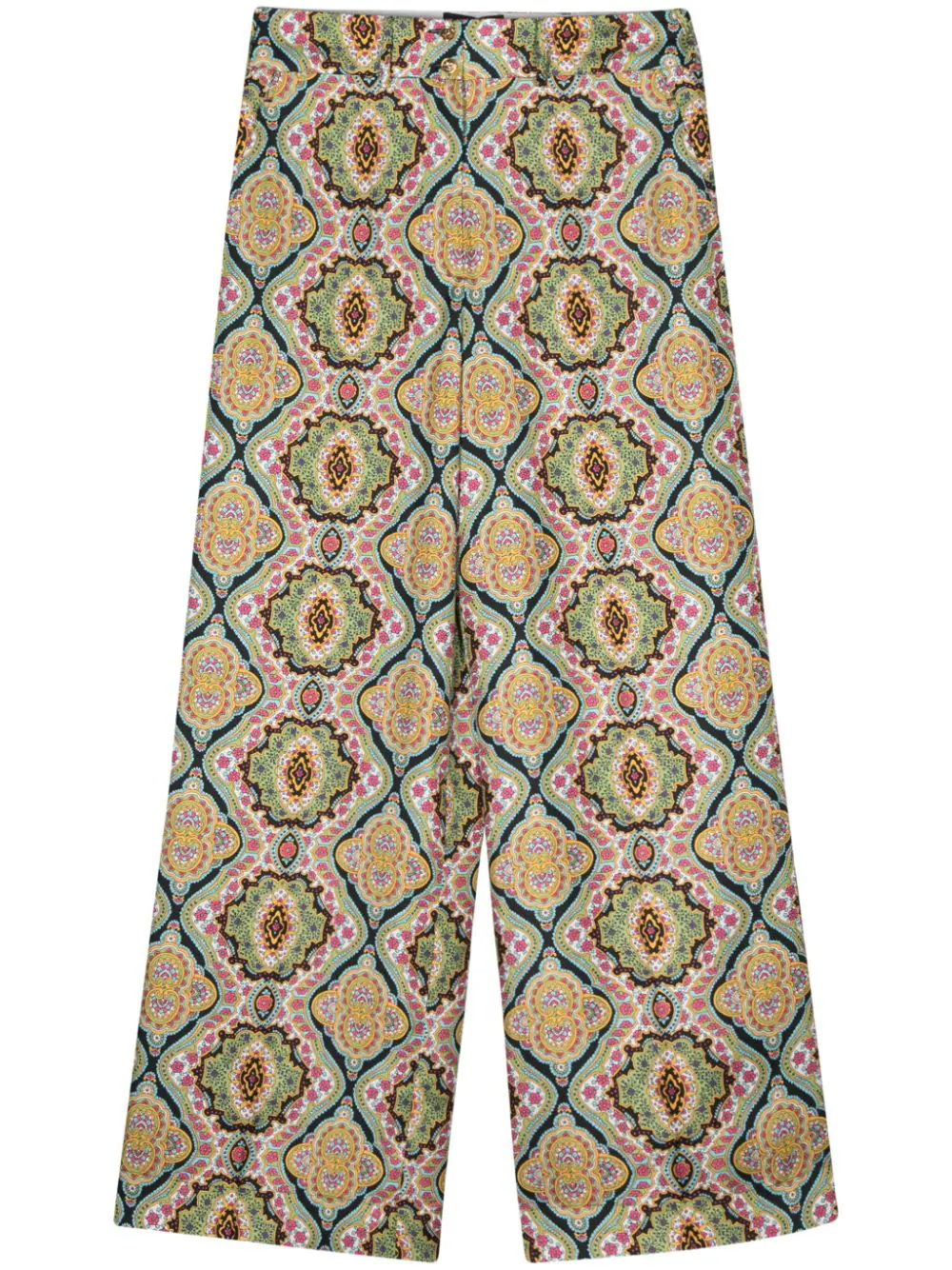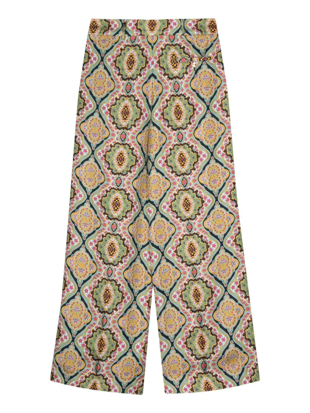 Pantaloni multicolor din matase, wide fit, cu talie inalta, inchidere cu banda elastica, model Paisley pe toata suprafata si tiv drept. Potrivit pentru sezonul primavara/vara. 100% matase.