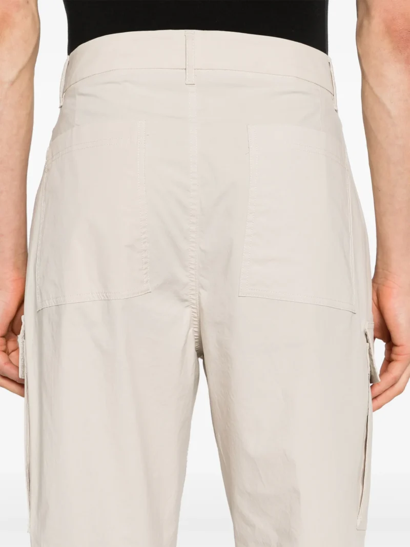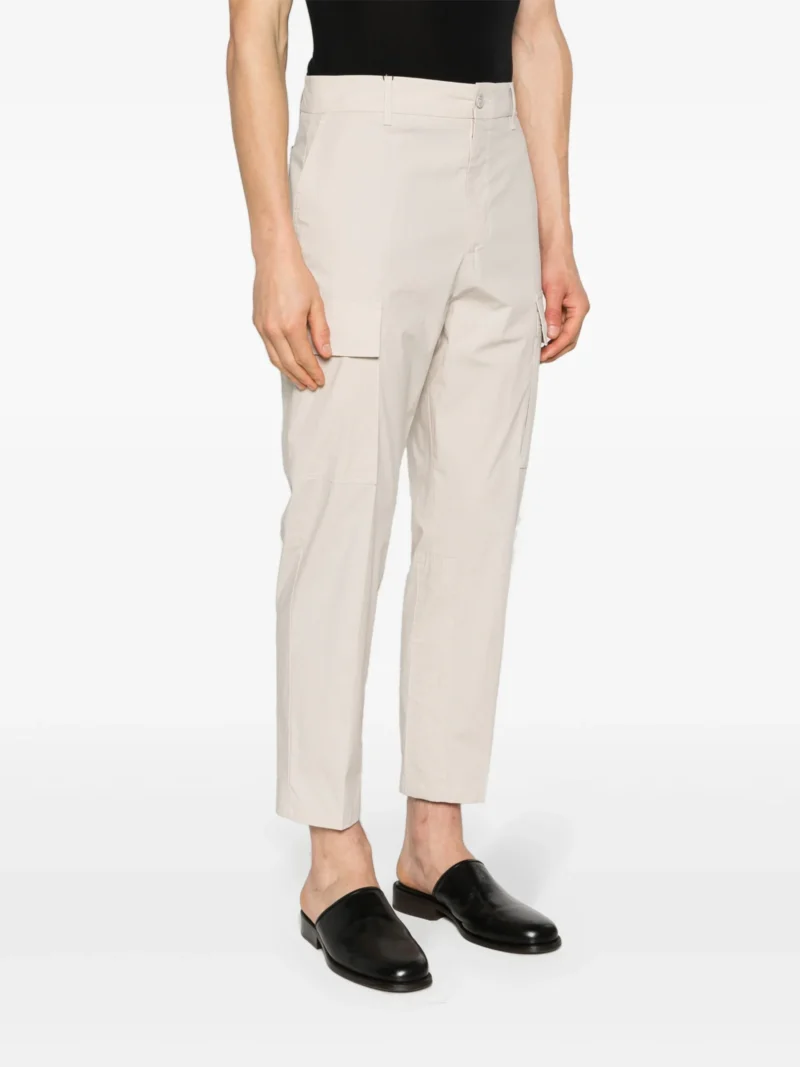 Pantaloni bej din bumbac, fit conic, cu inchidere nasture si fermoar, buzunare laterale, buzunare la spate, buzunare tip cargo si tiv drept. Potriviti pentru sezonul primavara/vara. 96% bumbac; 4% elastan.