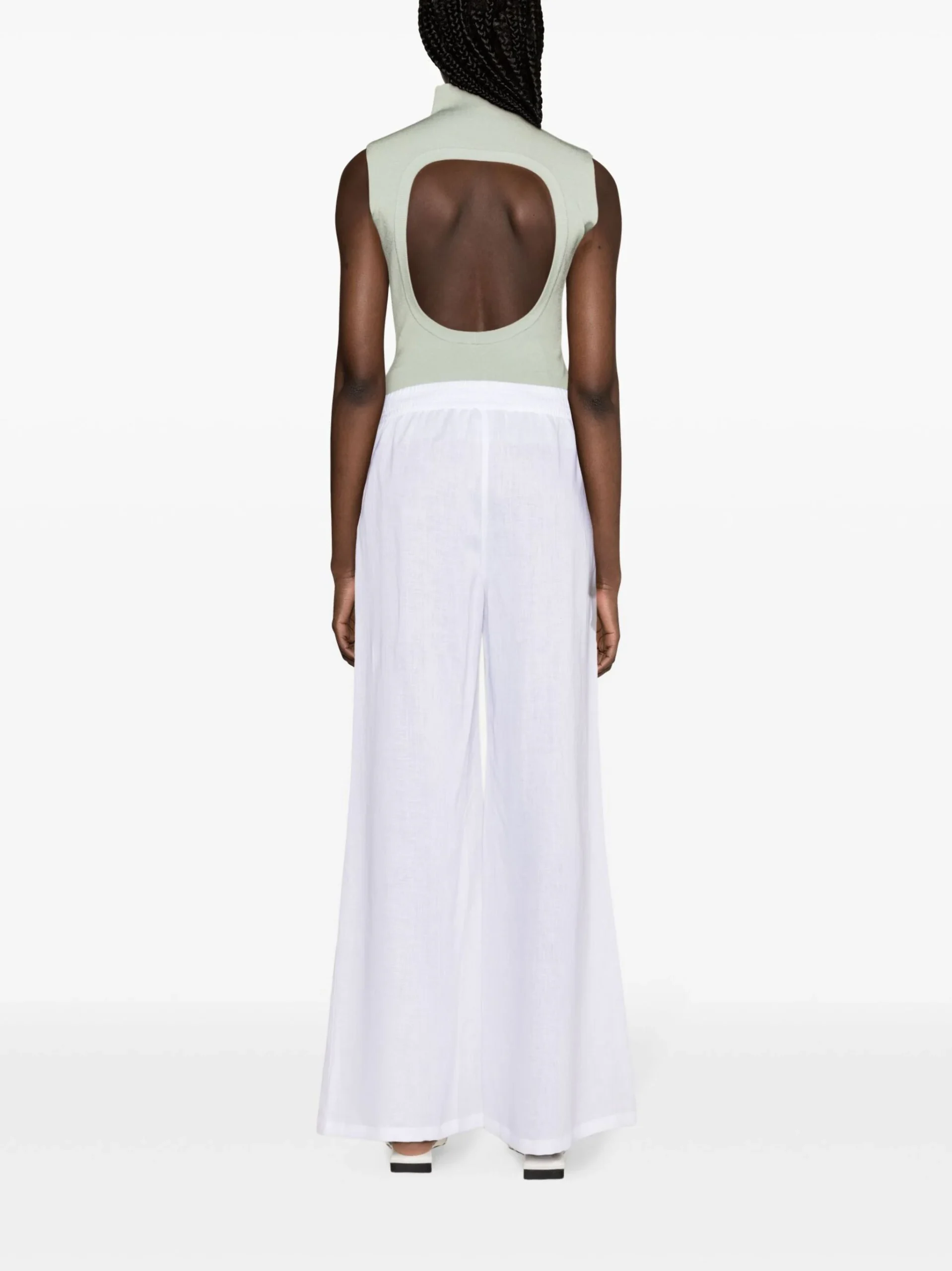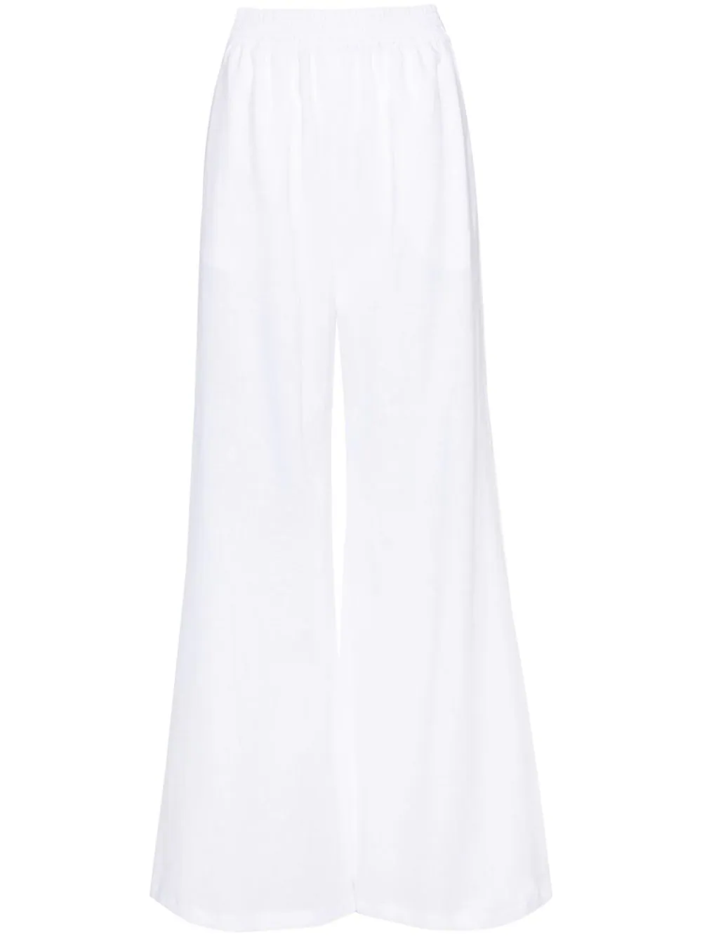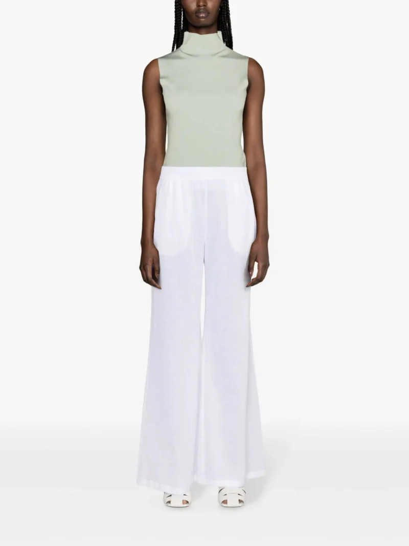 Pantaloni albi din in, cu fit larg, inchidere cu banda elastica in talie, buzunare laterale, tesatura semi-transparenta, captuseala partiala din bumbac si tiv drept. Potriviti pentru sezonul primavara/vara. 100% bumbac; 100% in.