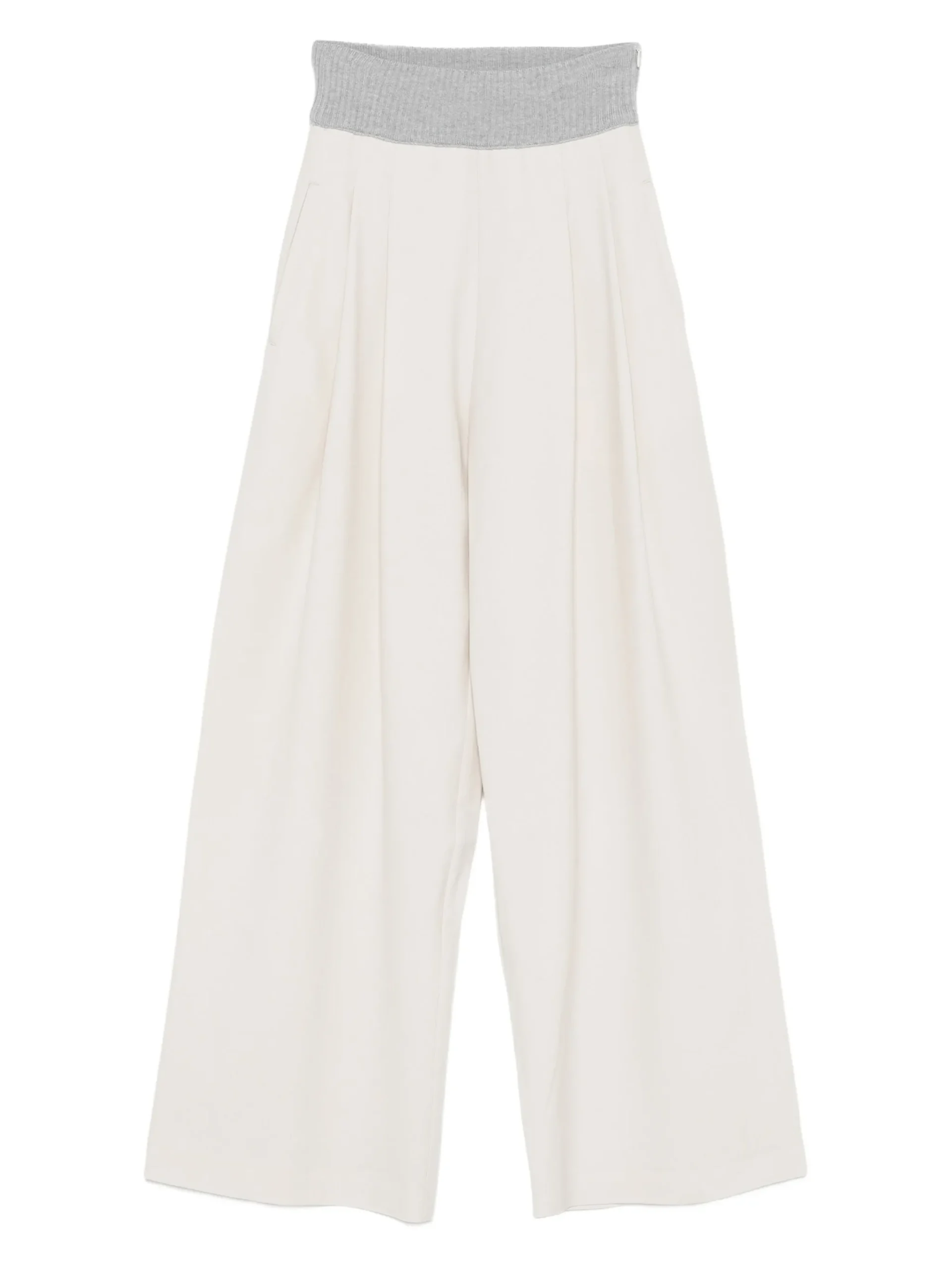 Pantaloni Gran Sasso off-white cu talie elastica ribbed pentru un plus de confort si croiala lejera, pense discrete, buzunare laterale si un design modern, usor de integrat in tinute casual sau smart-casual. 53% poliester 43% lana 3% elastan