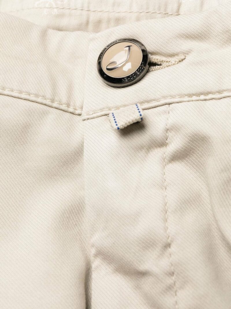 Pantaloni bej din bumbac si lyocell, slim fit, cu inchidere nasture si fermoar, croiala tip chino, eticheta emblema Jacob Cohen cusuta la spate si tiv drept. Potriviti pentru sezonul primavara/vara. Detalii: Model- Bobby; Slim Fit; Talie medie; Tiv- 18 cm; Cusatura interior- 86 cm. 55% bumbac; 42% lyocell; 3% elastan.