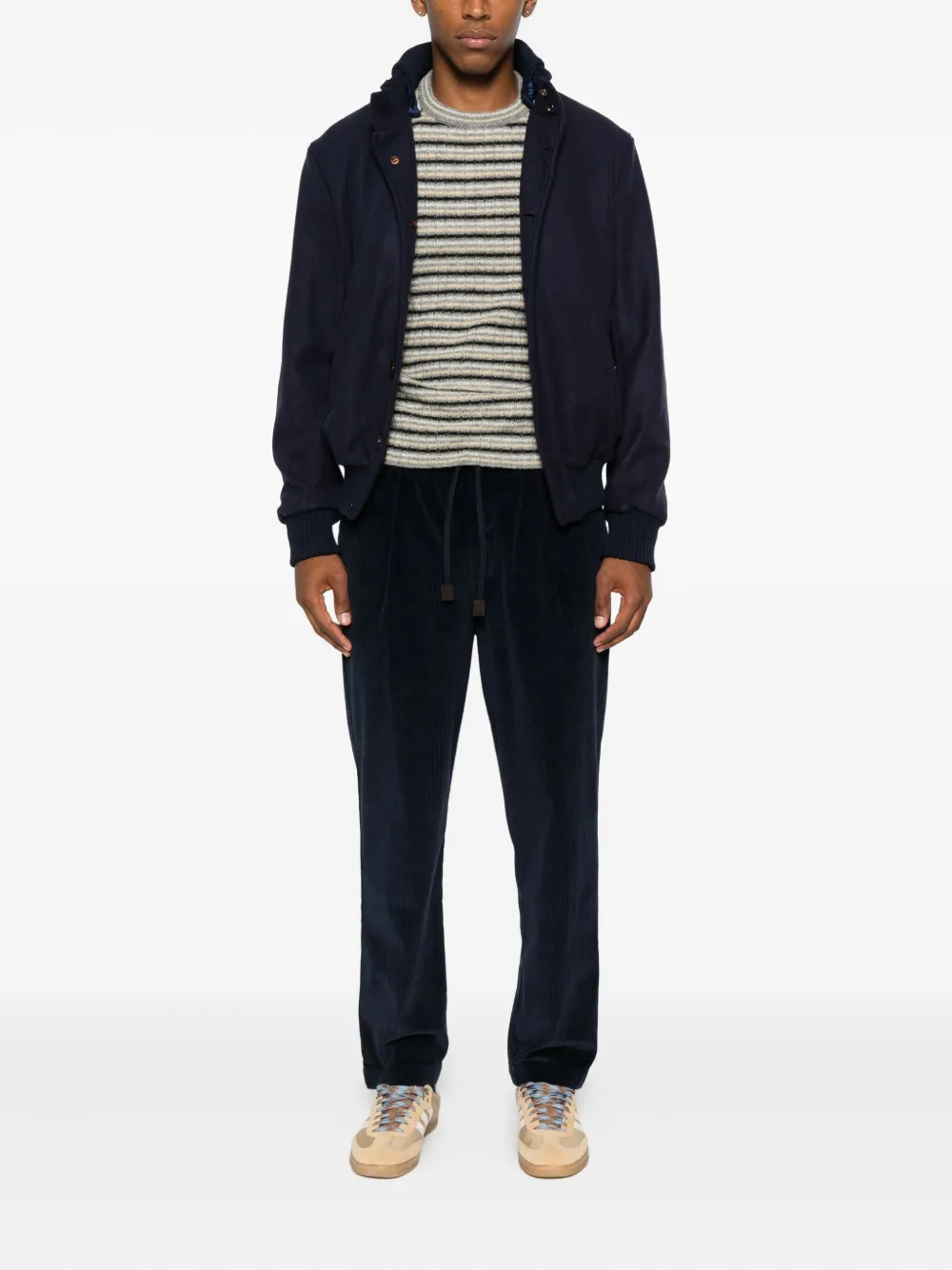 Pantaloni Jacob Cohen Drawstring Corduroy bleumarin, din bumbac velur, cu talie elastica si inchidere snur, pliuri decorative, buzunare laterale si welt, logo patch si tiv drept. Potriviti pentru sezonul toamna/iarna. 94% bumbac; 1% elastan; 5% casmir.