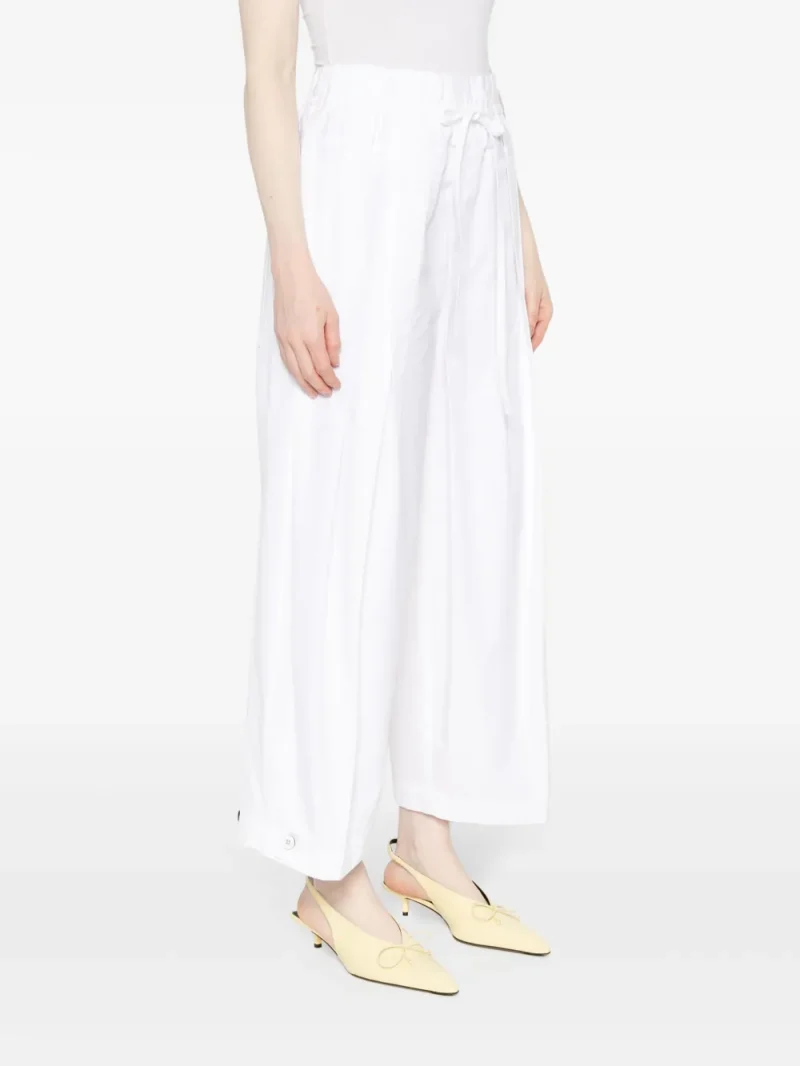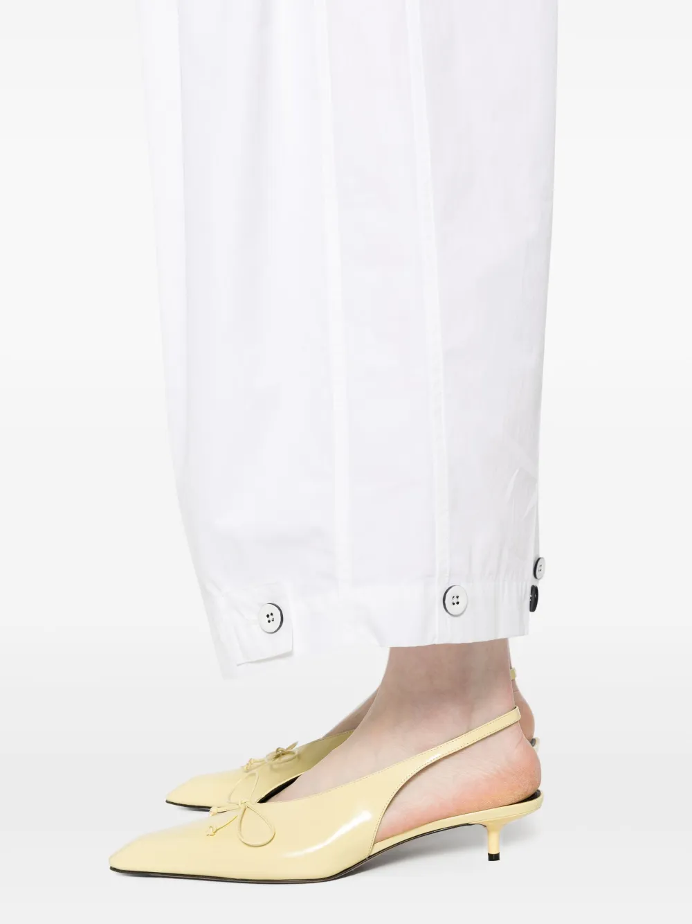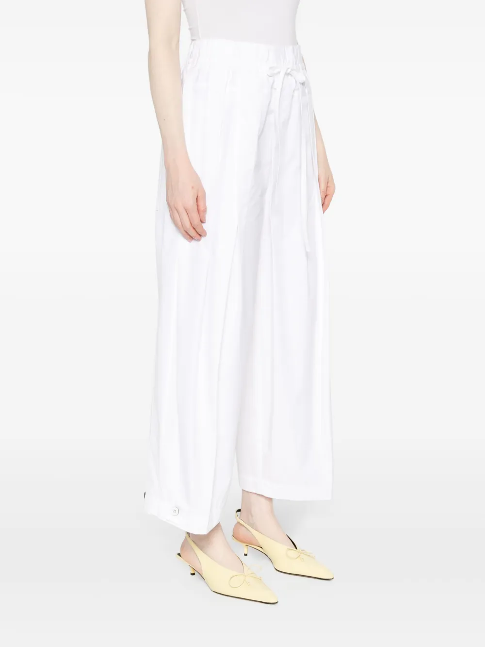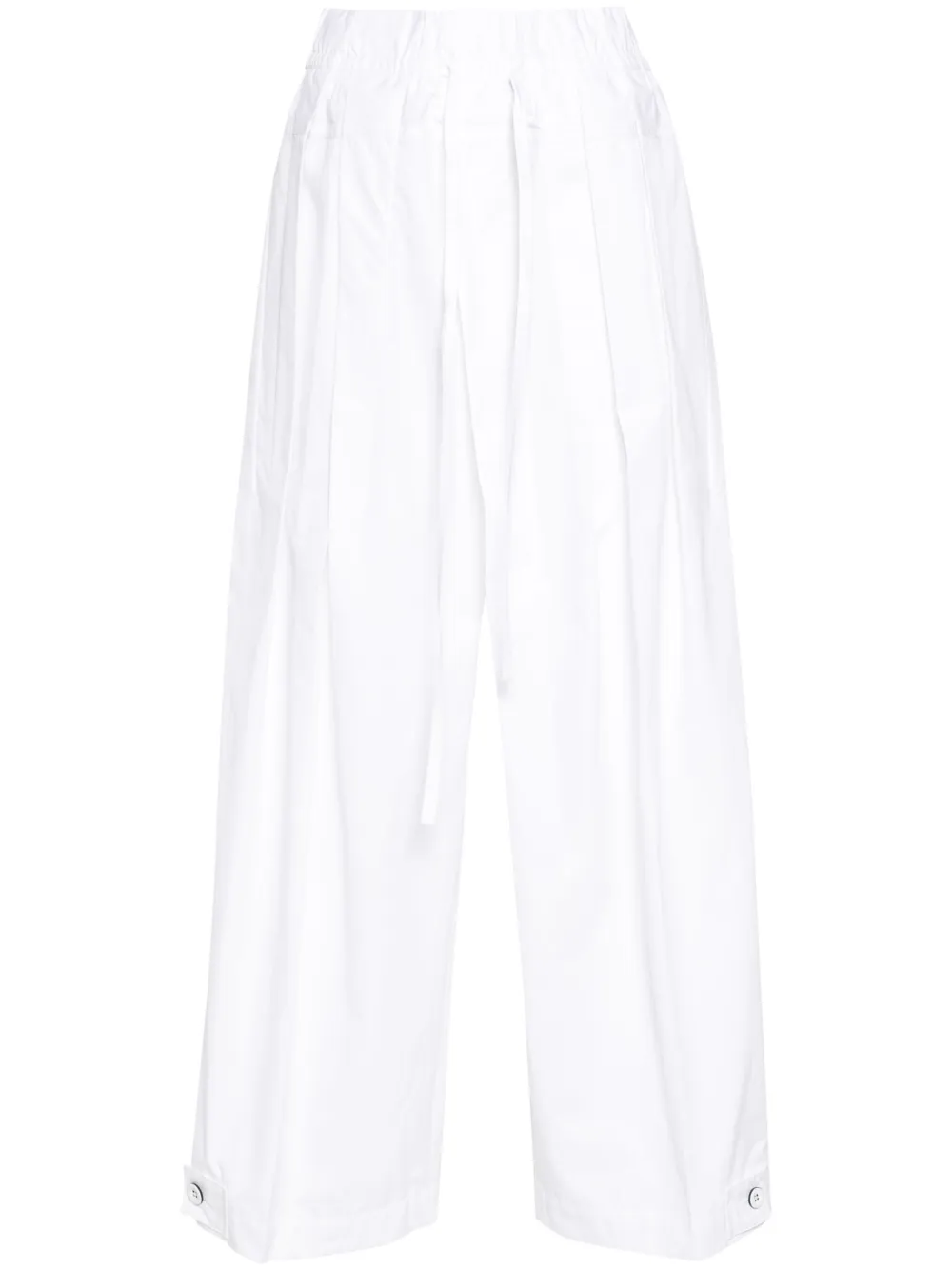 Pantaloni JIL SANDER Poplin Cotton alb, wide-fit, din bumbac, cu inchidere clasic, talie elastica si snur, pliuri late decorative, buzunare late la spate si tiv drept cu inchidere nasturi. Potriviti pentru sezonul toamna/iarna. 100% bumbac organic.