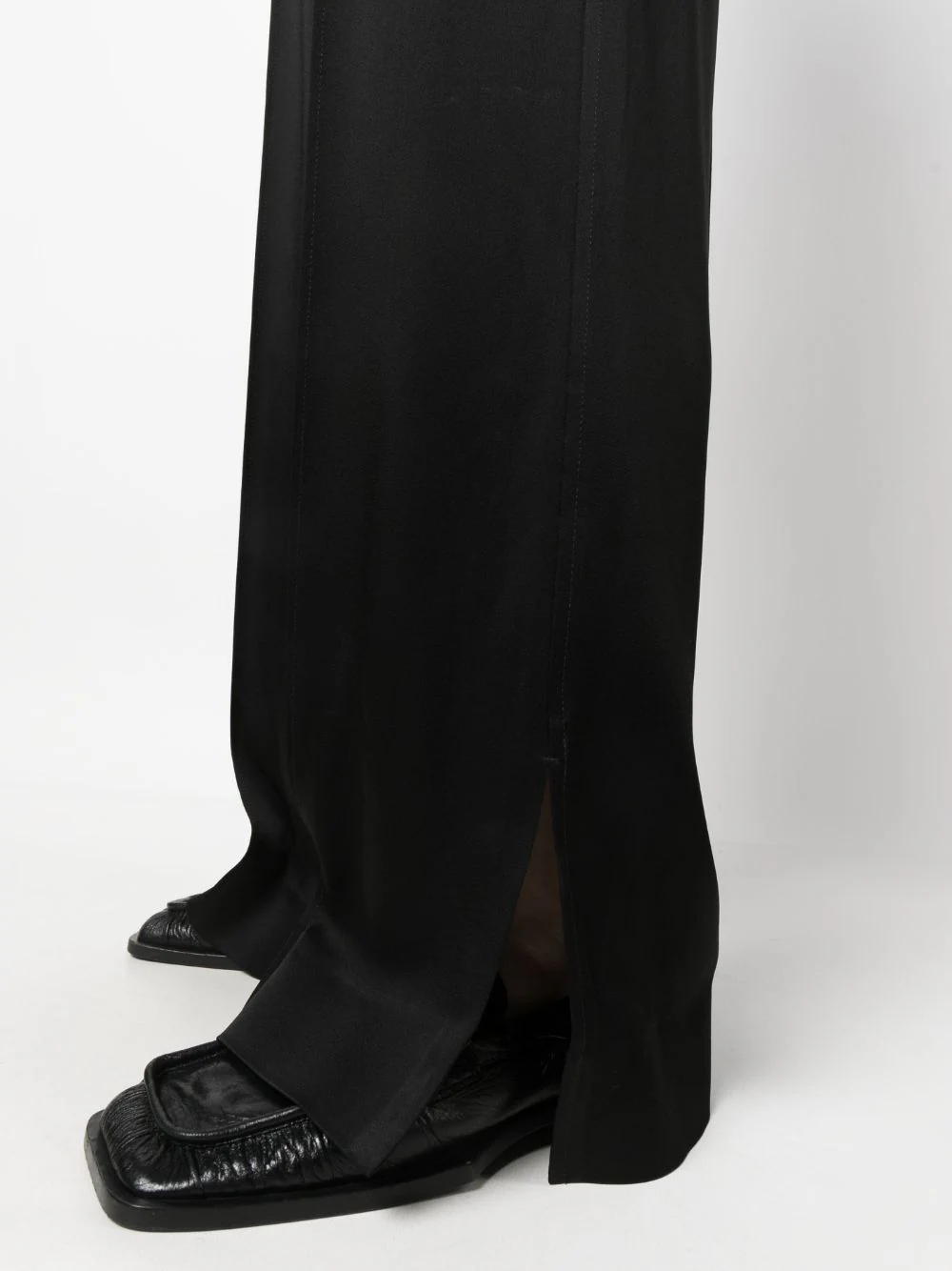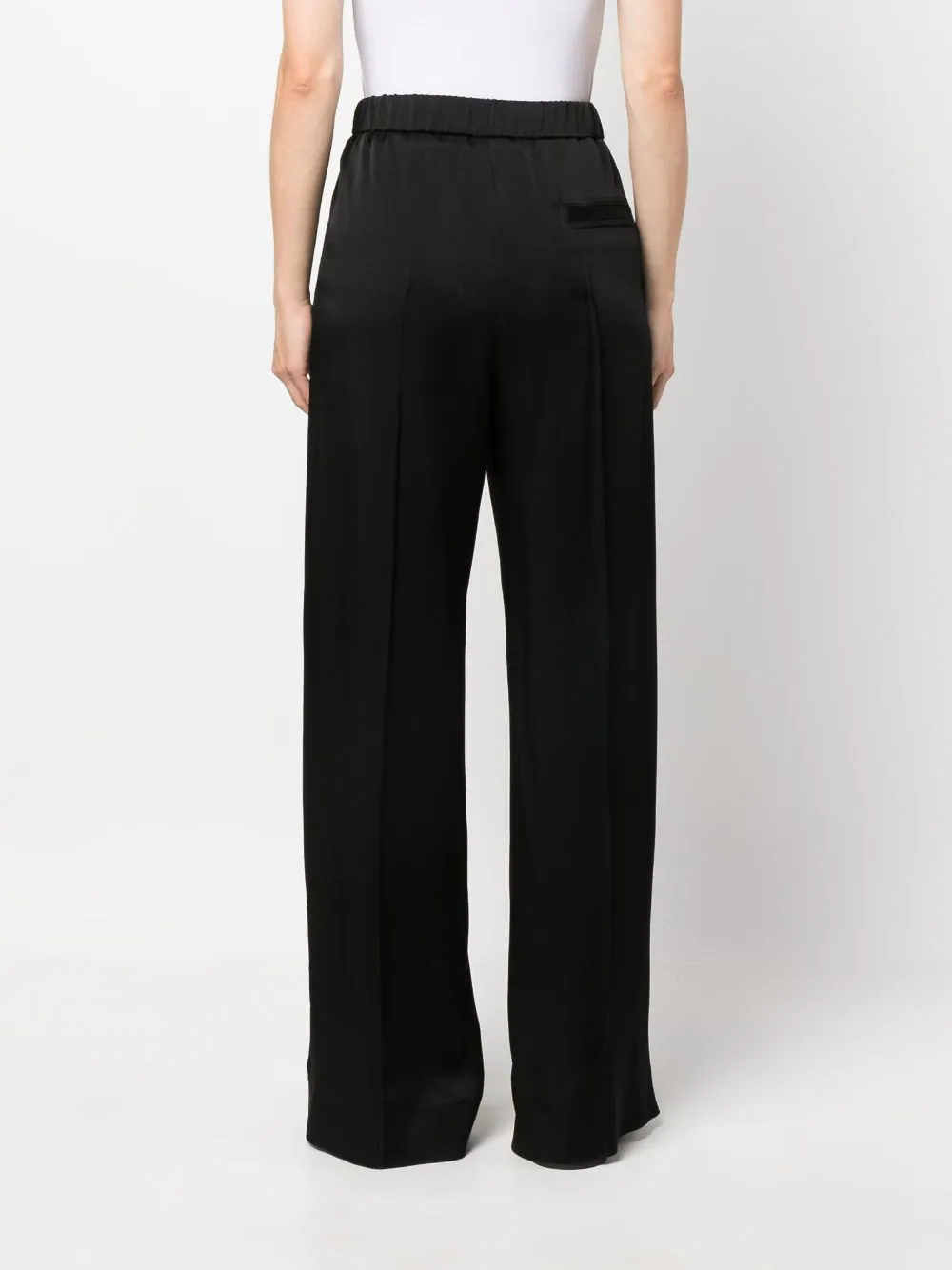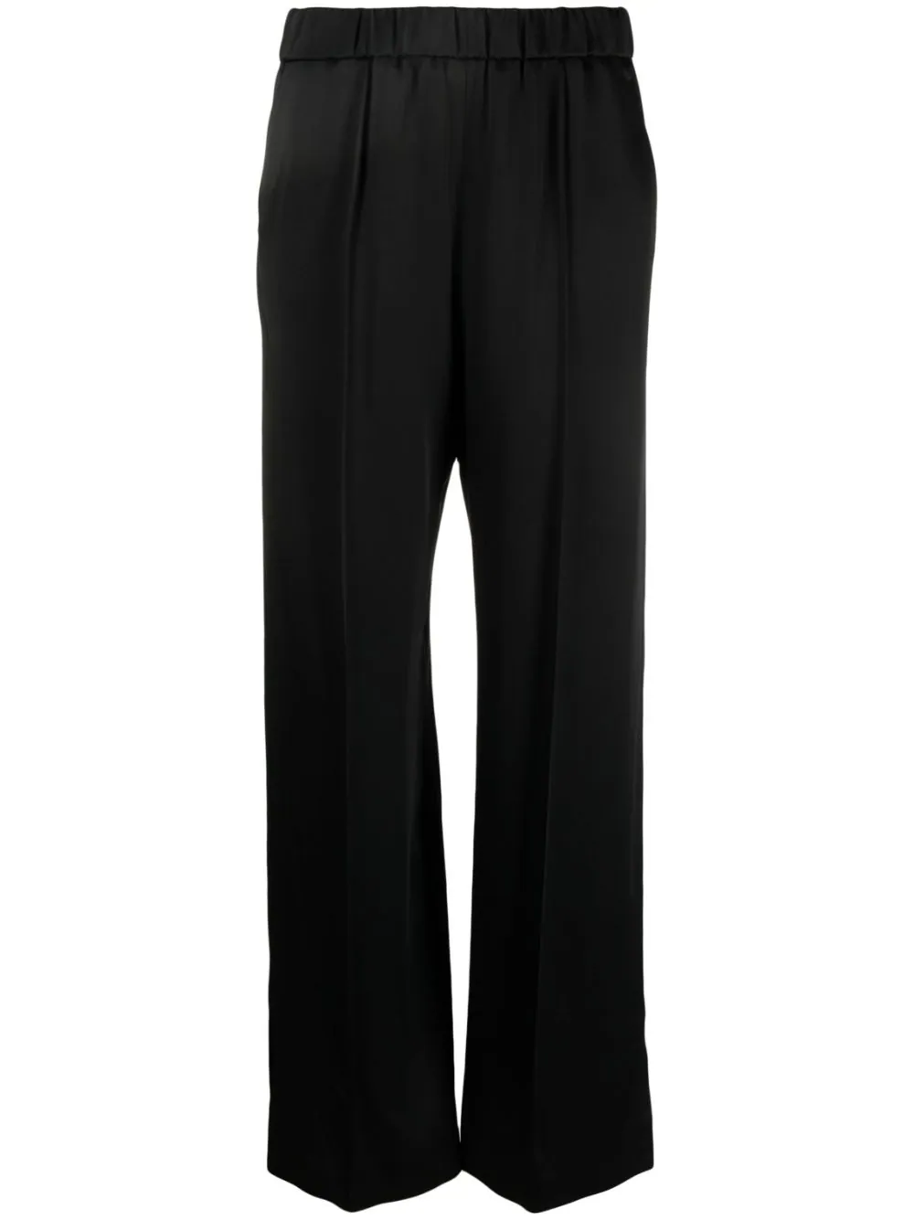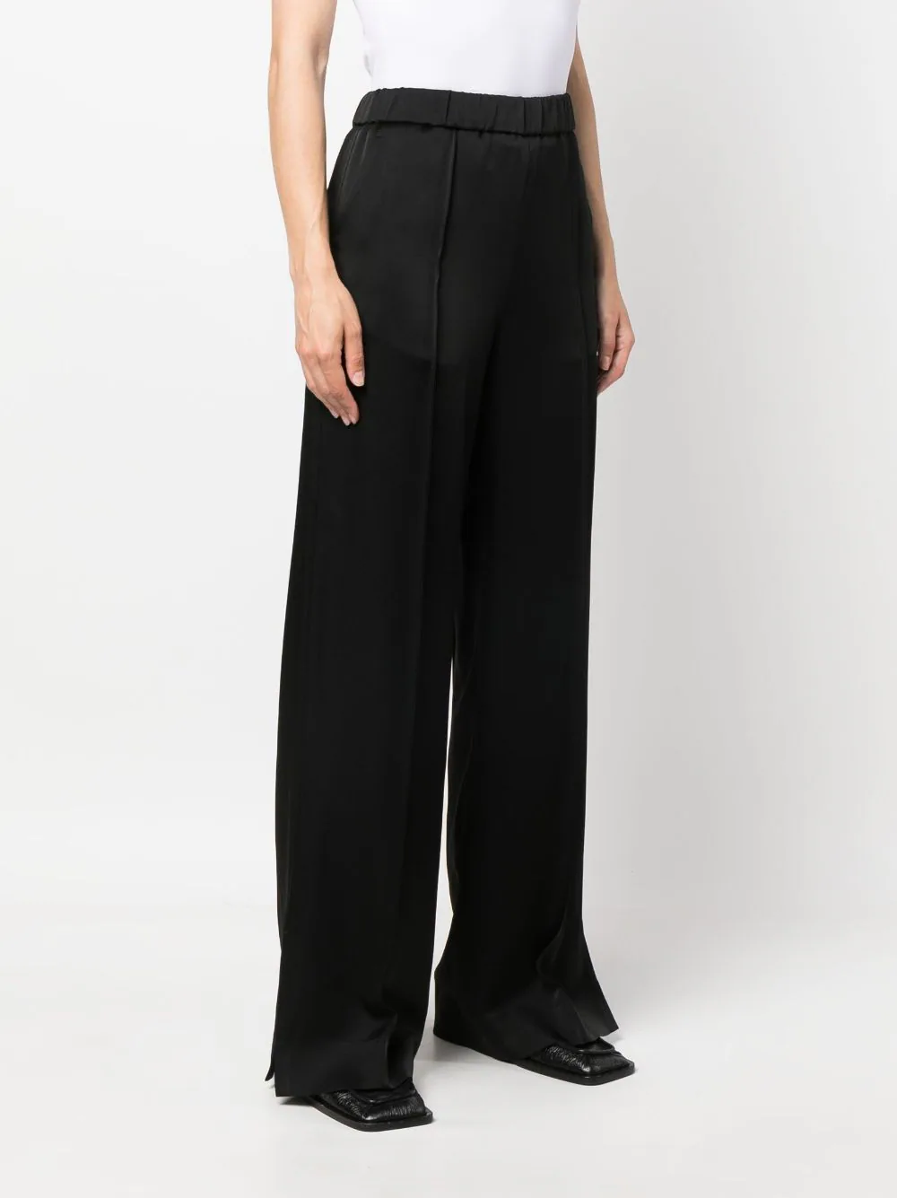 Pantaloni negri din satin, cu fit relaxat, banda elastica in talie si snur pentru ajustare, buzunare oblice, buzunar pe partea din spate, slituri laterale si croiala larga pe picior. Potriviti pentru sezonul primavara/vara. 74% acetat; 26% viscoza.