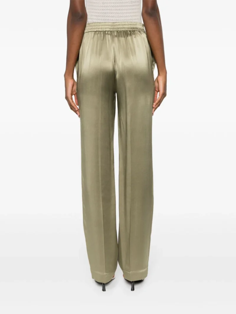 Pantaloni verzi din matase satinata, cu talie medie, elastica, buzunare laterale si croiala dreapta. Potriviti pentru sezonul primavara/vara. 100% matase.