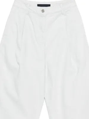 Pantaloni Juun.J Button Pleated albastru, balloon fit, realizati din bumbac denim, cu inchidere nasture si fermoar, buzunare laterale si welt la spate, pliuri pe partea din fata si tiv drept. Potrivit pentru sezonul primavara/vara. 100% bumbac.