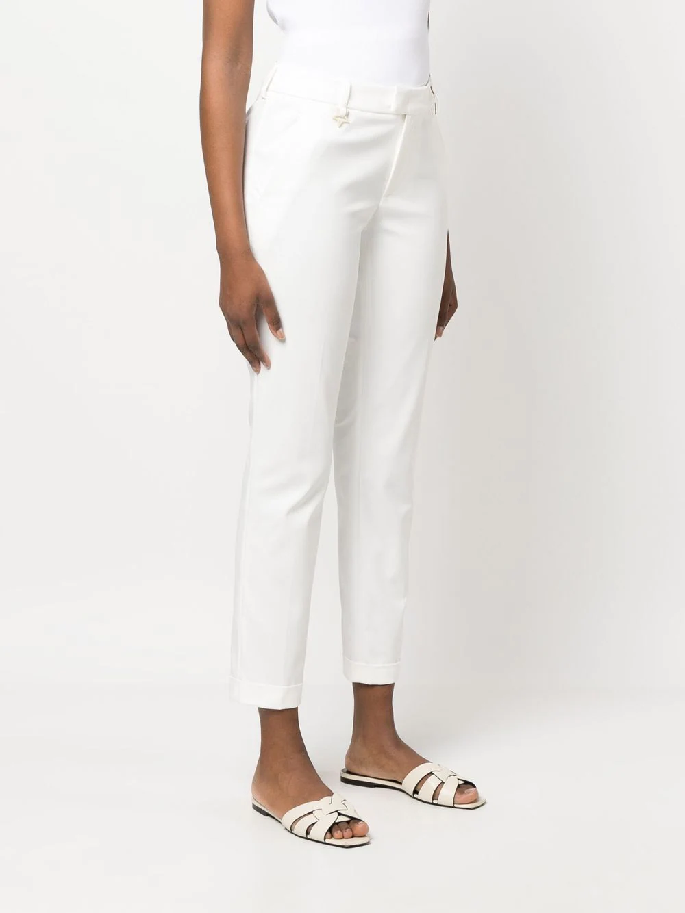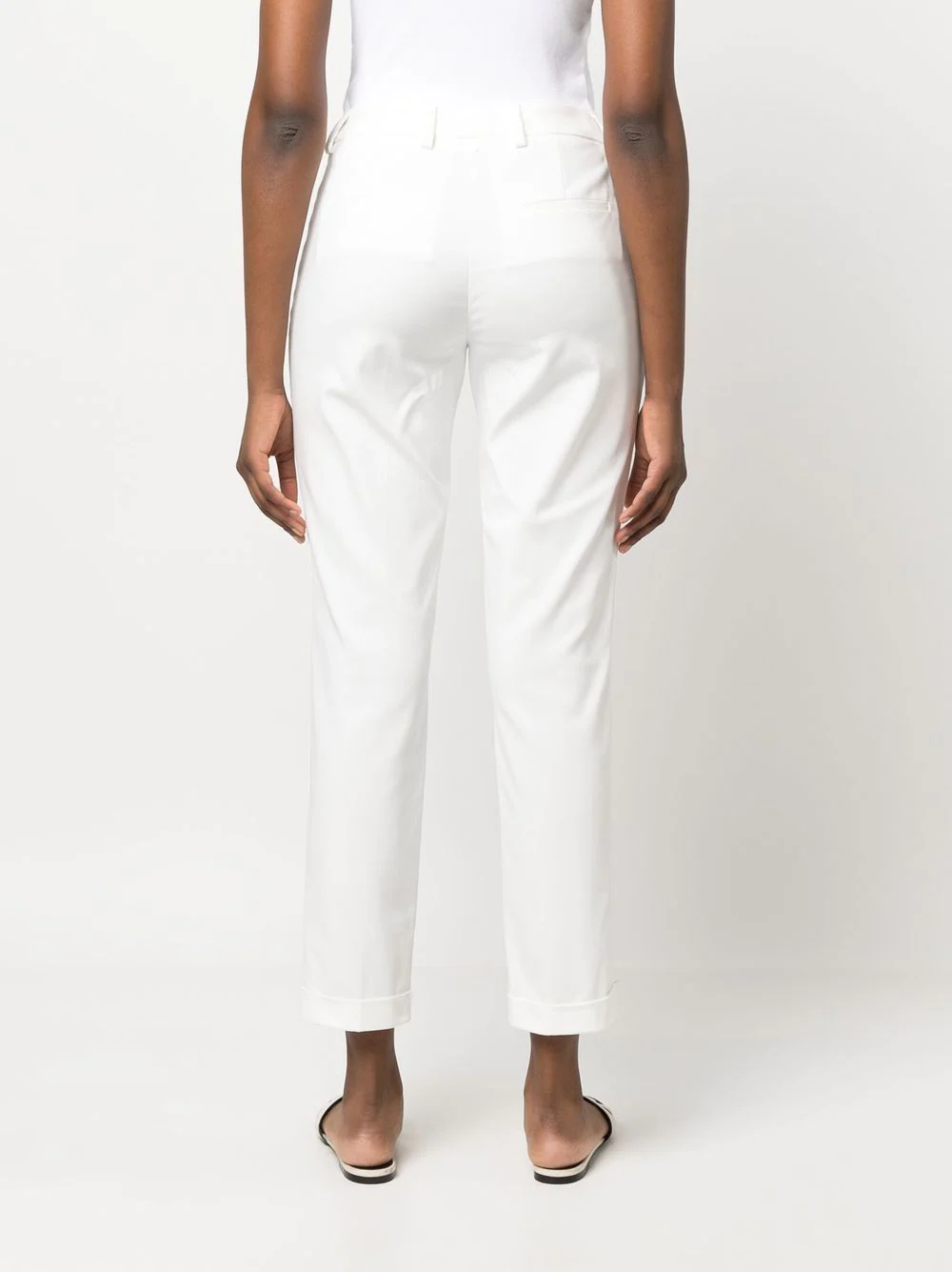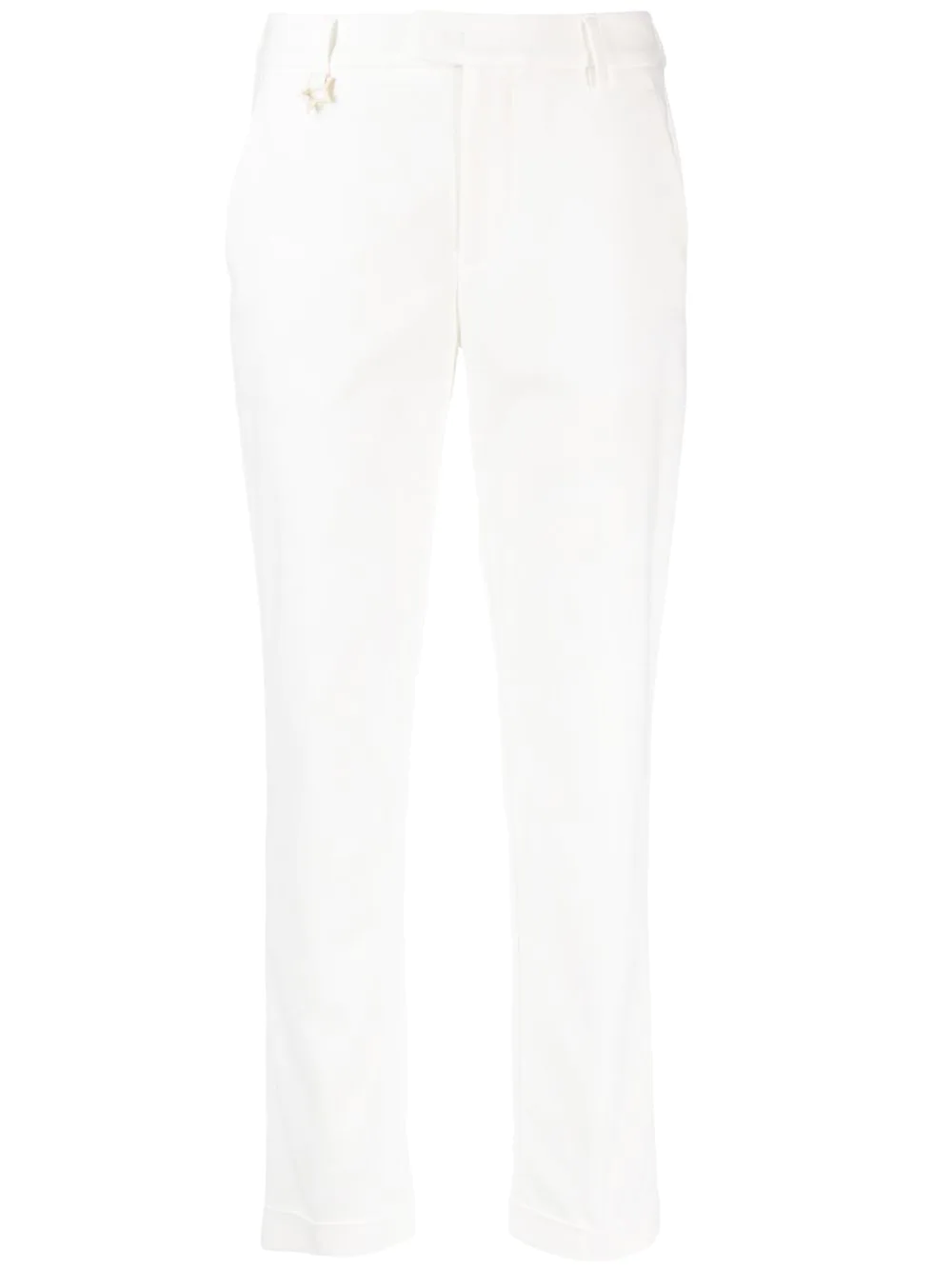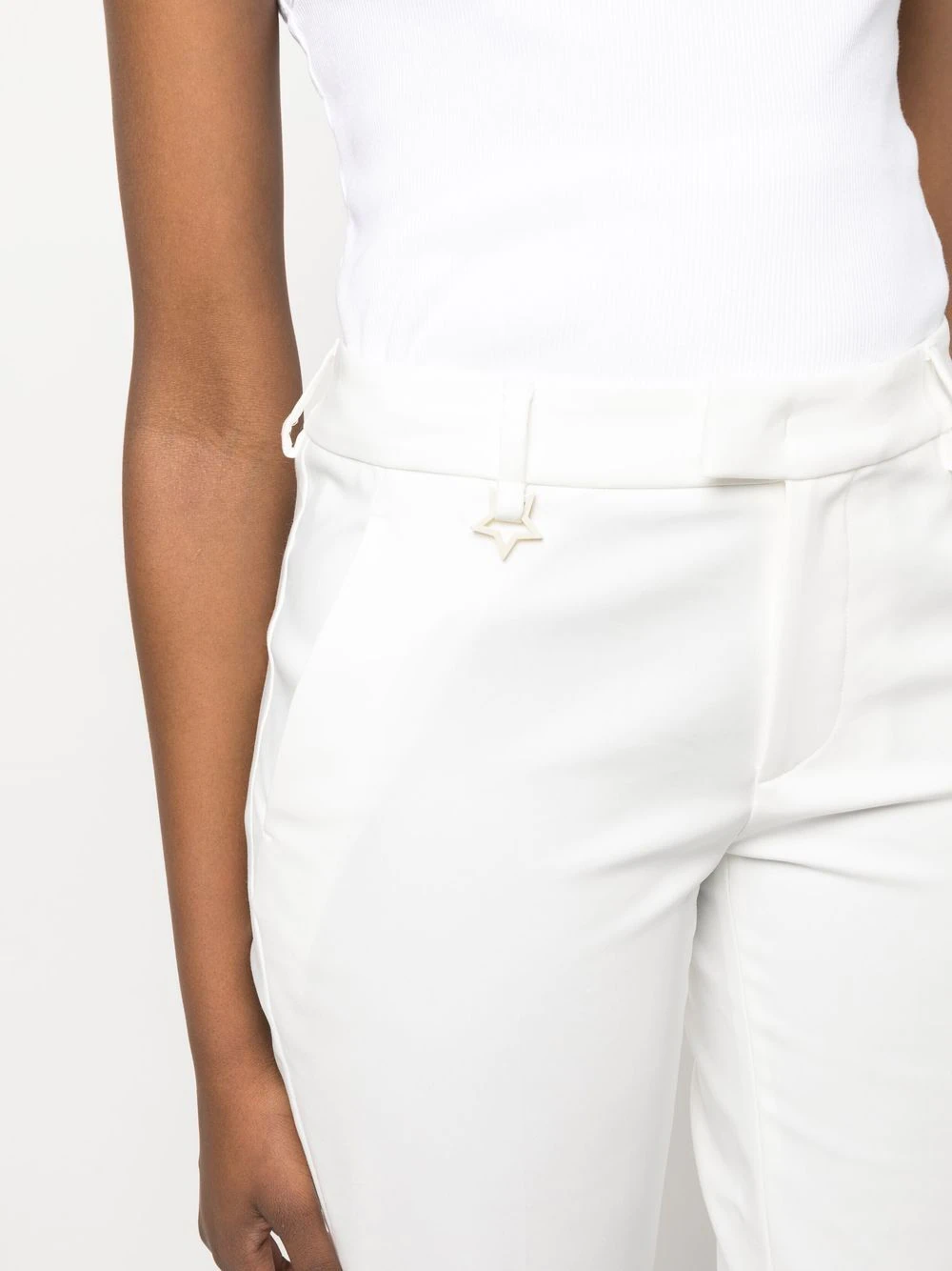 Pantaloni albi din bumbac si poliamida, cu talie inalta si inchidere clasica, accesoriu logo Lorena Antoniazzi Star, buzunare laterale, buzunare la spate, captuseala din acetat si tiv drept. Potriviti pentru sezonul primavara/vara. 63% bumbac; 31% poliamida; 3% elastan; 62% acetat; 38% poliester.
