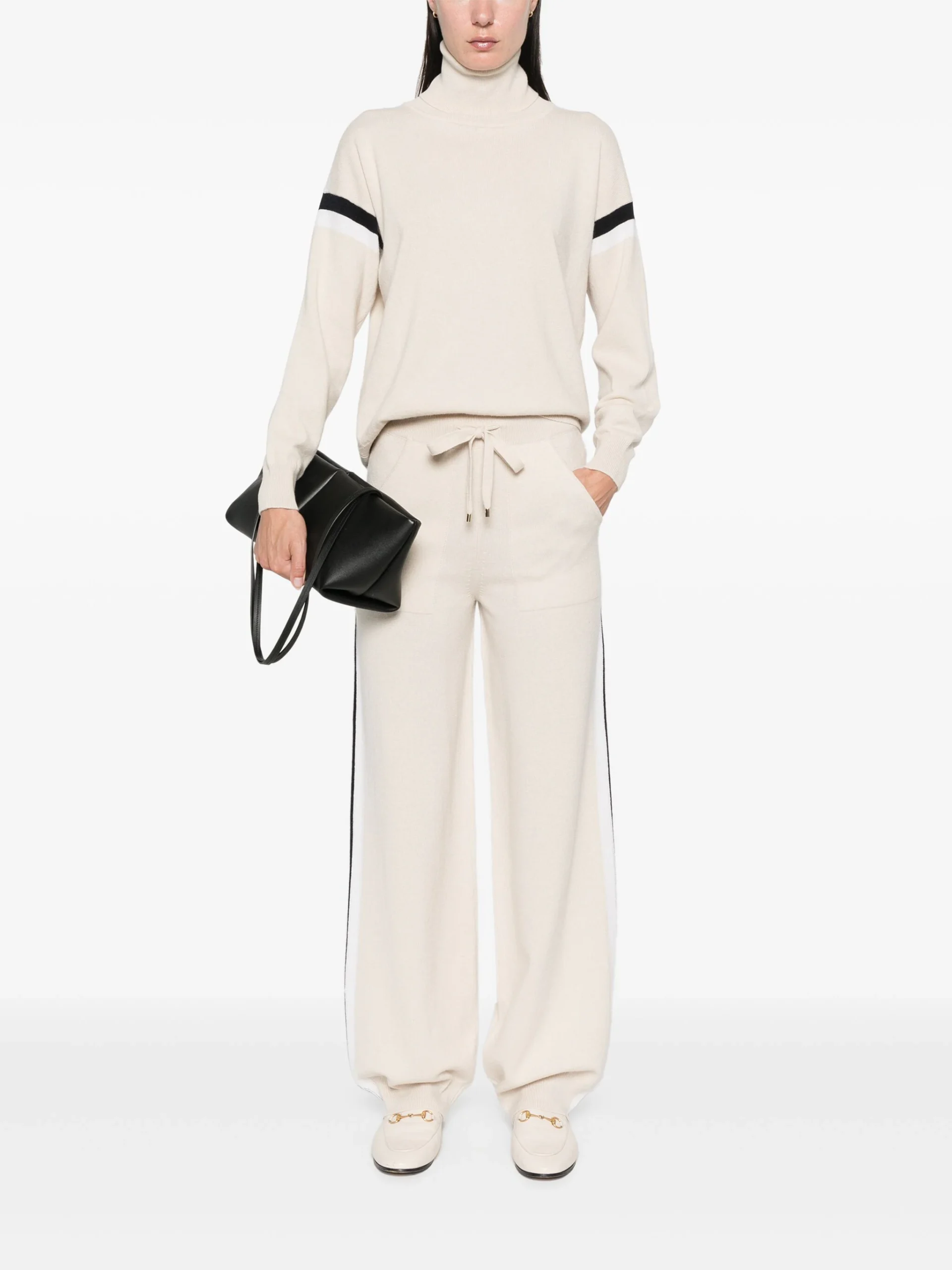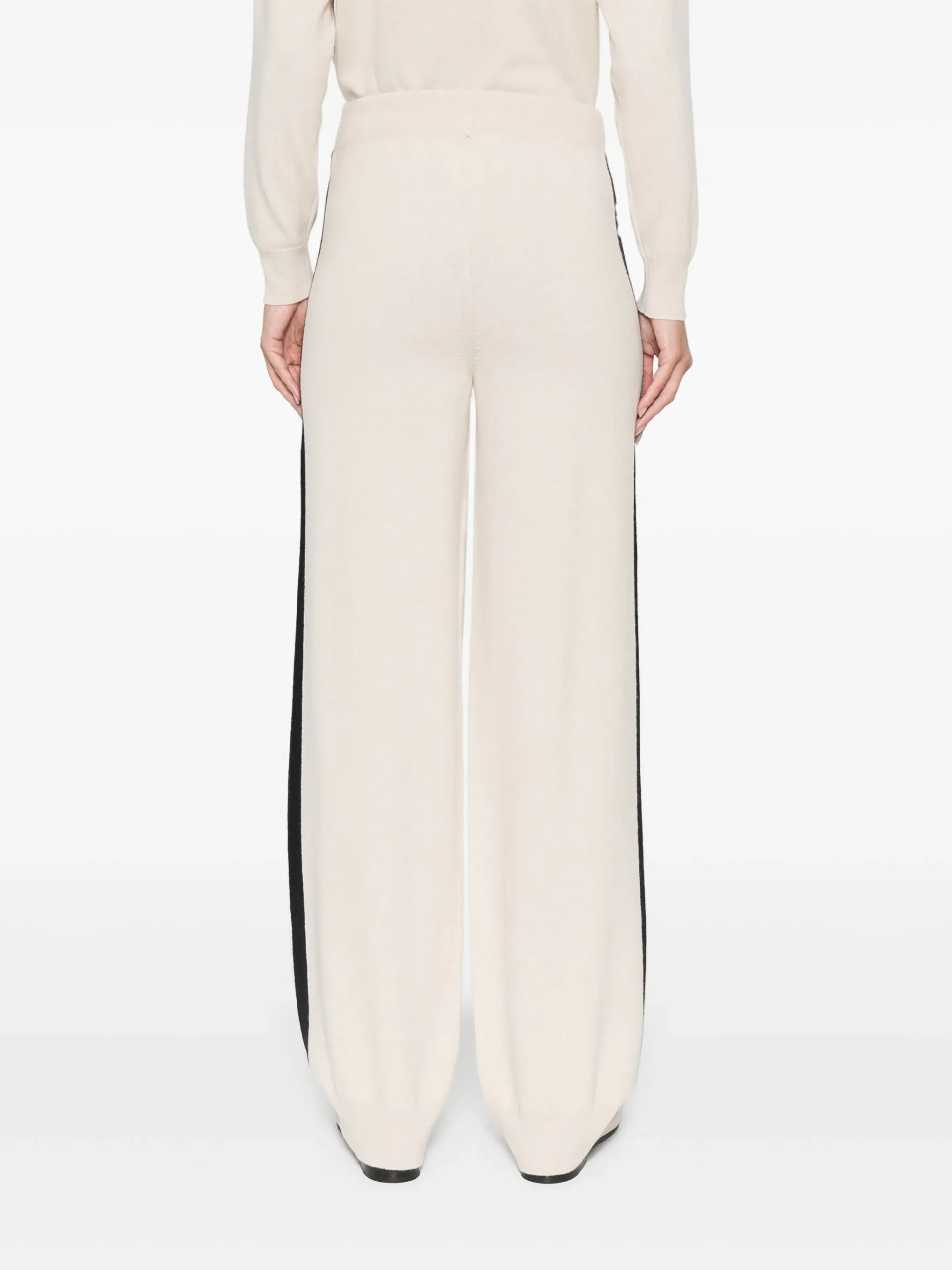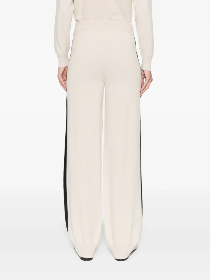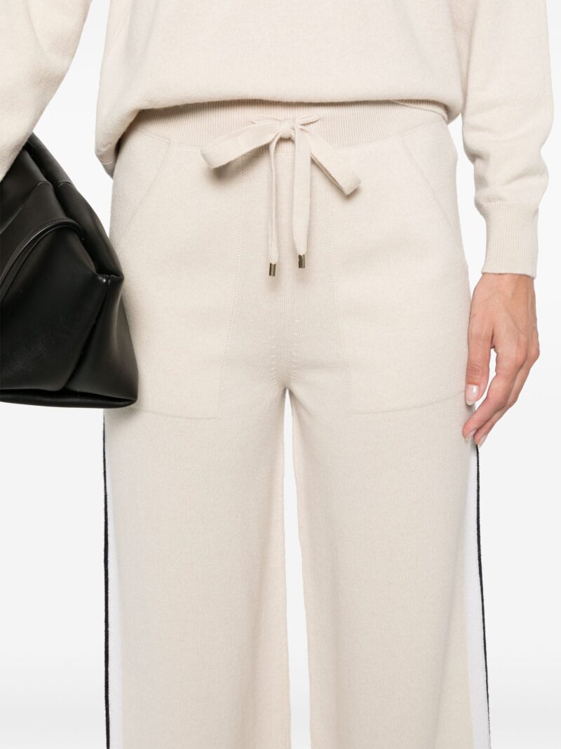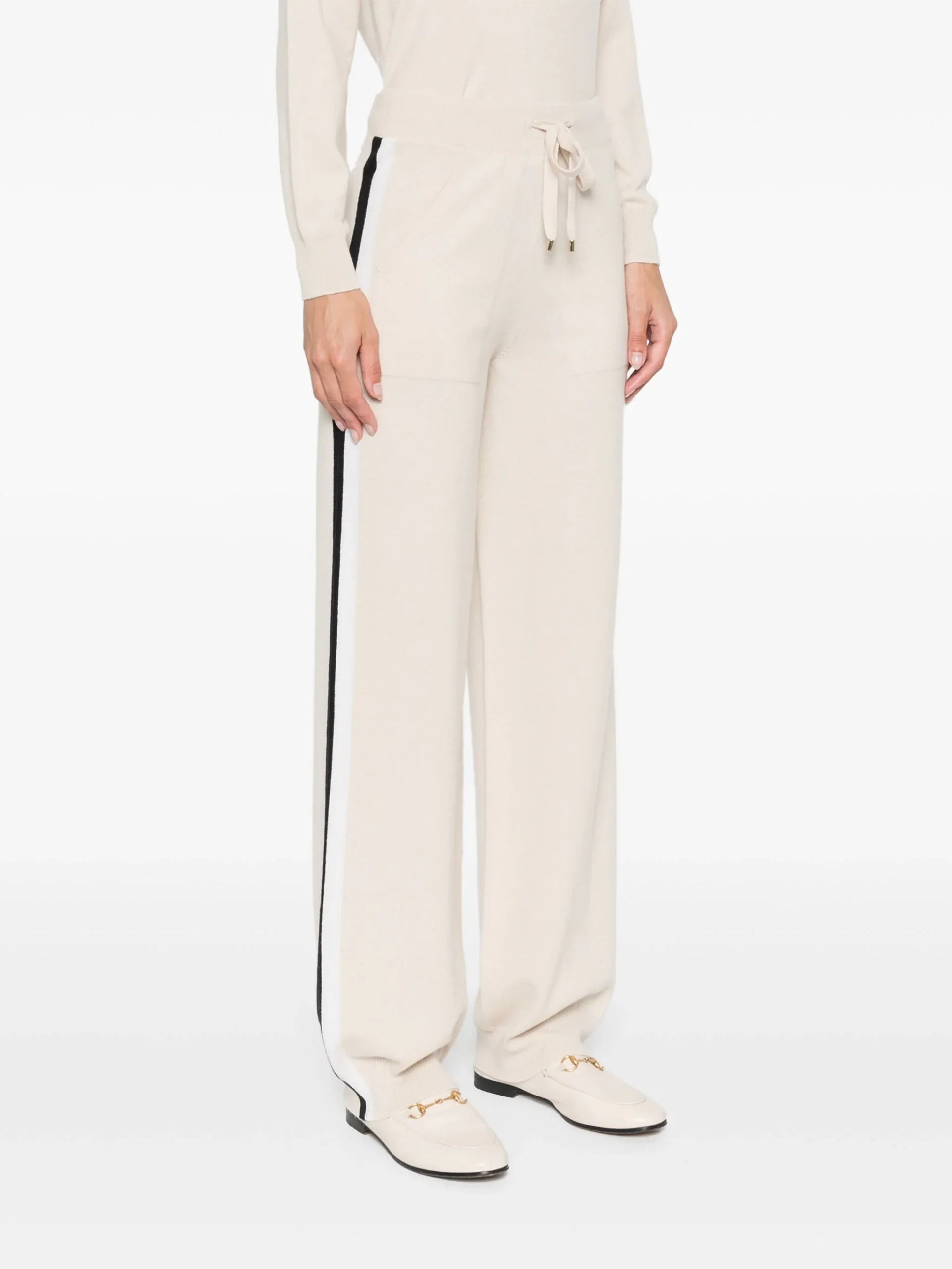 Pantaloni Lorena Antoniazzi stripe bej, contructie tricotata. centura elastica in talie, buzunare laterale, detaliu dungi. logo aplicat. 79% lana 10% casmir 9% matase 1% naylon 1% elastan
