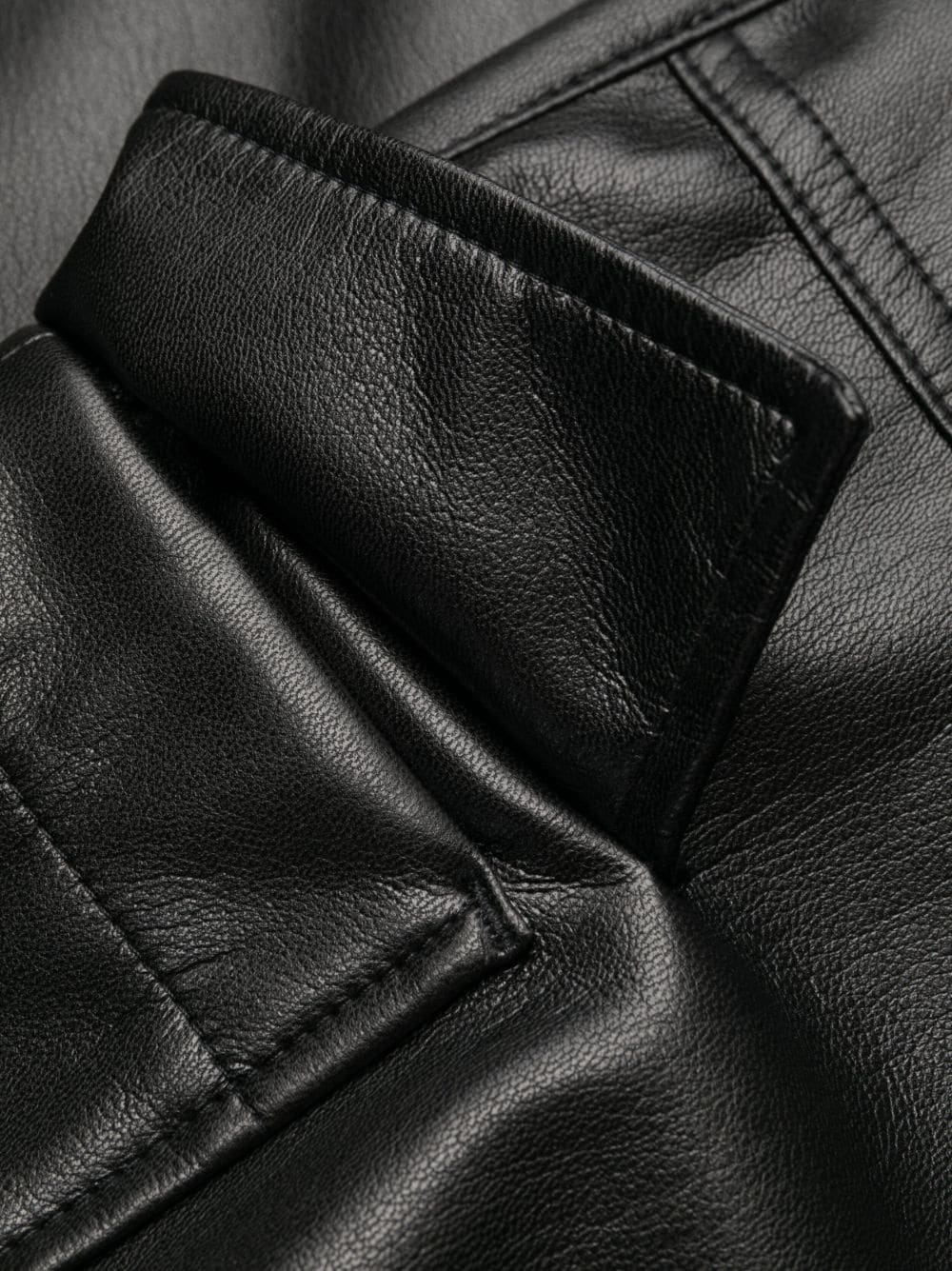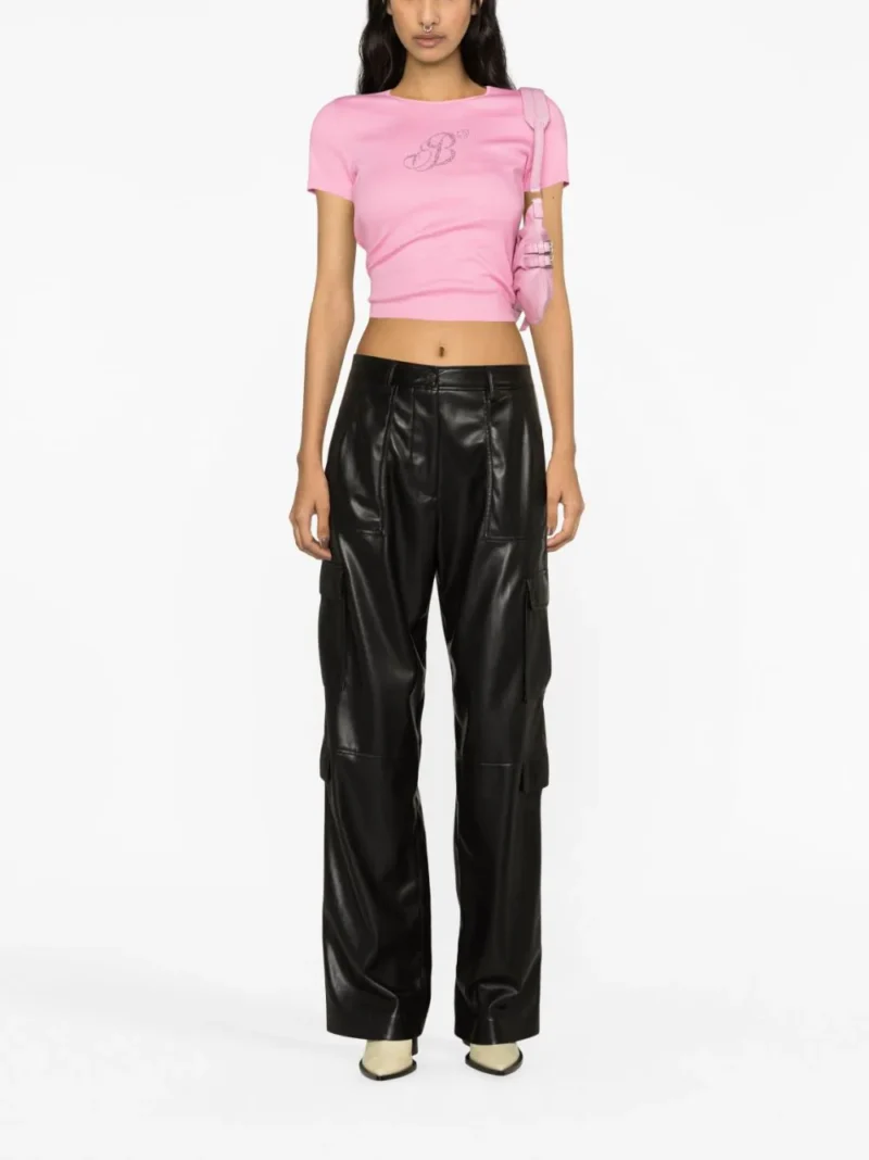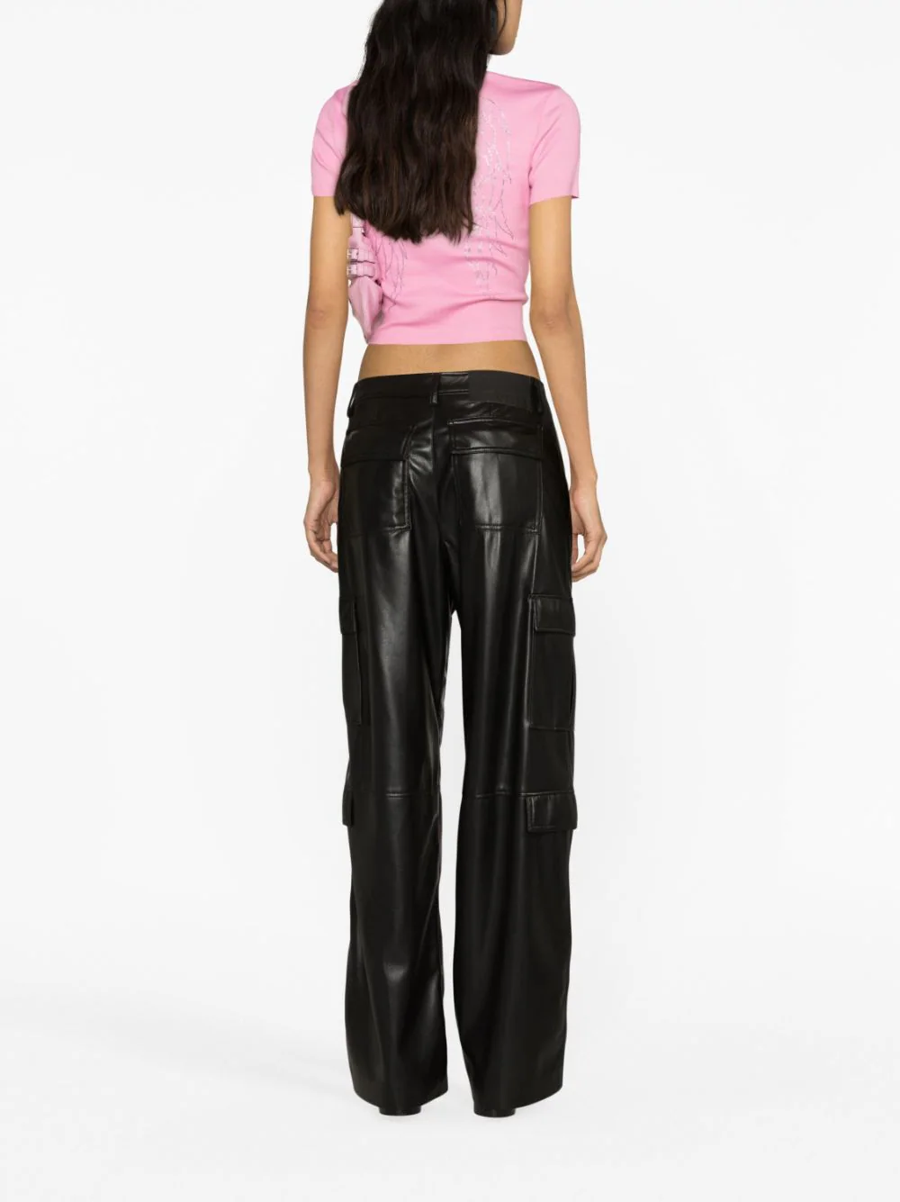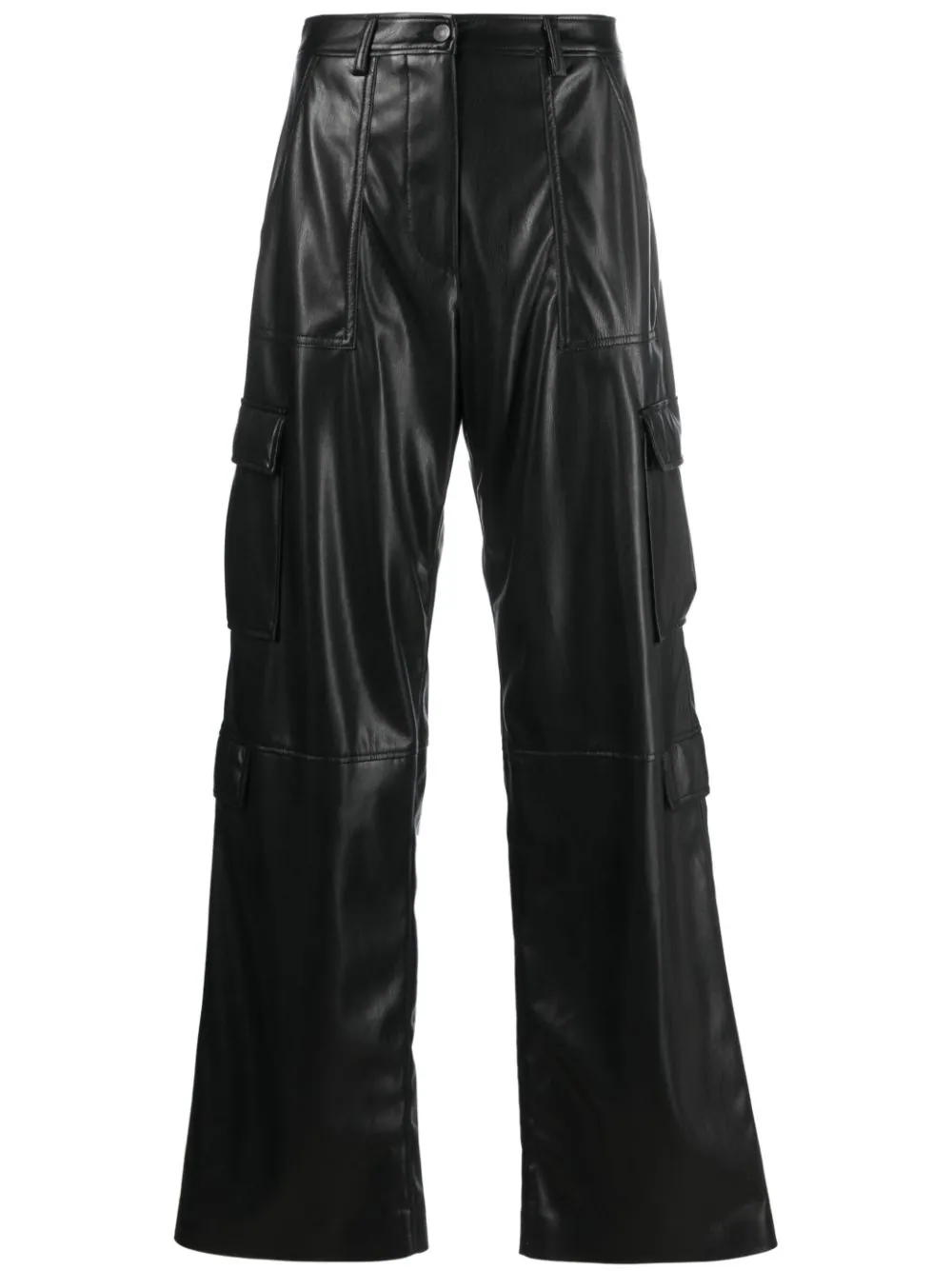 Pantaloni negri din poliester cu aspect de piele, talie medie si inchidere cu nasture si fermoar, eticheta cu logo MSGM cusuta la spate, buzunare laterale clasice, buzunare laterale tip cargo, buzunare cu clapeta la spate si croiala piciorului dreapta. Potriviti pentru sezonul toamna/iarna. 100% poliester.