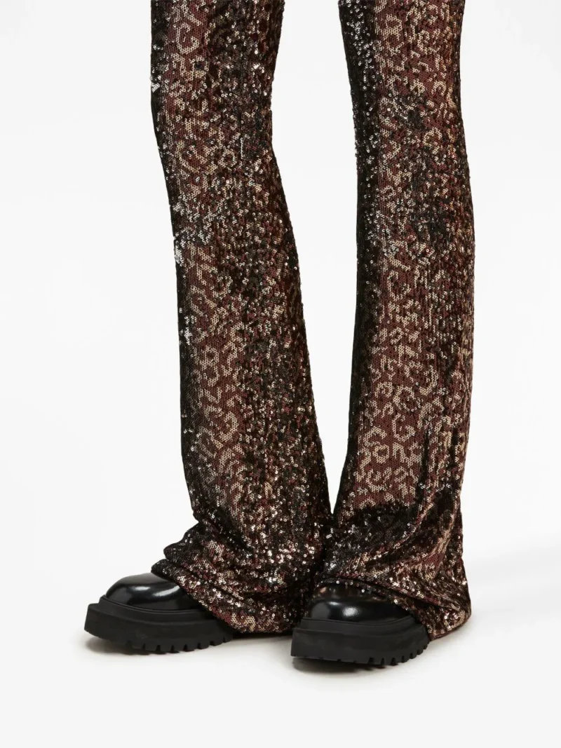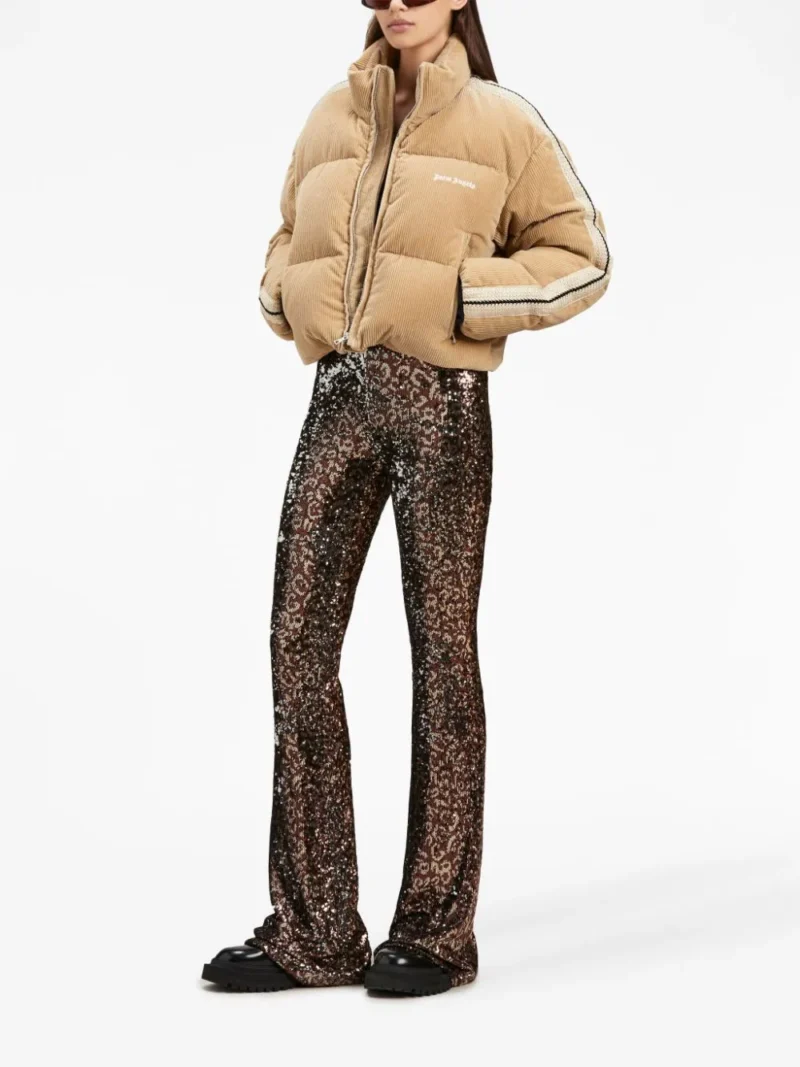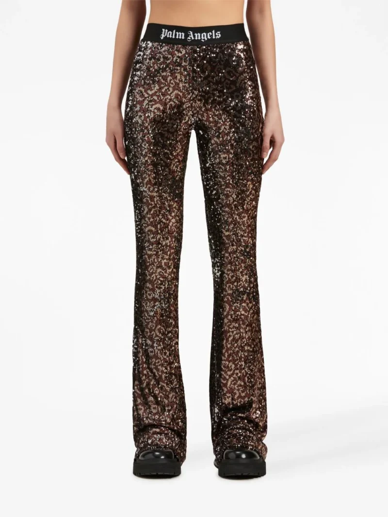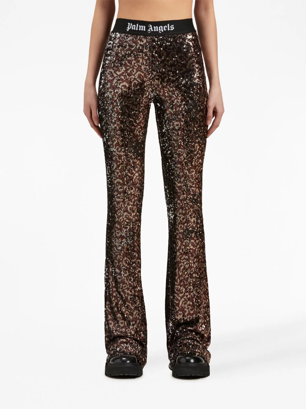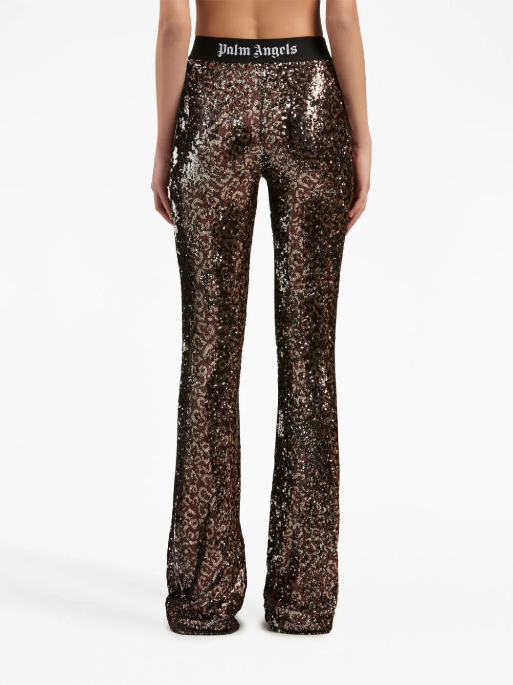 Pantaloni maro din fibre sintetice, cu banda elastica in talie cu logo Palm Angels, impodobiti cu paiete pe toata suprafata si avand tiv evazat. Potriviti pentru sezonul toamna/iarna. 100% poliester; 82% poliamida; 18% elastan.