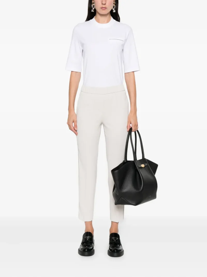 Pantaloni Peserico Elastic-Waistband Side-Stripe bej, cu talie medie si elastica, buzunare laterale, buzunare tip welt la spate, chain-link pe laterale si tiv drept. Potrviti pentru sezonul toamna/iarna. 61% acetat; 100% poliester; 39% cupro.