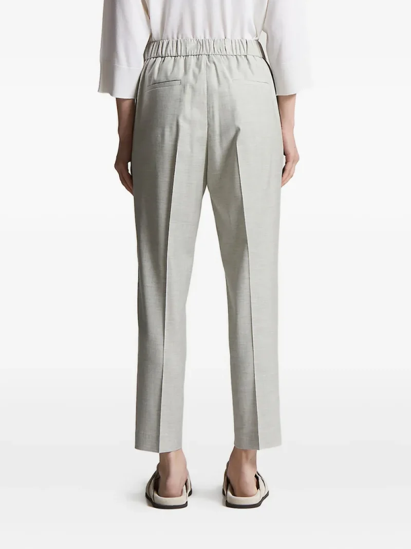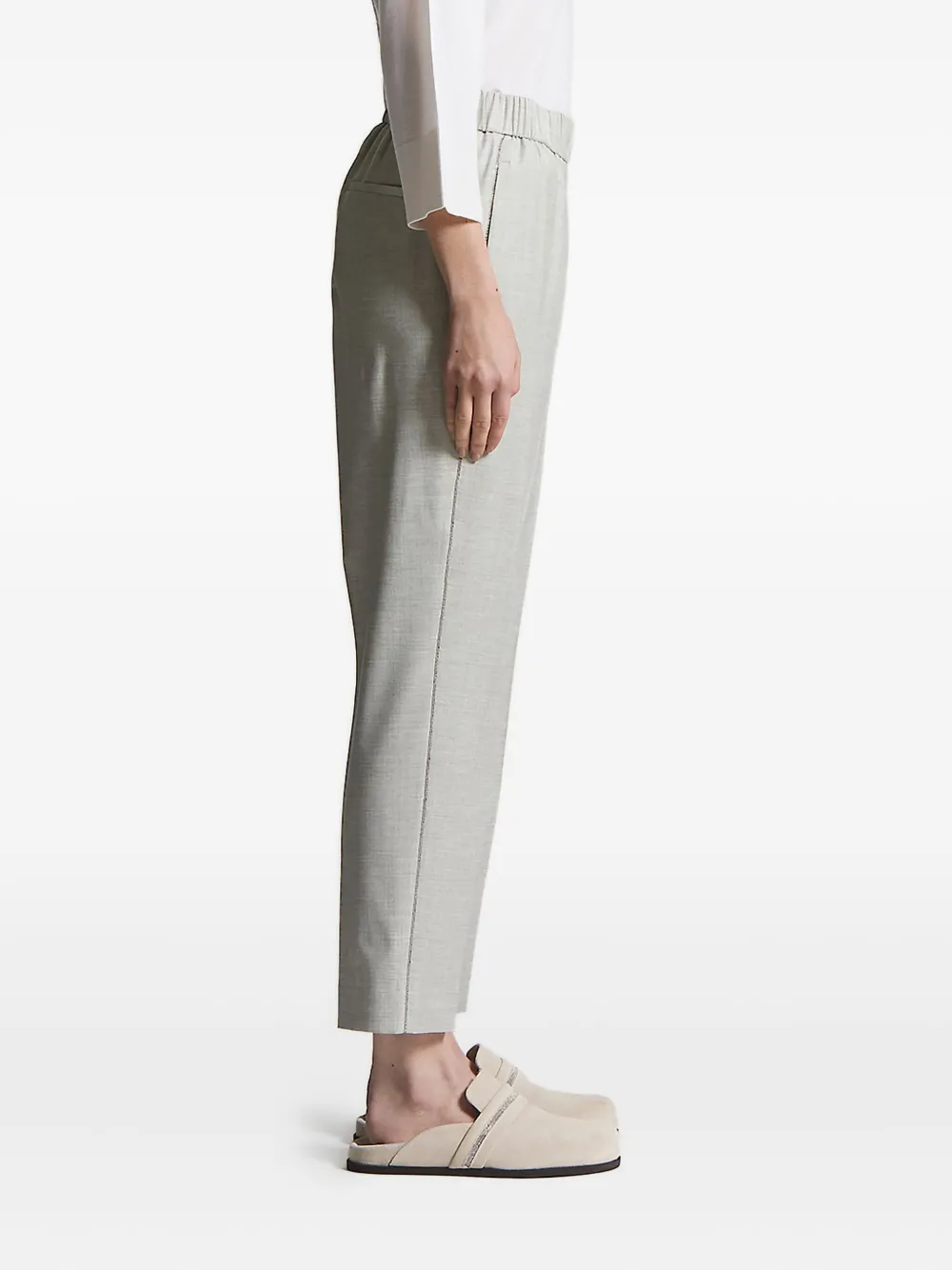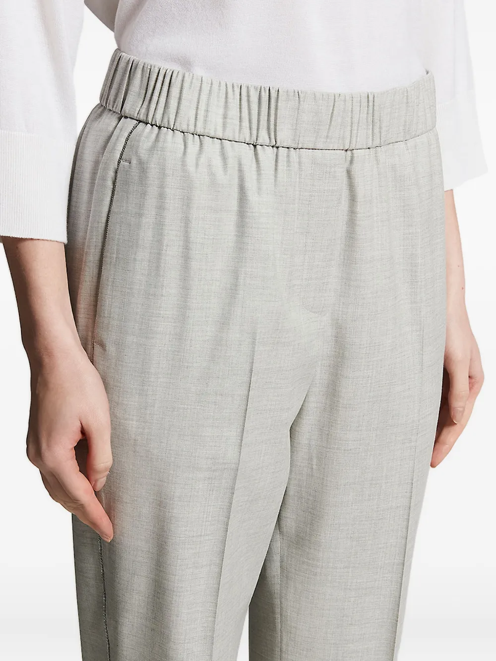 Pantaloni Peserico Elastic-Waistband Side-Stripe gri, cu talie elastica, buzunare laterale, buzunare tip welt la spate, Chain-link aplicat pe laterale si tiv drept. Potriviti pentru sezonul toamna/iarna. 60% lana; 37% vascoza; 3% elastan.