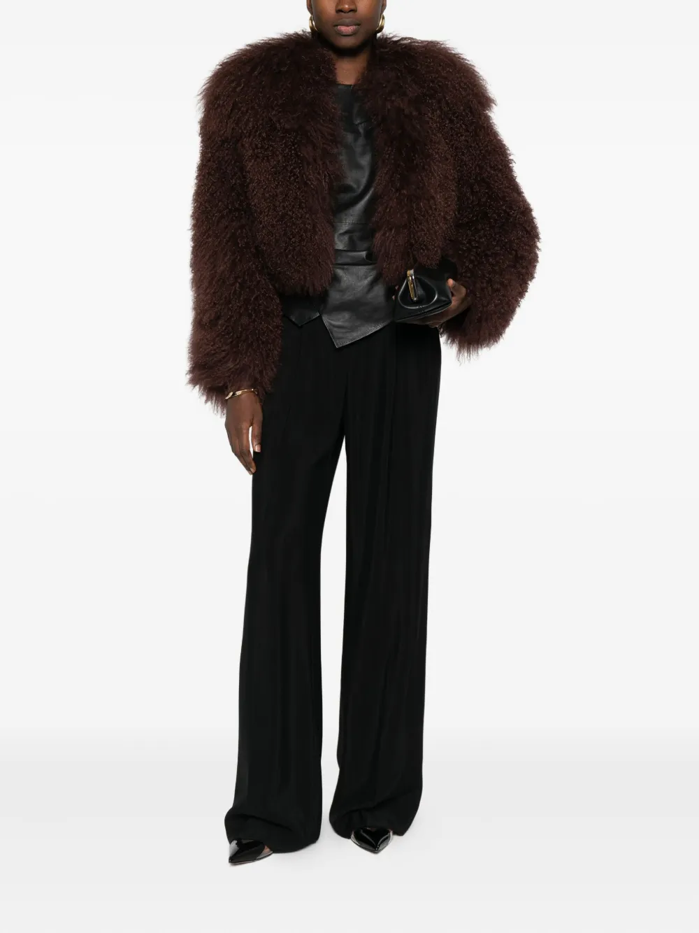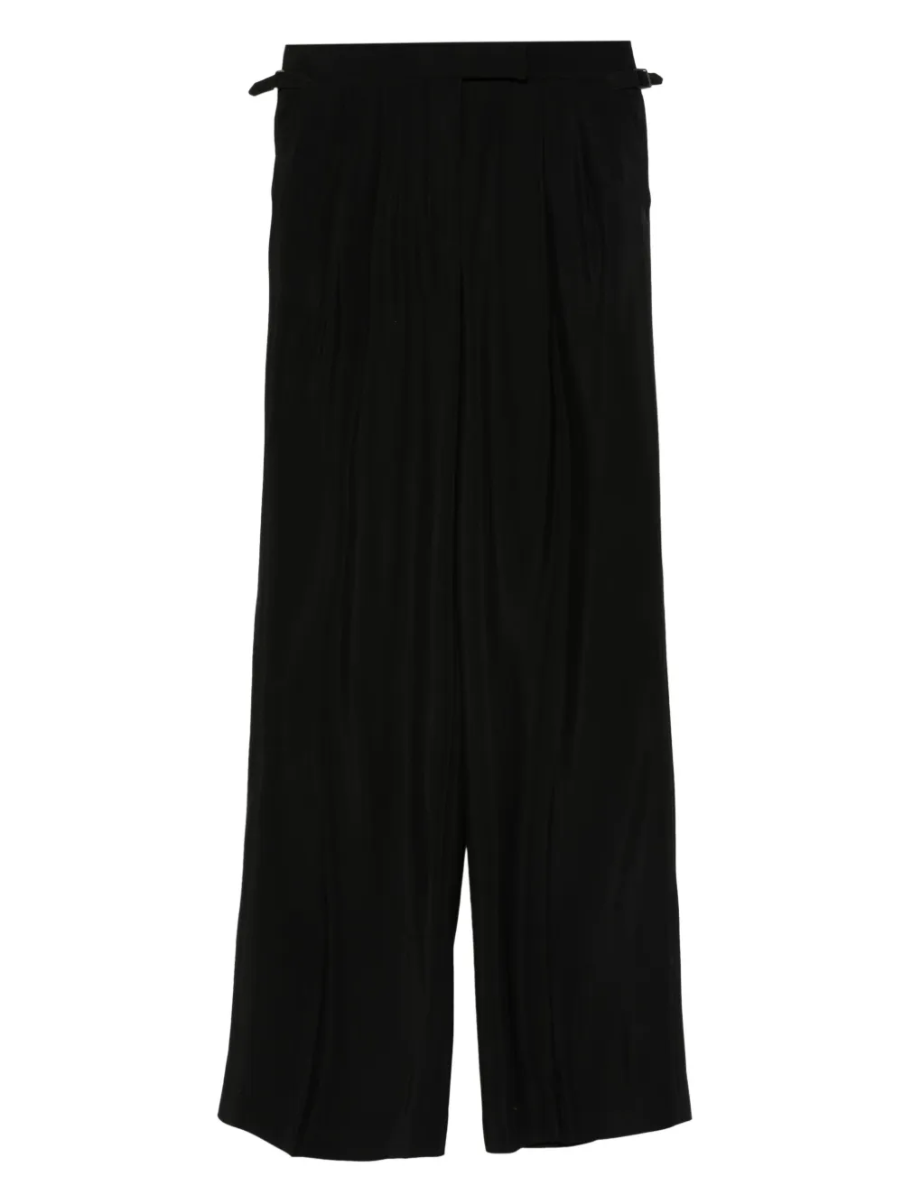Pantaloni Pleated TOM FORD negru, din viscoza, wide-fit, cu inchidere clasica, buzunare laterale, buzunare tip welt la spate, curele decorative pe talie si tiv drept. Potriviti pentru sezonul toamna/iarna. 59% cupro; 76% viscoza; 24% lana; 41% matase.