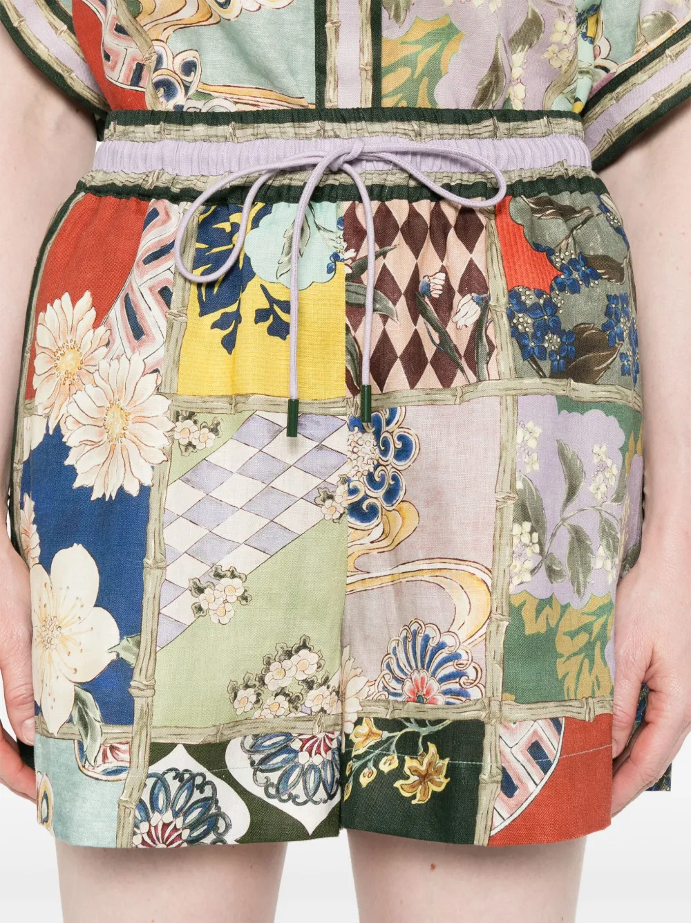 Pantaloni scurti Alemais Bianca multicolor, din in, cu talie elastica, buuznare diagonale, grafica mic imprimata in panouri si tiv drept. Potriviti pentru sezonul toamna/iarna. 100% in certificat.