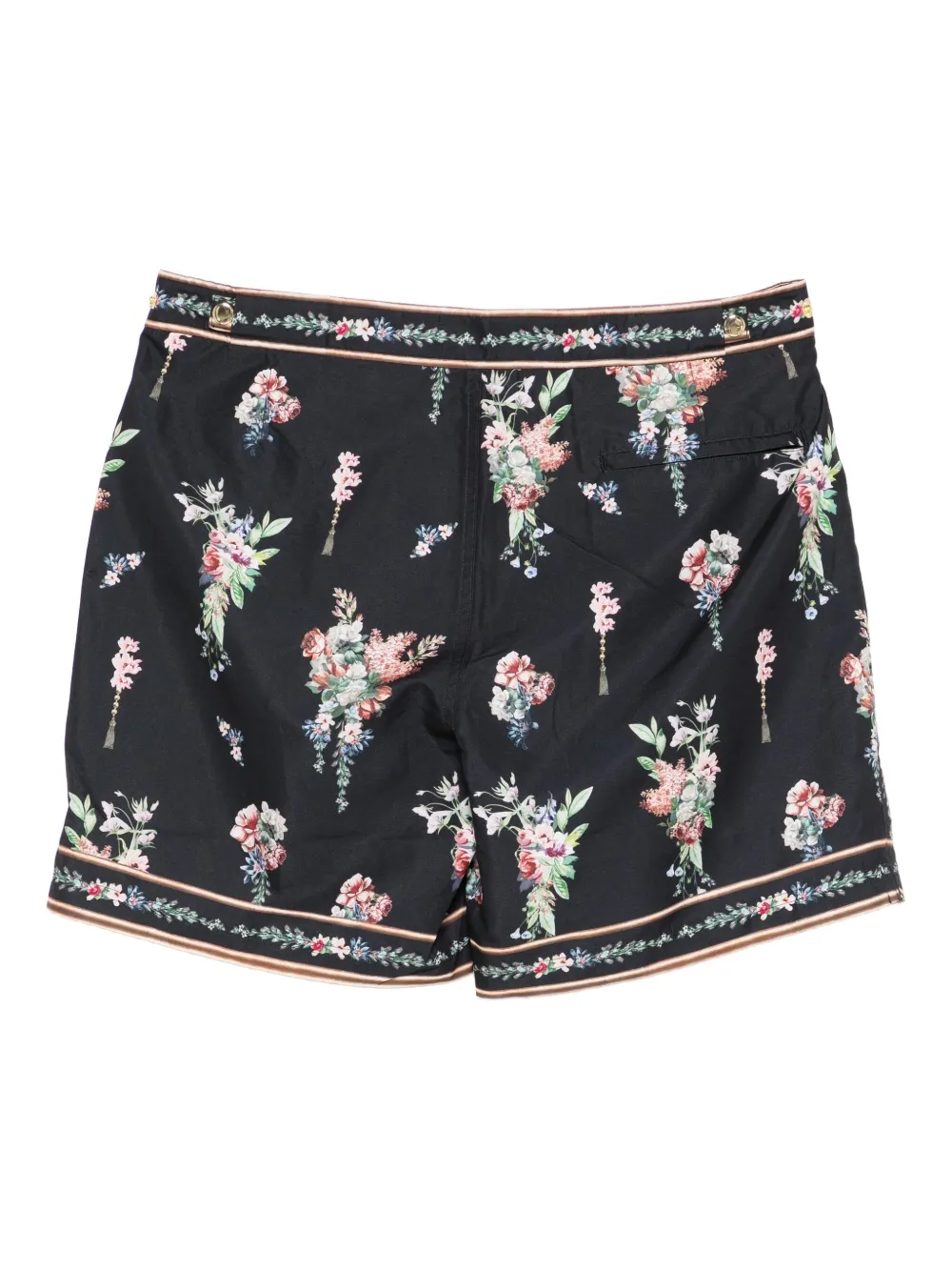 Pantaloni scurti Camilla Floral-Print Tassel Swim negru, din poliester, cu inchider clasic,a buzunare laterale, buzunar tip welt la spate, grafica florala imprimata si tiv drept. Potriviti pentru sezonul primavara/vara. 85% nailon; 100% poliester reciclat; 15% elastan.