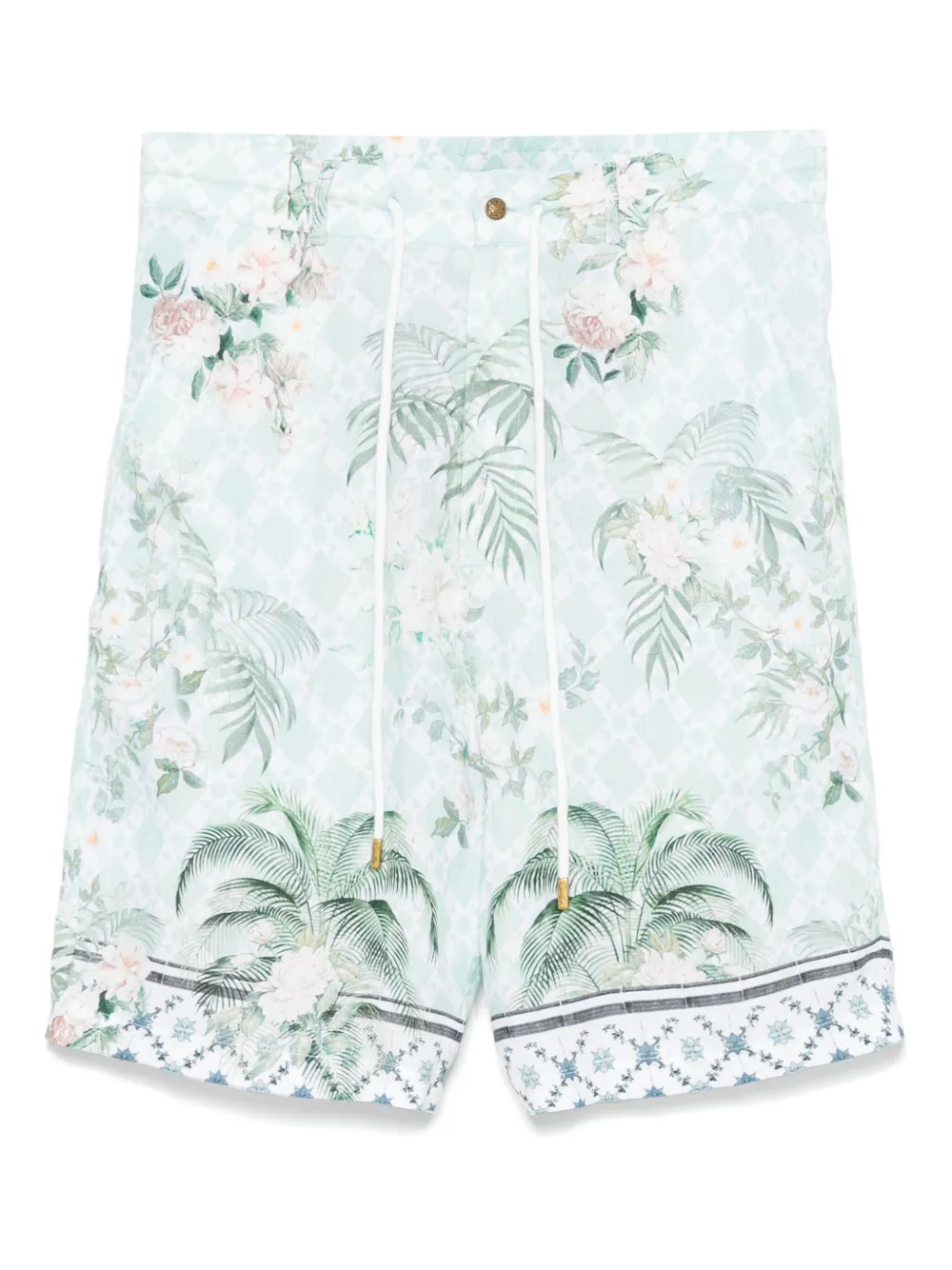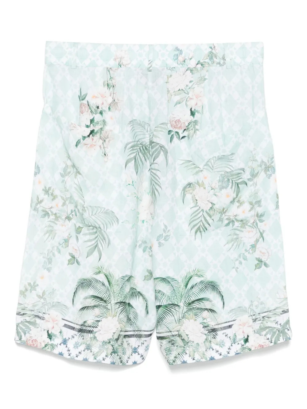 Pantaloni scurti Camilla Jardim-Party Print verde, din in, cu inchidere nasturem fermoar si snur, grafica Jardim imprimata si tiv drept. Potriviti pentru sezonul primavara/vara. 100% in.