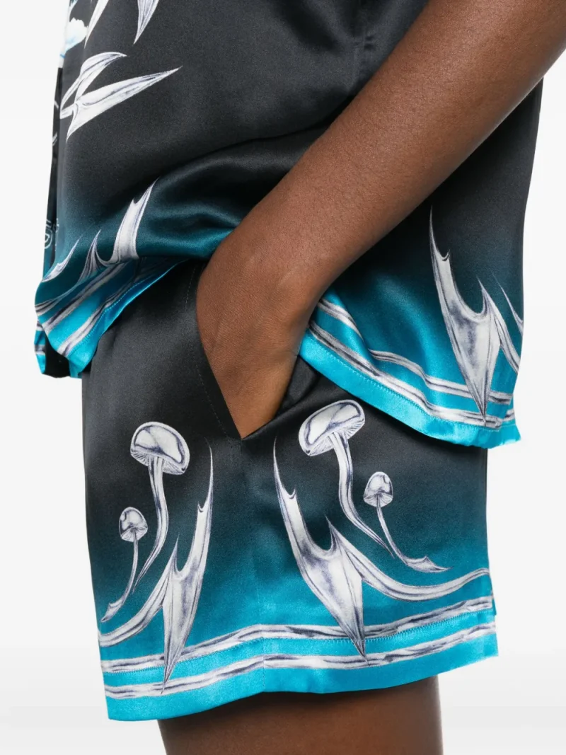 Pantaloni scurti Casablanca mushroom-print albastru, imprimeu pe intreaga suprafata, banda elastica in talie. buzunare laterale, buzunar la spate.100% matase