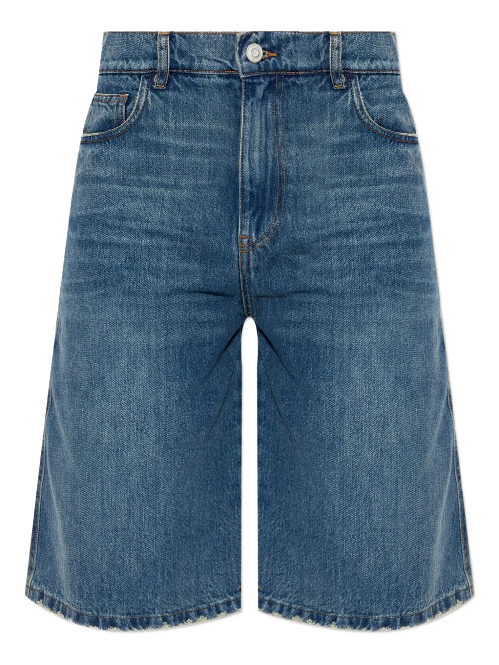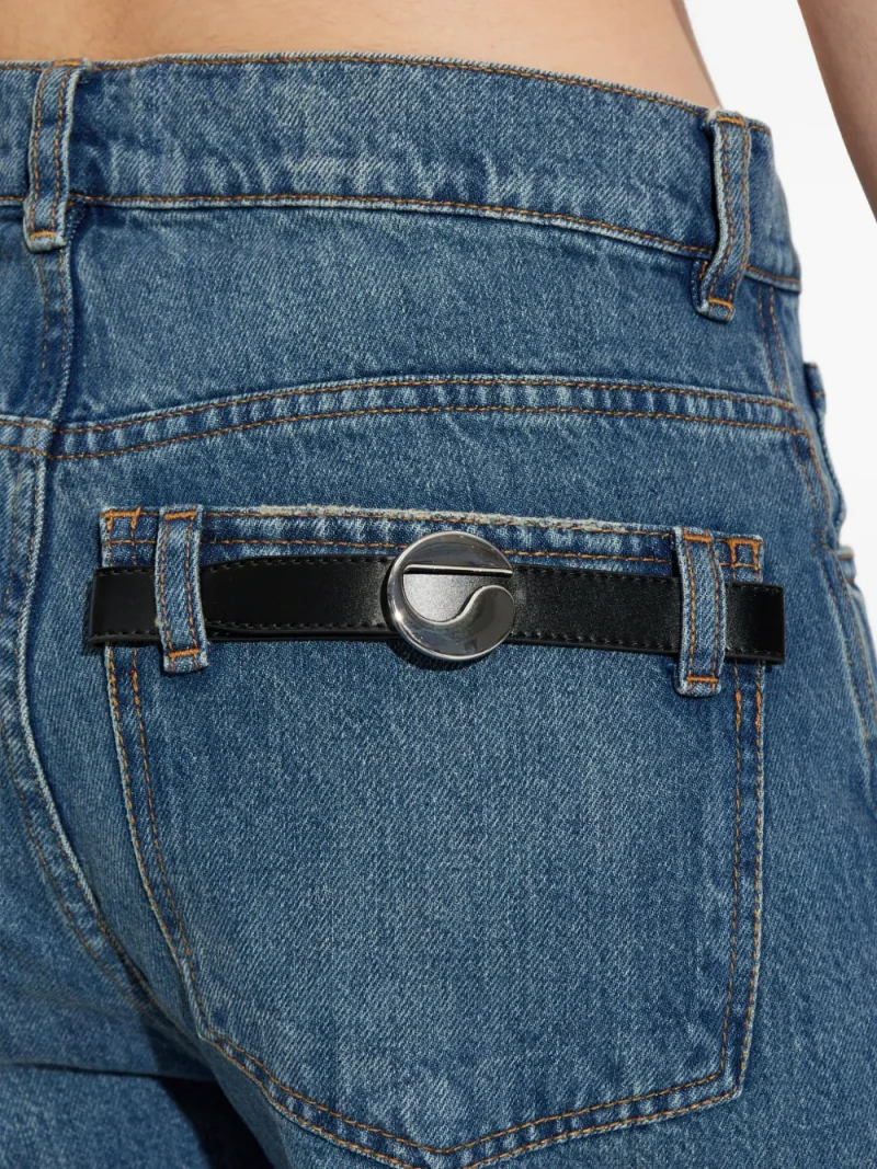 Pantaloni scurti Coperni Logo-Belt albastru, din denim, cu inchidere nasture si fermoar, model „5-pockets”, curea decorativa cu logo aplicata la spate, lungime medie si tiv drept. Potriviti pentru sezonul toamna/iarna. 100% bumbac.