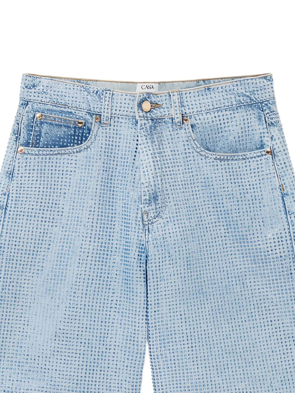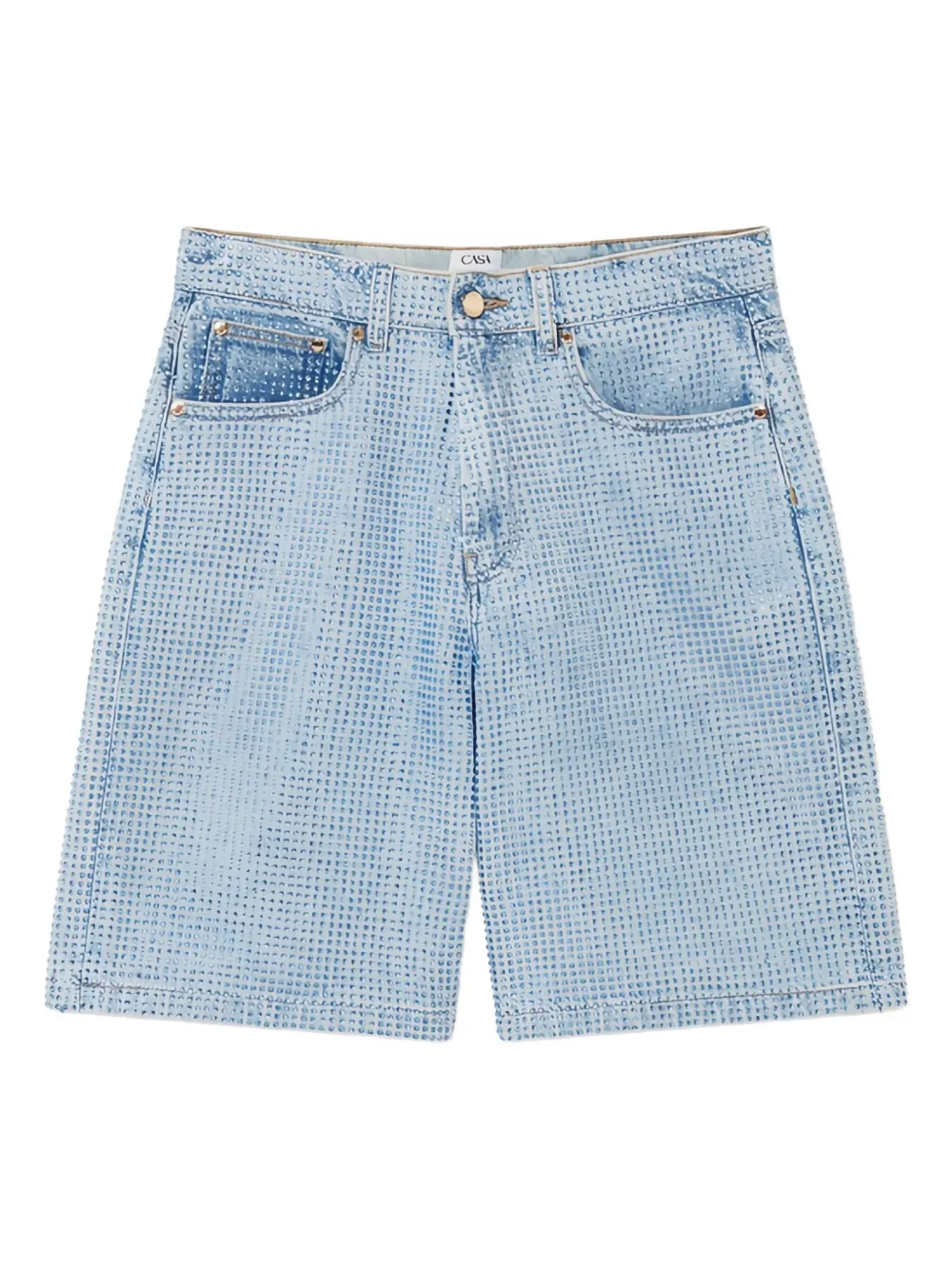 Pantaloni scurti denim Casablanca albastru, din bumbac, cu inchidere nasture si fermoar, model „5-pockets”, decorati integral cu cristale sclipitoare si tiv drept. Potriviti pentru sezonul primavara/vara. 100% bumbac.