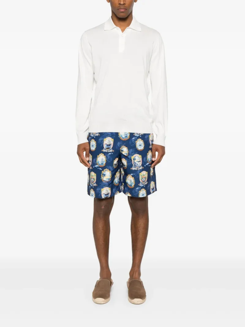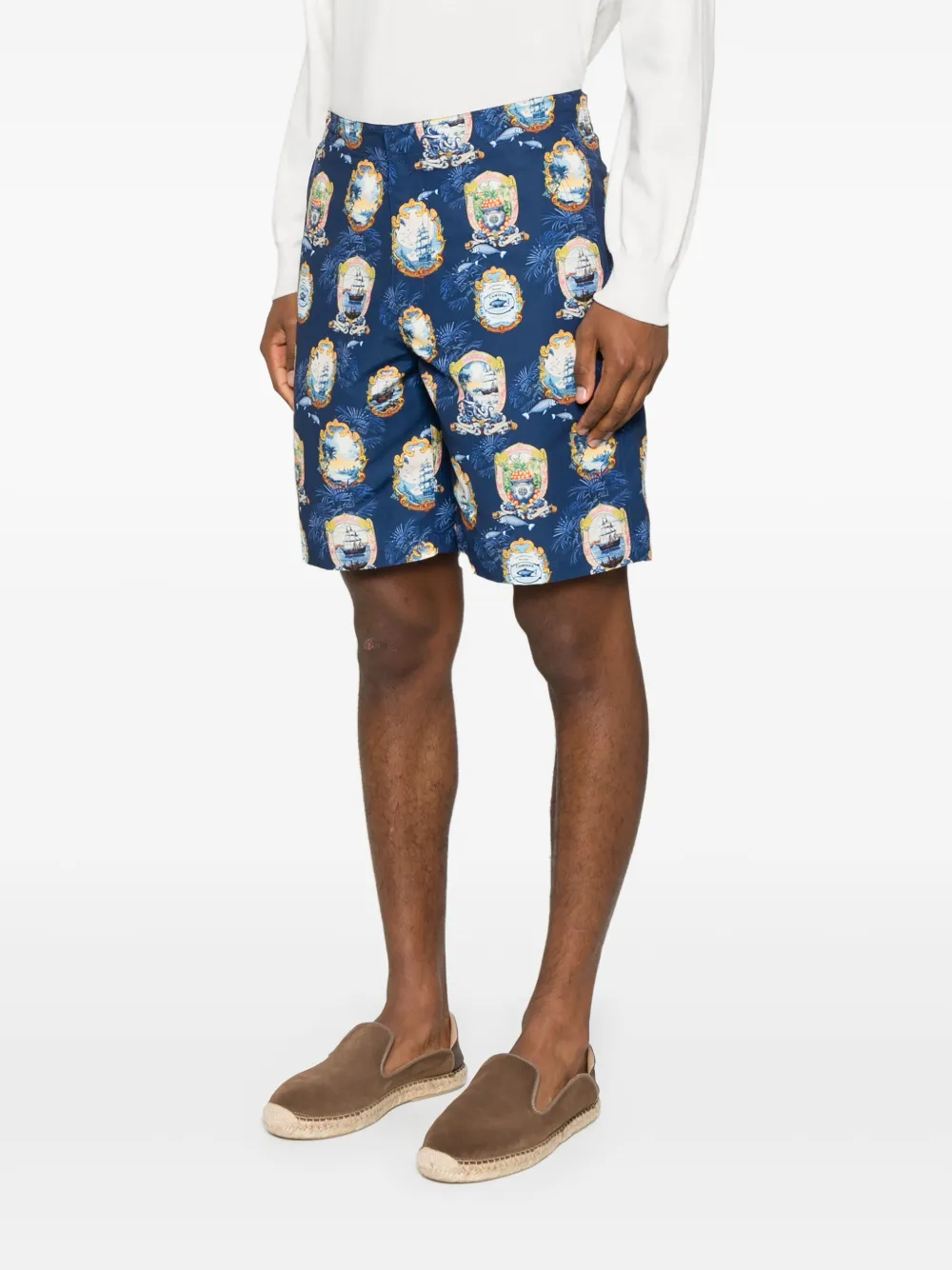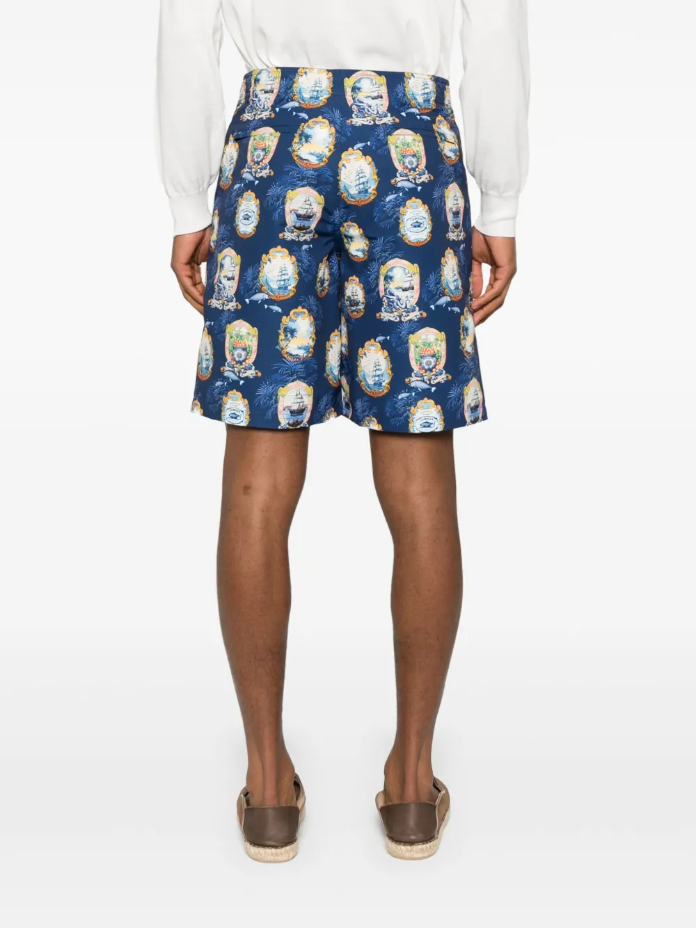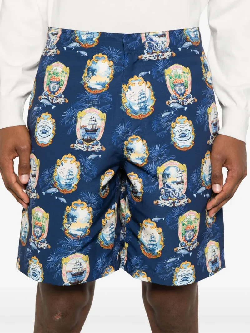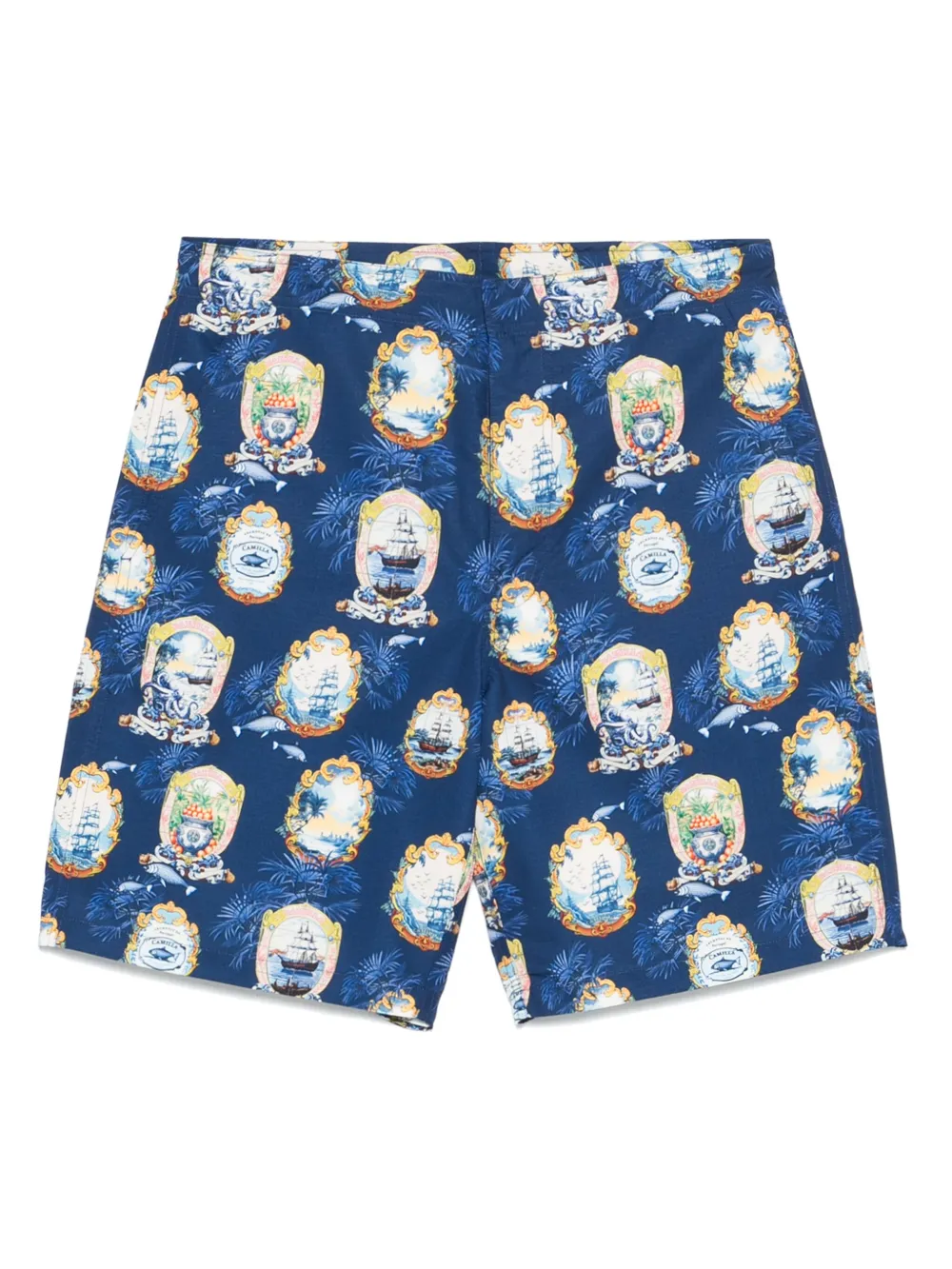 Pantaloni scurti Graphic-Print albastru, din poliester, cu inchidere clasica, buzunare laterale, grafica imprimata pe toata suprafata si tiv drept. Potriviti pentru sezonul primavara/vara. 15% elastan; 1005 poliester reciclat; 85% nailon.