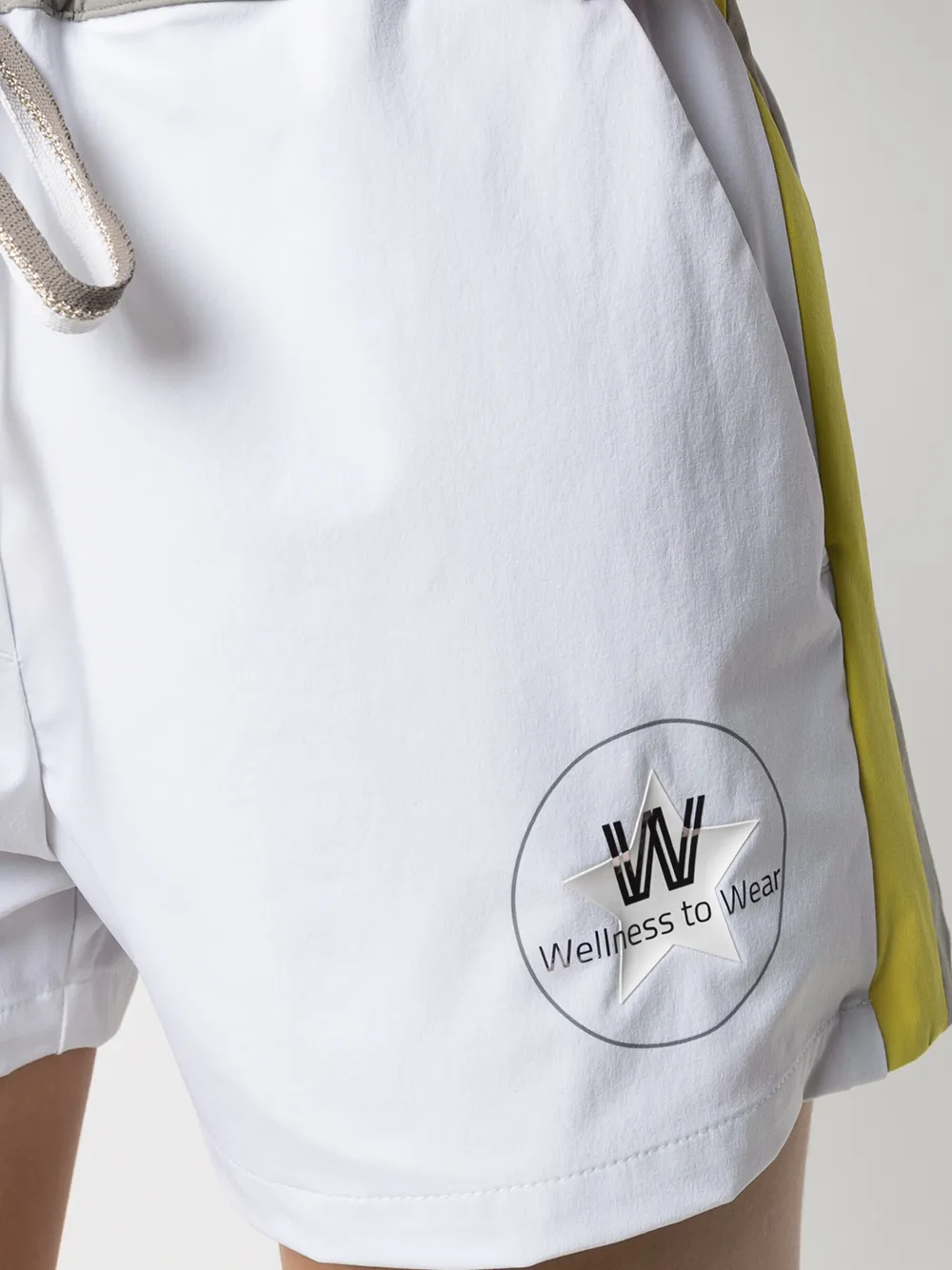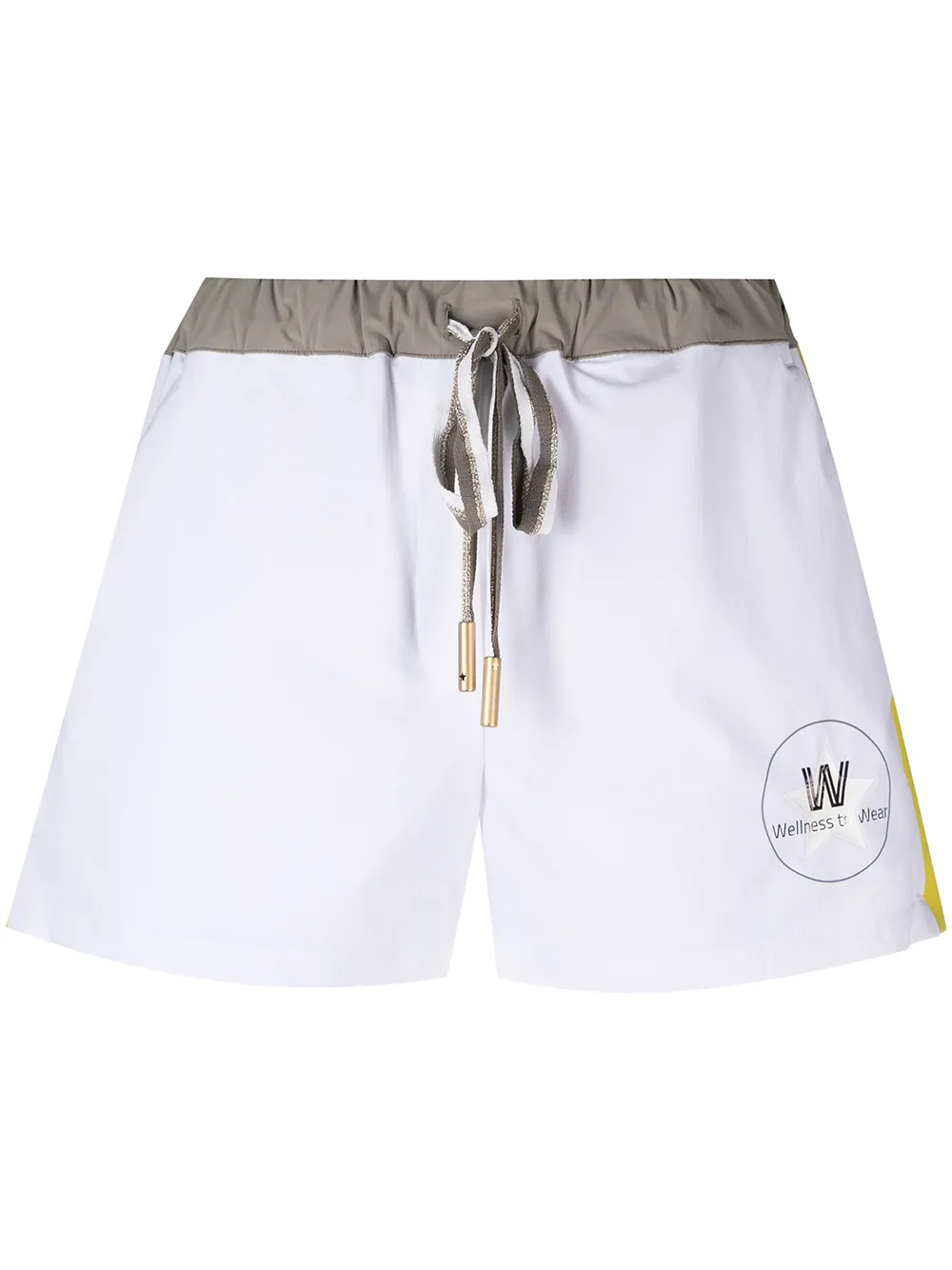 Pantaloni scurti Lorena Antoniazzi Side-Stripe alb, din poliamida, cu talie elastica si inchidere snur, buzunare laterale, dungi in contrast si tiv drept. Potriviti pentru sezonul primavara/vara. 61% poliamida; 49% elastan.