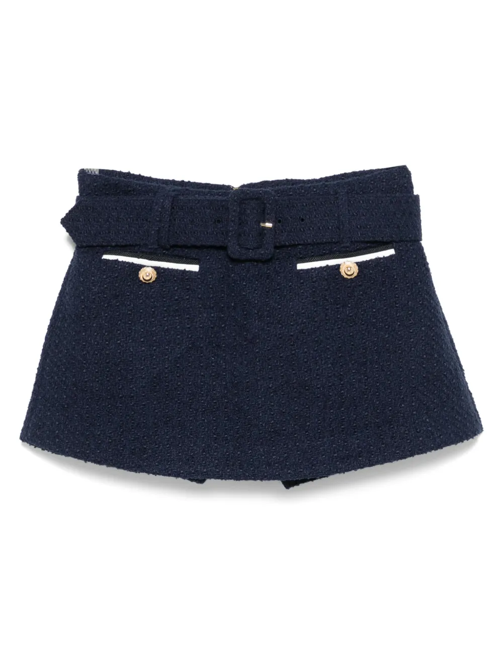Pantaloni scurti Self-Portrait Tweed bleumarin, cu aspect de fusta, mini, cu inchidere fermoar, buzunare frontale tip welt si curea decorativa. Potriviti pentru sezonul toamna/iarna. 26% acril; 40% poliester; 24% lana; 10% poliamida; 100% poliester.