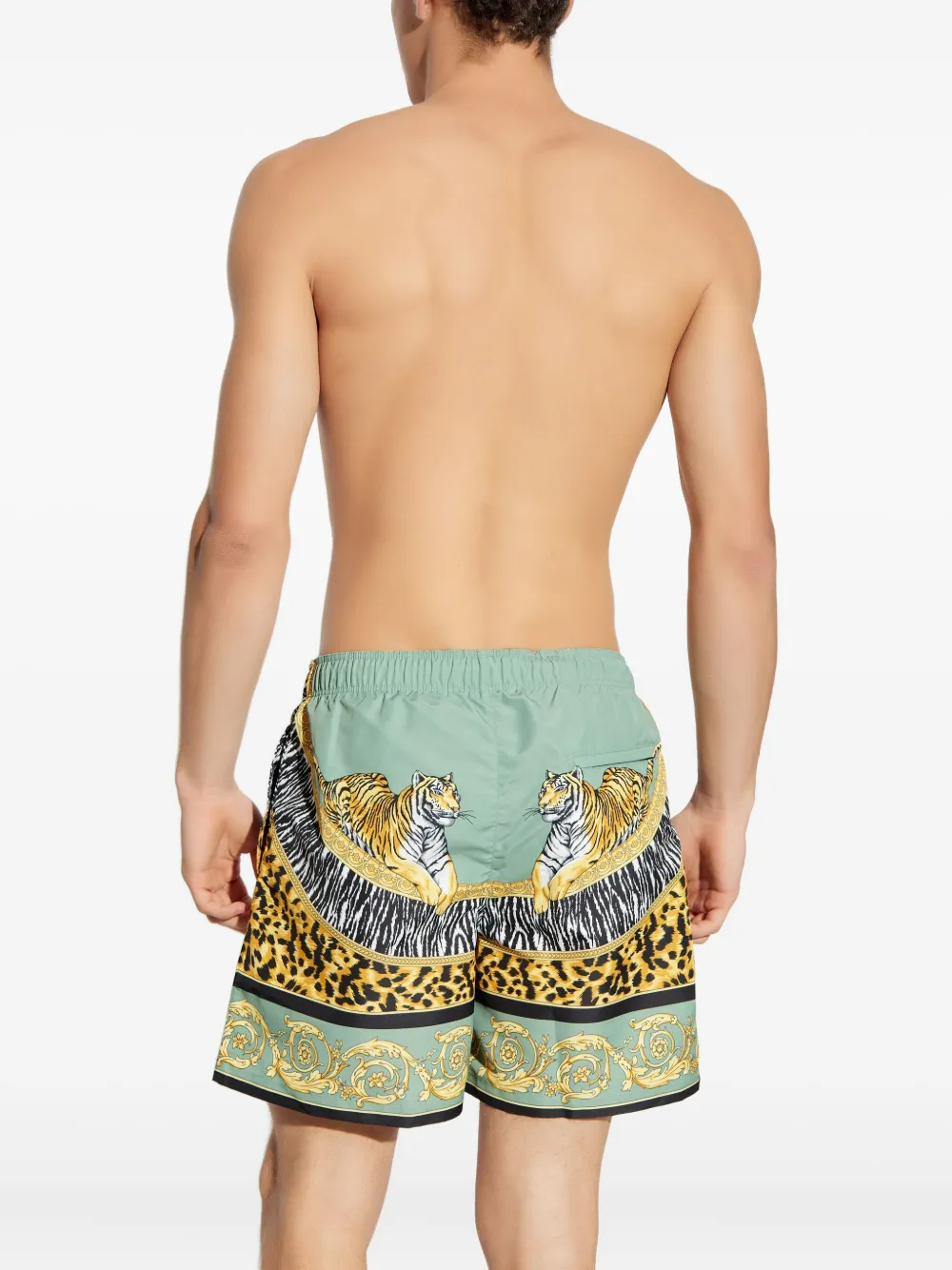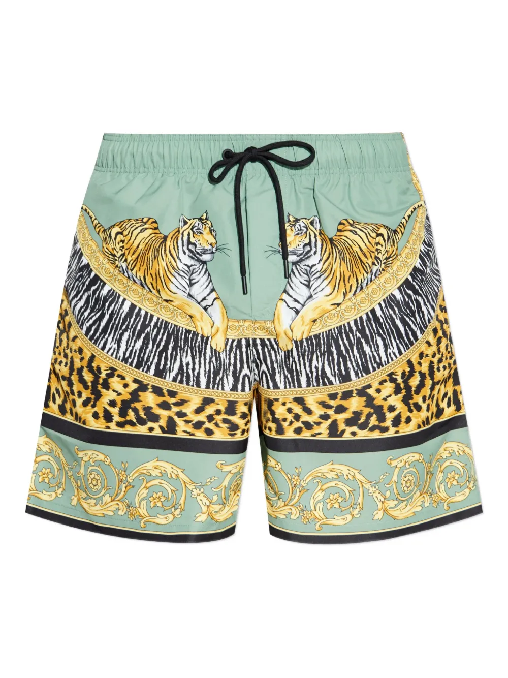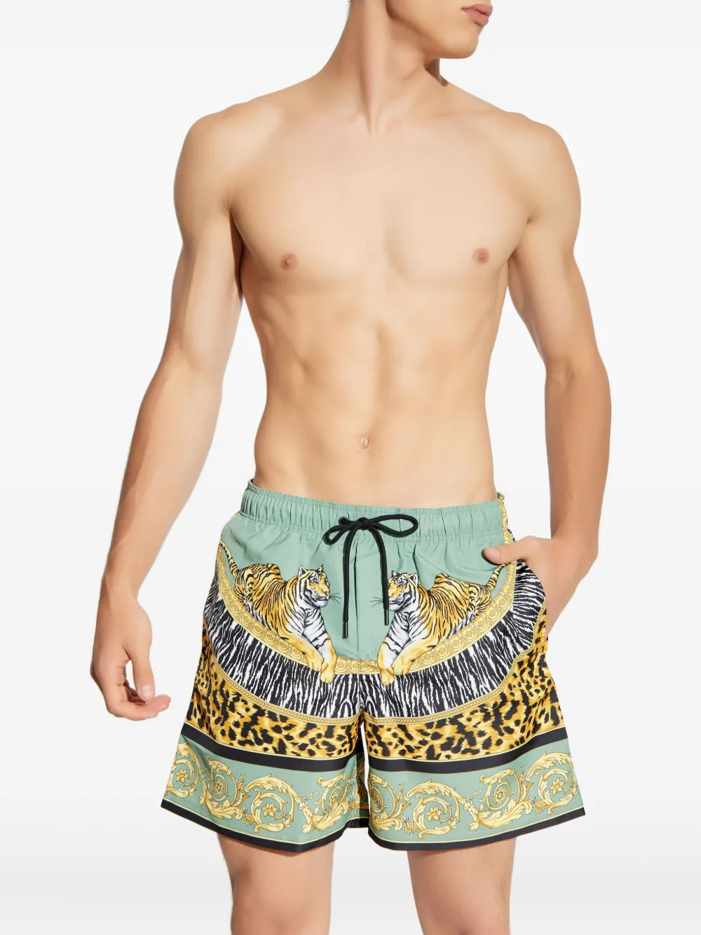 Pantaloni scurti tiger-print drawstring multicolor, imprimeu tigru, imprimeu baroc emblematic, inchidere cu snur. Aveti grija sa probati costumele de baie deasupra propriilor articole de imbracaminte.100% poliester