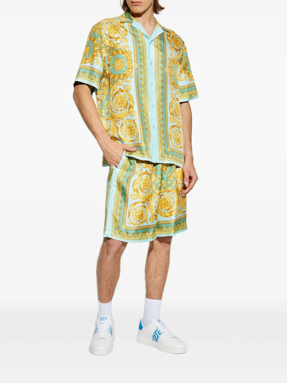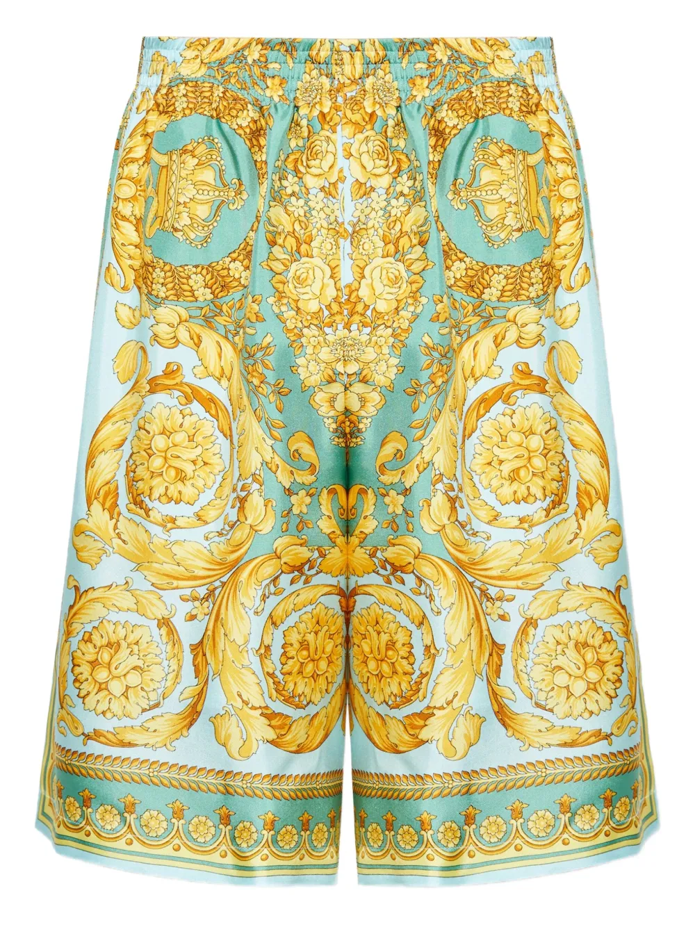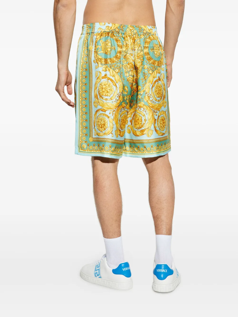 Pantaloni scurti Versace Barocco Print verde, din matase, cu talie elastica, buzunare laterale, grafica Barocco imprimata, aspect satinat si tiv drept. Potriviti pentru sezonul toamna/iarna. 100% matase.