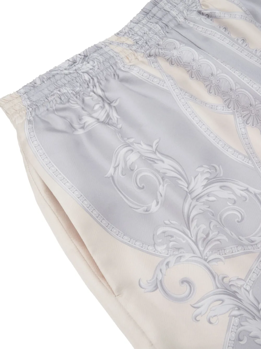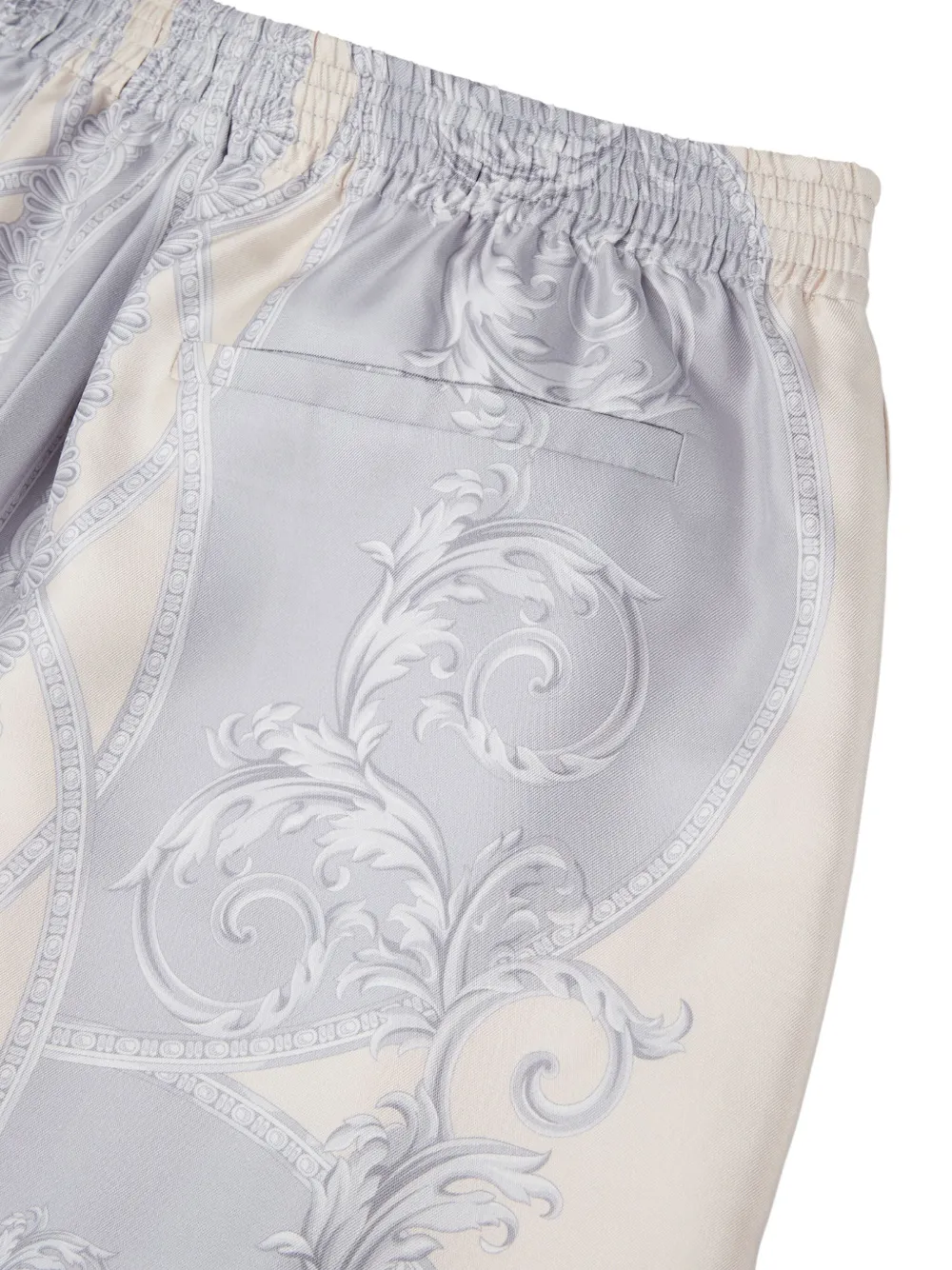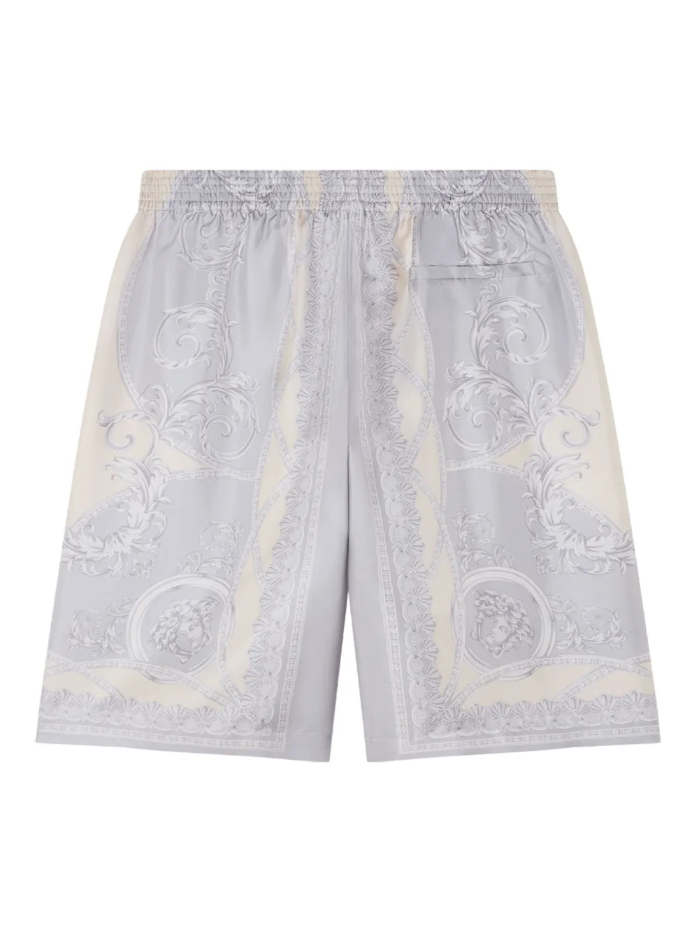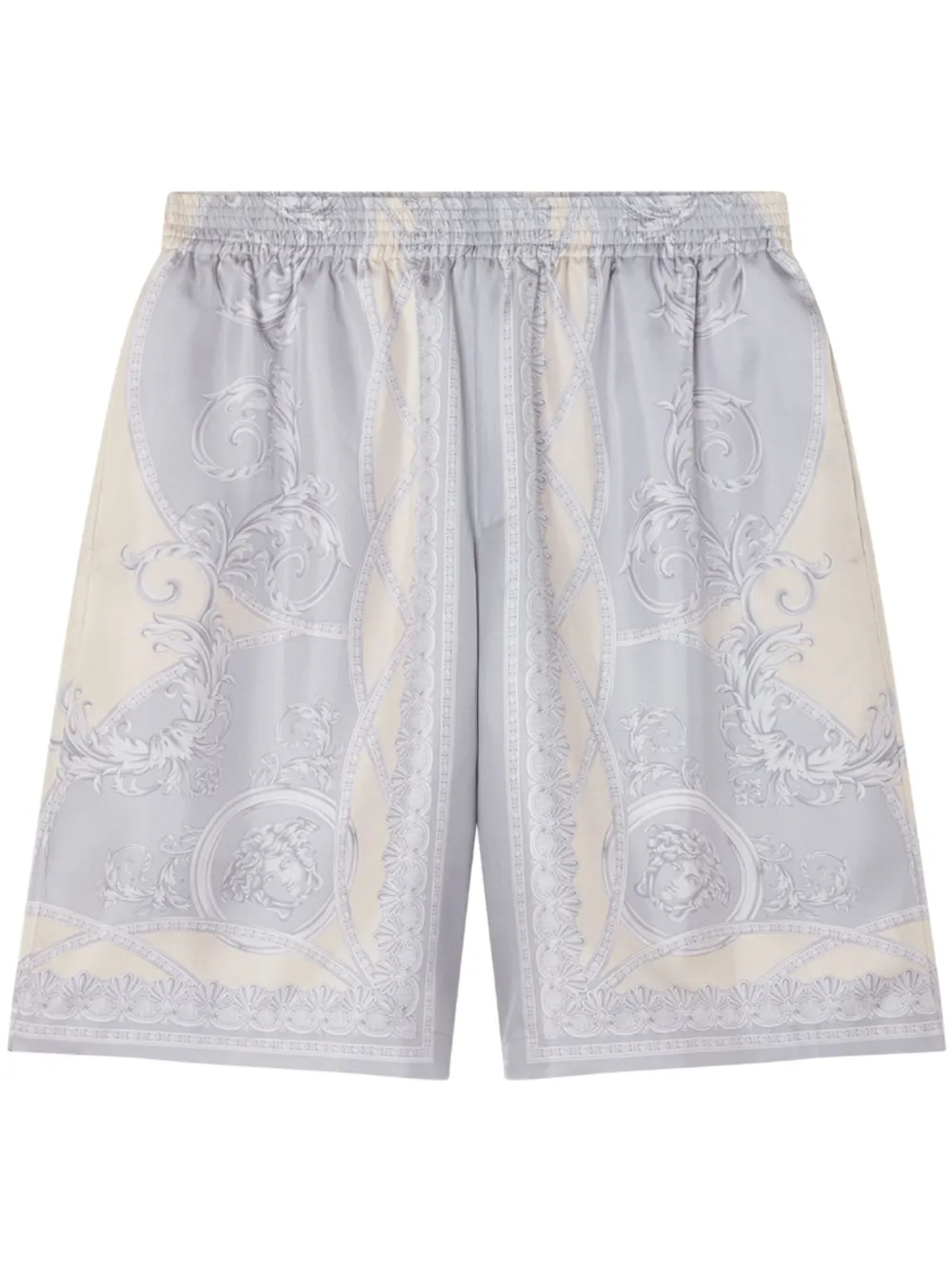 Pantaloni scurti Versace La Coupe des Dieux gri, din matase satinata, cu talie elastica, buzunare laterale, buzunar aplicat la spate, grafica „La Coupe des Dieux” imprimata si tiv drept. Potriviti pentru sezonul primavara/vara. 100% matase.
