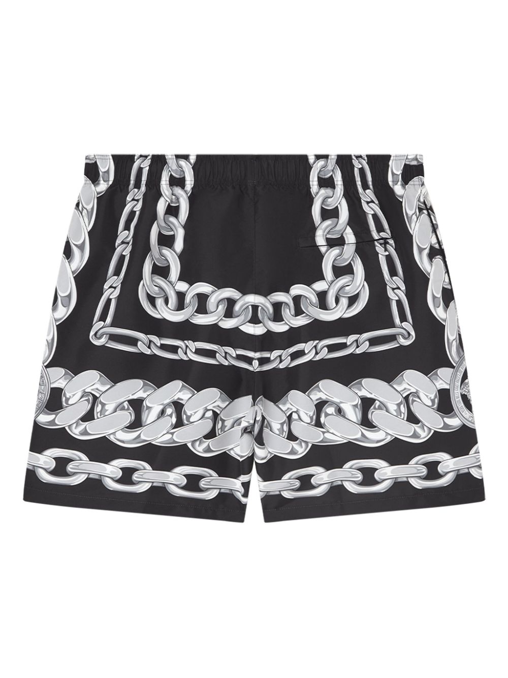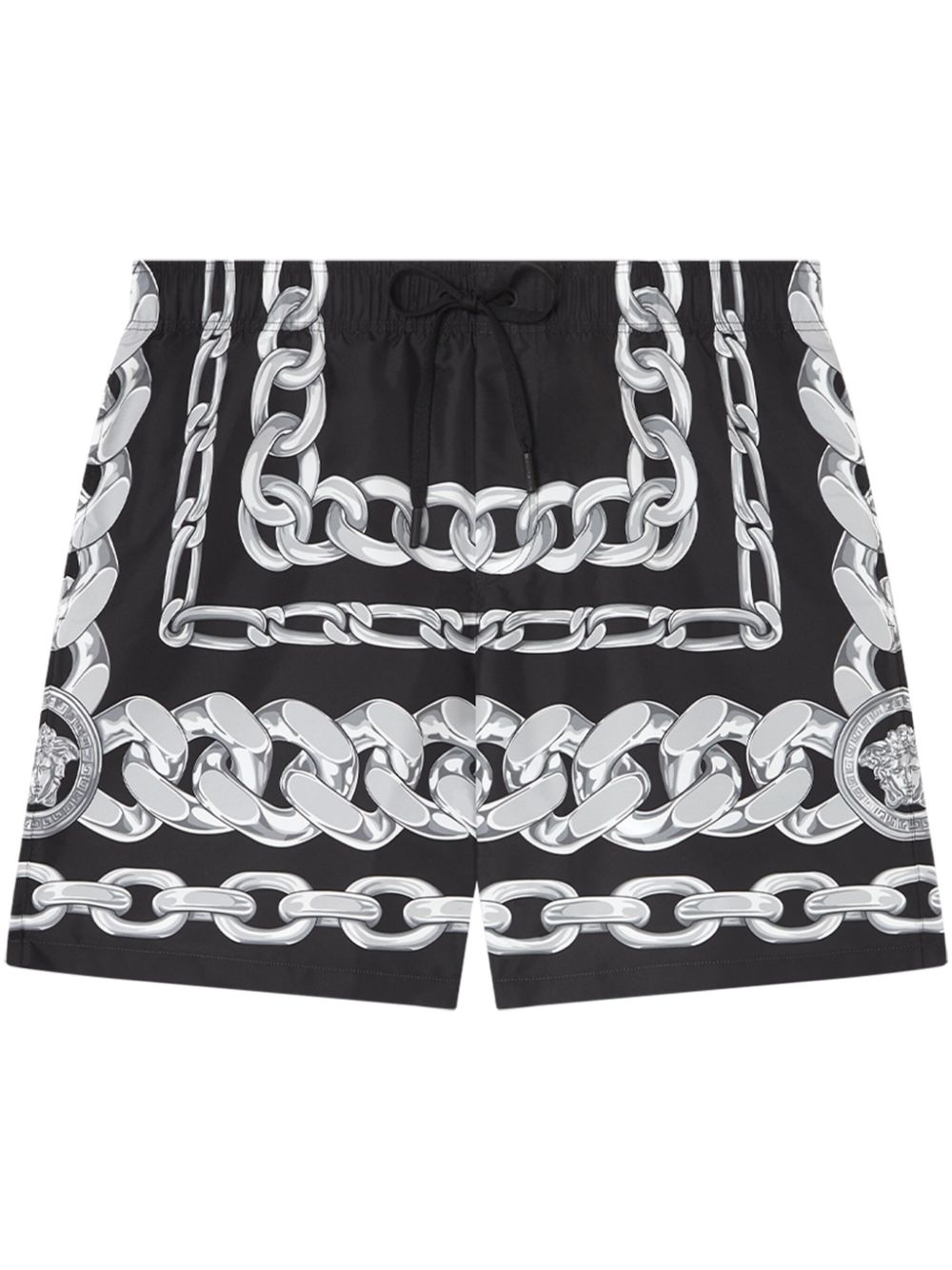 Pantaloni scurti Versace Medusa Chains negru, din poliester, cu talie elastica si inchidere snur, buzunare laterale, grafica „Medusa Chain” imprimata pe toata suprafata produsului si tiv drept. Potrivti pentru sezonul primavara/vara. 100% poliester; 100% poliester; 94% nailon; 6% elastan.