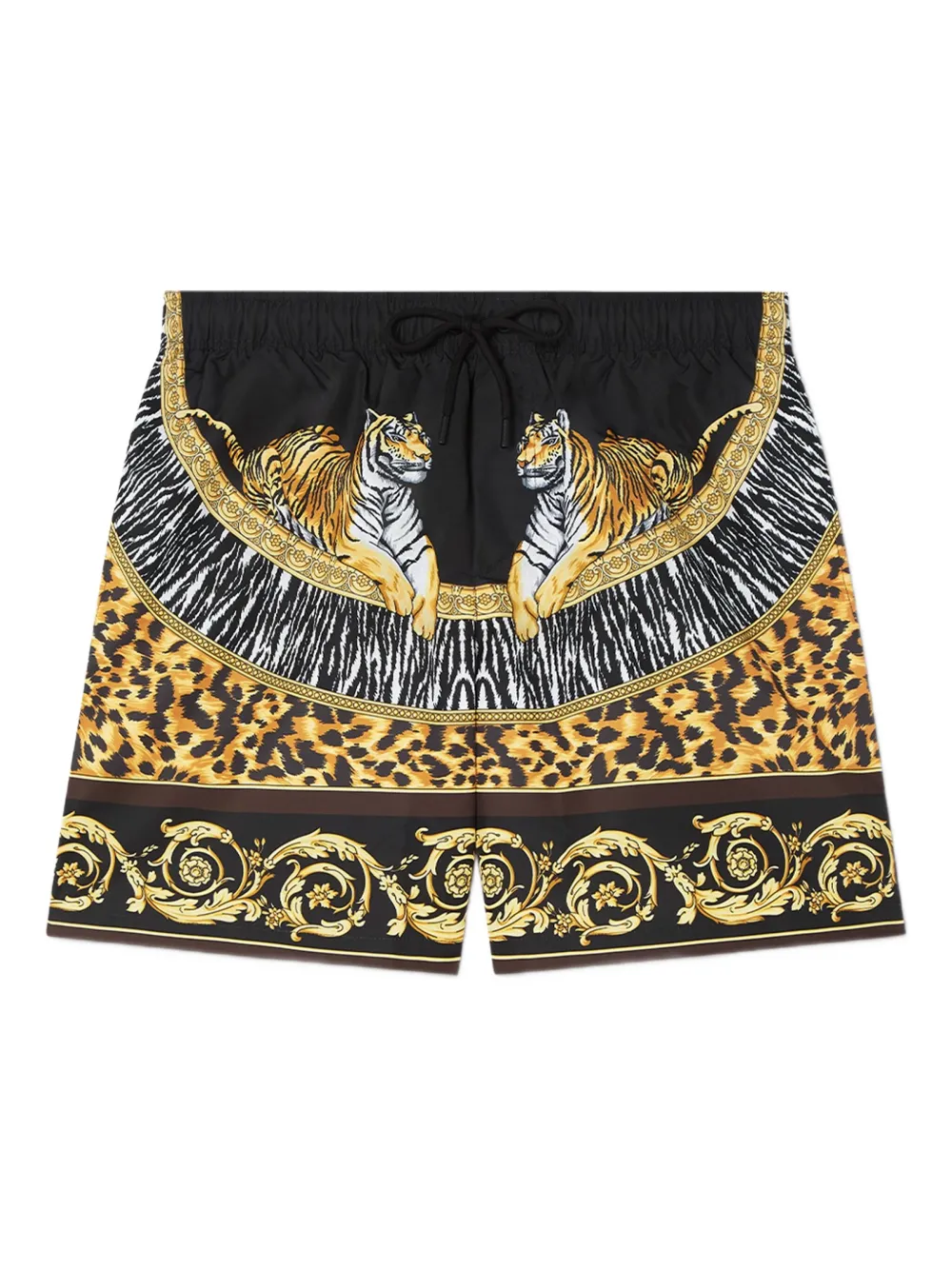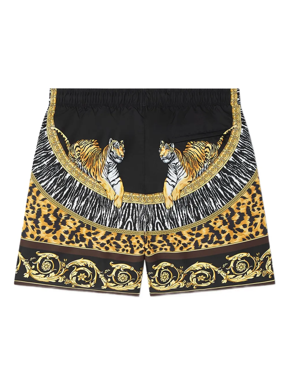 Pantaloni scurti Versace Wild Cats negru, inchidere cu snur, imprimeu Wild Cats Versace. Aveti grija sa probati costumele de baie deasupra propriilor articole de imbracaminte.100% poliester