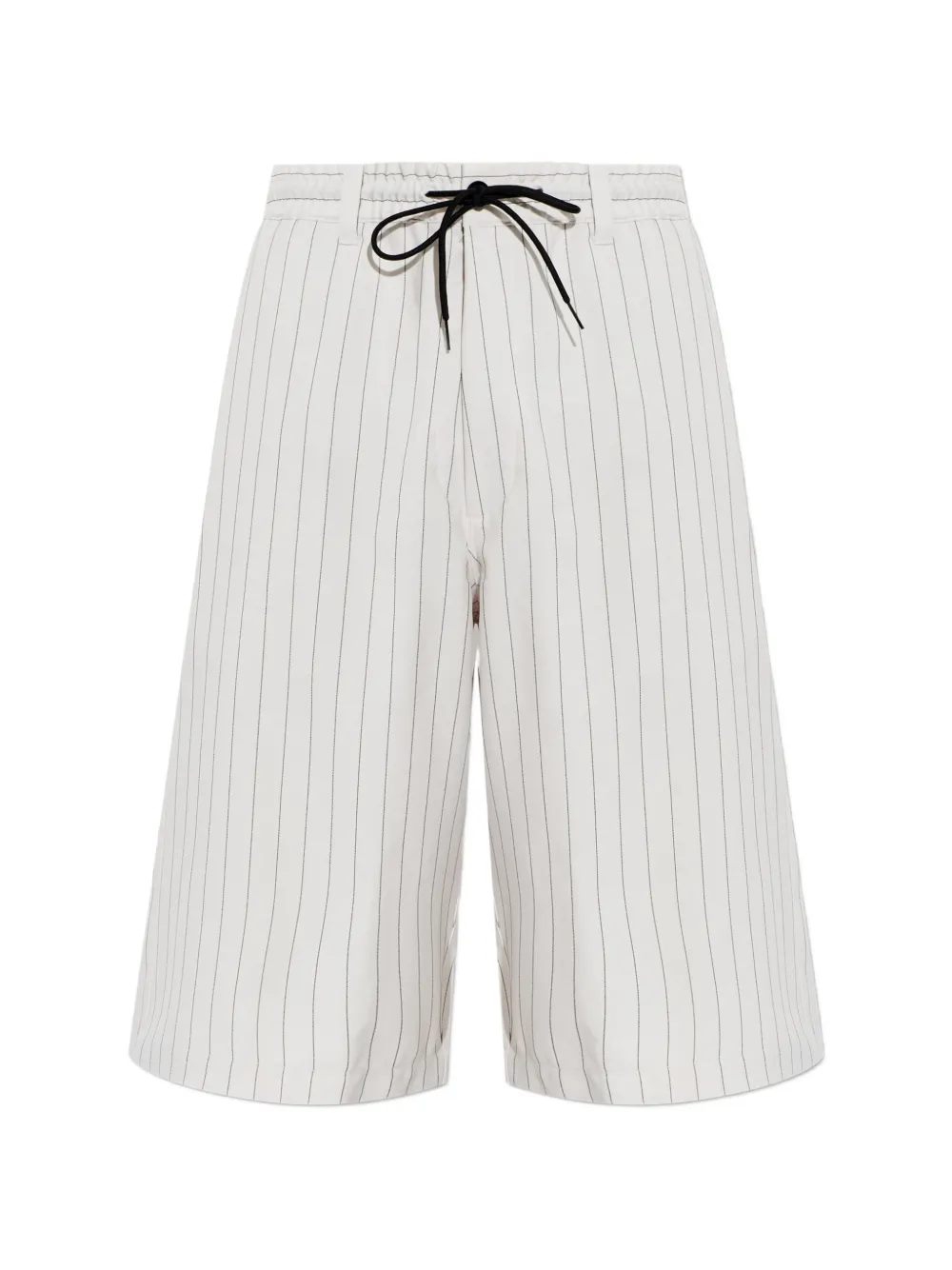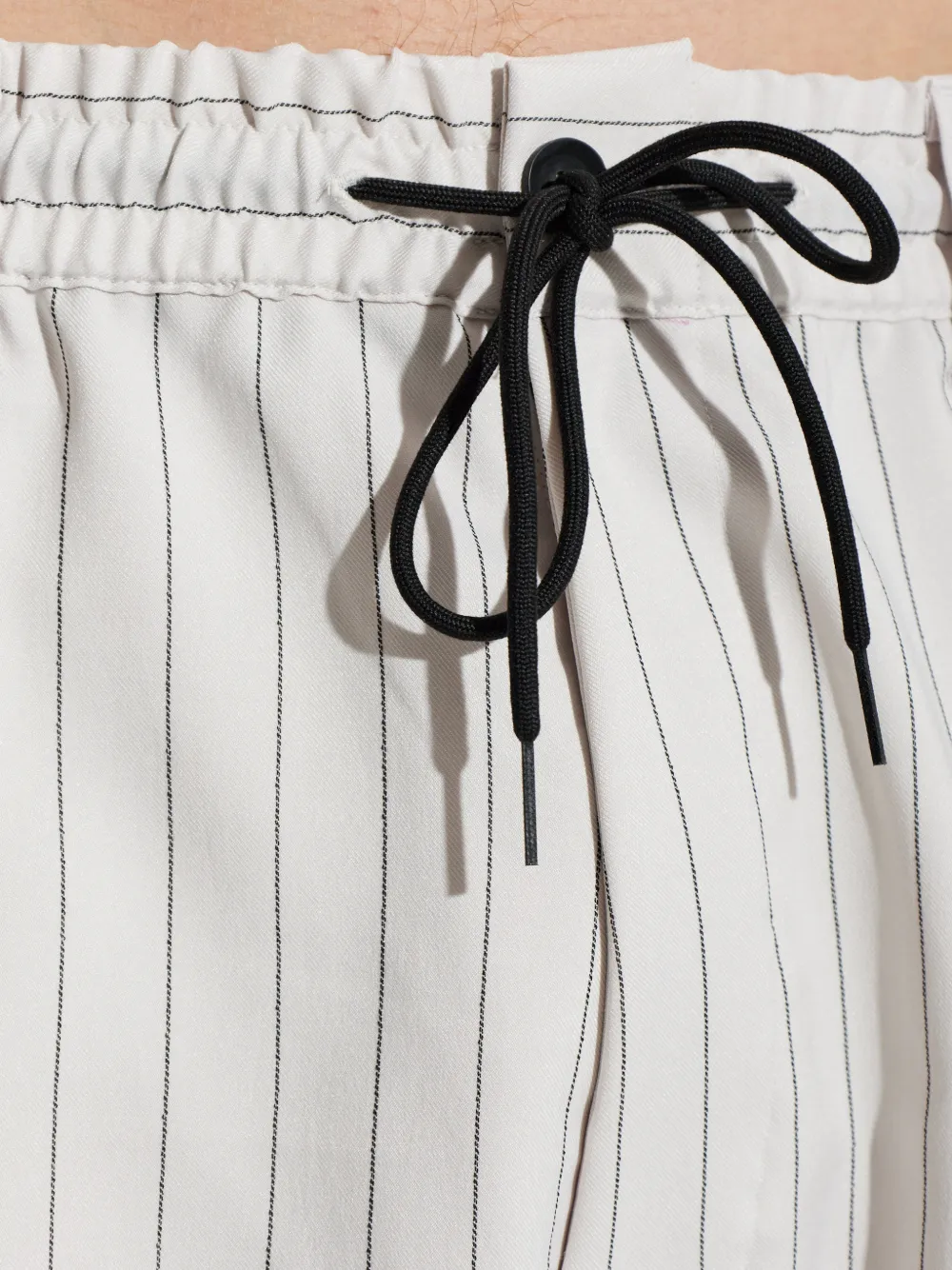 Pantaloni scurti Y-3 pinstripe drawstring albi, cu model in dungi fine, talie elastica cu snur reglabil si buzunare aplicate la spate. 99% poliester 1% vascoza