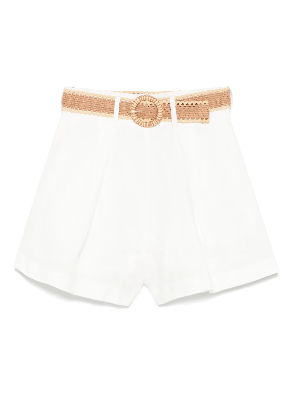 Pantaloni scurti Zimmermann Acacia alb, din in, cu talie inalta, inchidere cu fermoar la spate, buzunare laterale, detalii plisate, curea in jurul taliei si tiv drept. Potriviti pentru sezonul primavara/vara. 100% in; 100% bumbac.