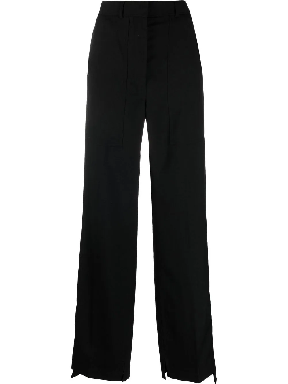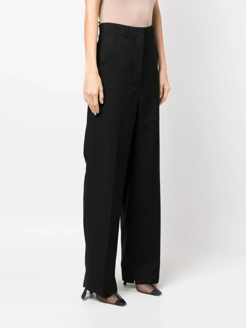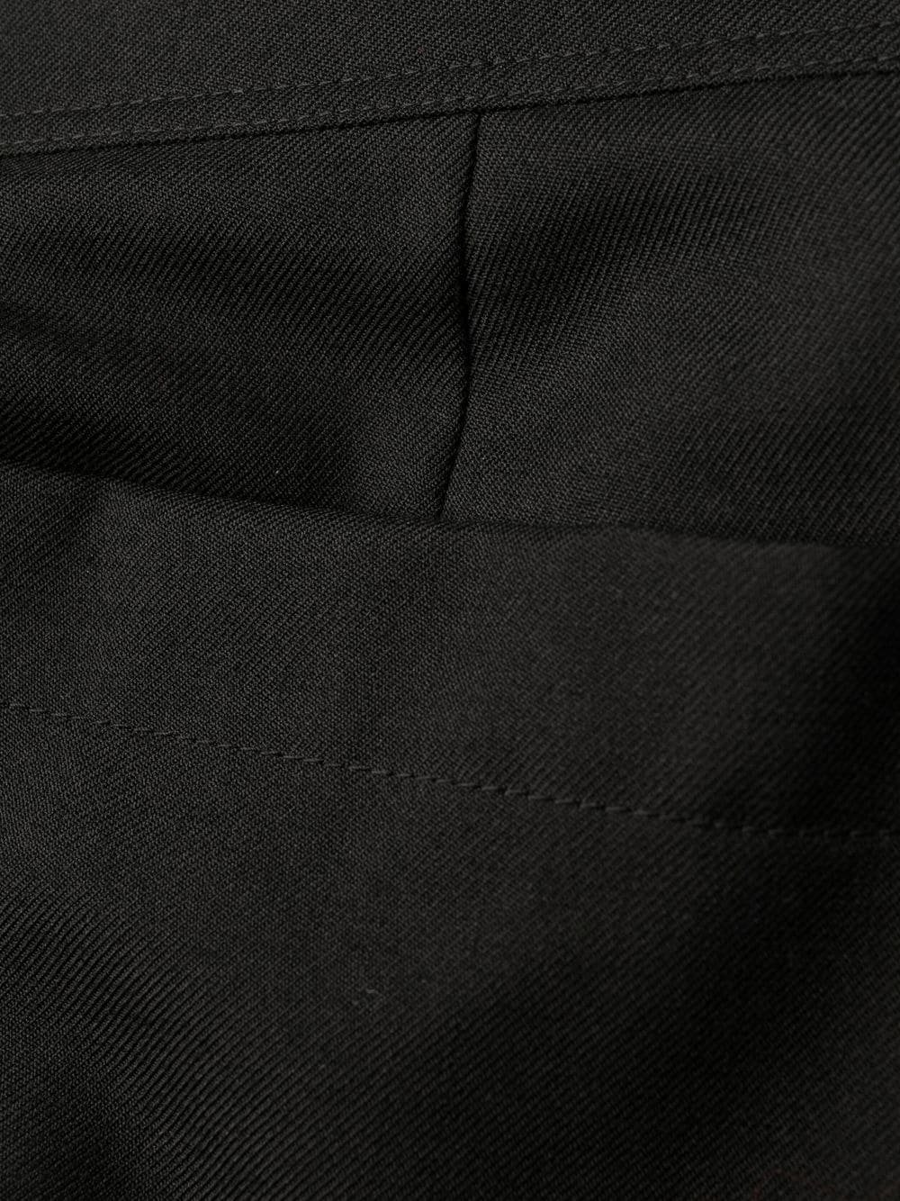 Pantaloni negri din lana, cu inchidere clasica, buzunare laterale, buzunar pe partea din spate, slituri la glezna si croiala piciorului dreapta. Potriviti pentru sezonul toamna/iarna. 100% lana.