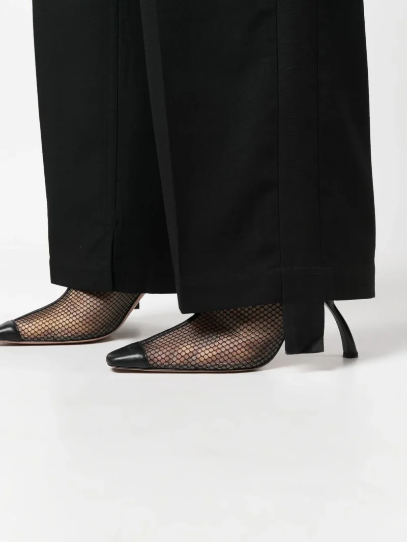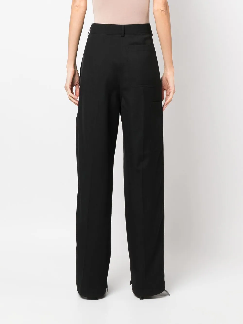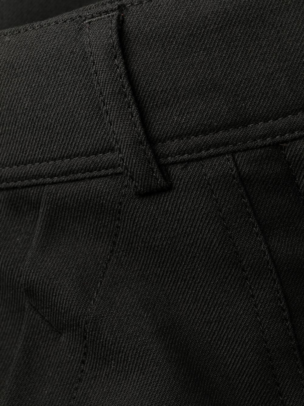 Pantaloni negri din lana, cu inchidere clasica, buzunare laterale, buzunar pe partea din spate, slituri la glezna si croiala piciorului dreapta. Potriviti pentru sezonul toamna/iarna. 100% lana.