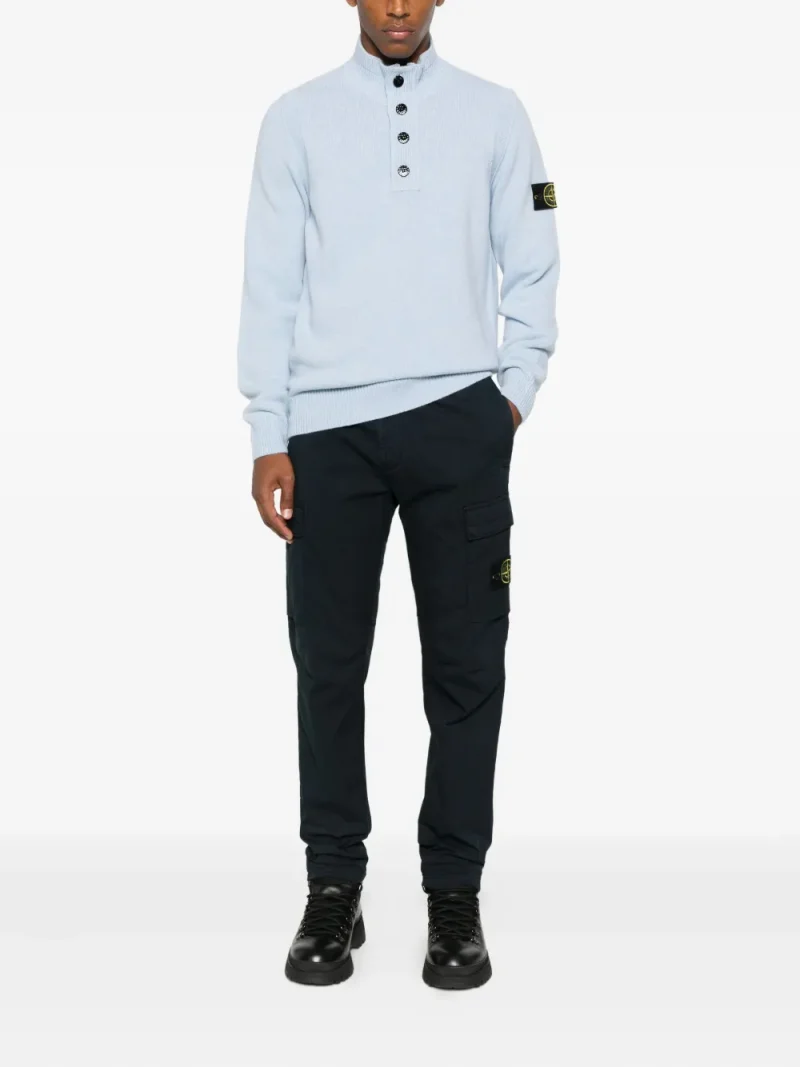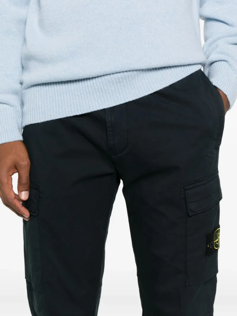 Pantaloni Stone Island Cargo-Pocket bleumarin, cu inchidere nasture si fermoar, cu buzunare multiple, logo Compass Badge detasabil si tiv drept. Potriviti pentru sezonul toamna/iarna. 97% bumbac; 3% elastan.