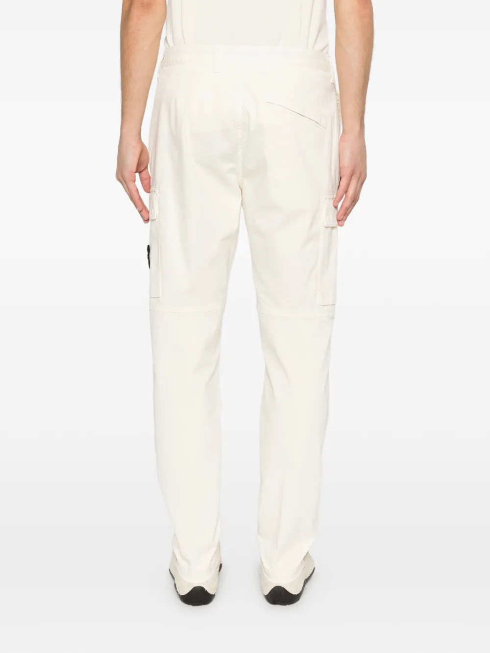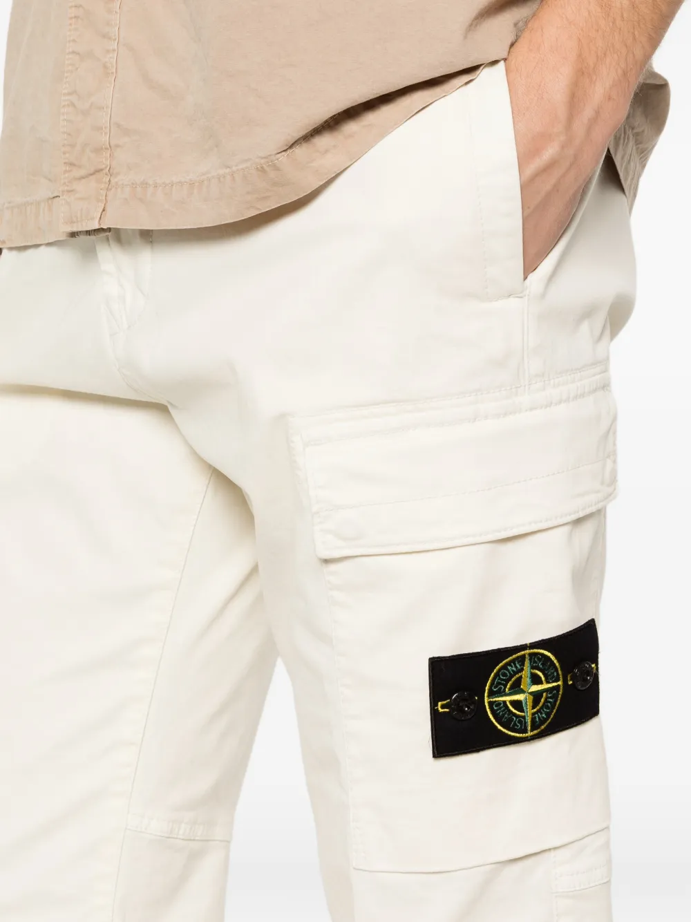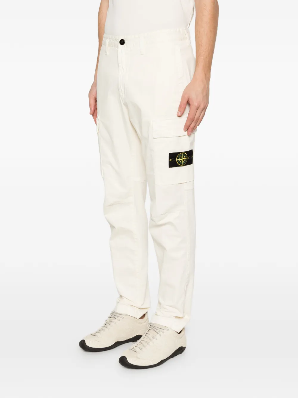 Pantaloni Stone Island Patch-Detail Cargo ecru, regular fit, cu inchidere nasture si fermoar, buzunare multiple, logo Compass Badge detasabil si tiv drept. Potriviti pentru sezonul primavara/vara. 98% bumbac; 2% elastan.