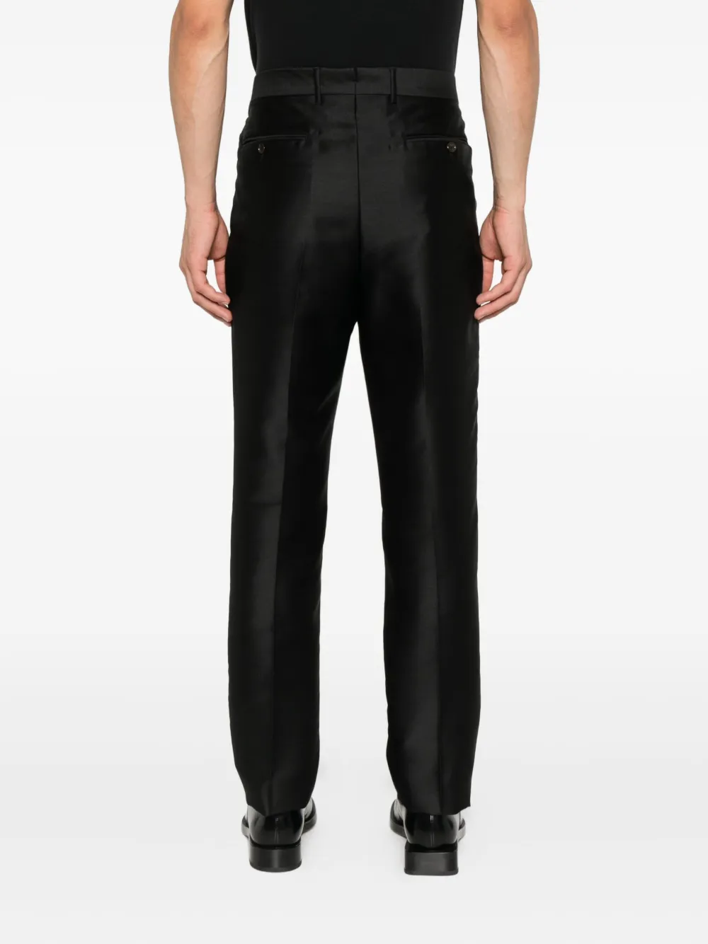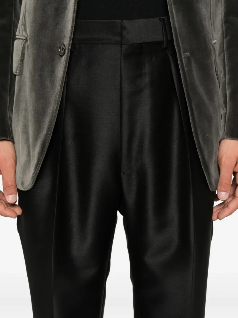Pantaloni TOM FORD Pleat Detail negru, din cupro, cu inchidere clasica, buzunare laterale si tip welt la spate, pliuri decorative si tiv drept. Potriviti pentru sezonul primavara/vara. 100% cupro; 10% matase; 50% lana; 40% mohair; 70% bumbac; 20% viscoza; 10% modal.