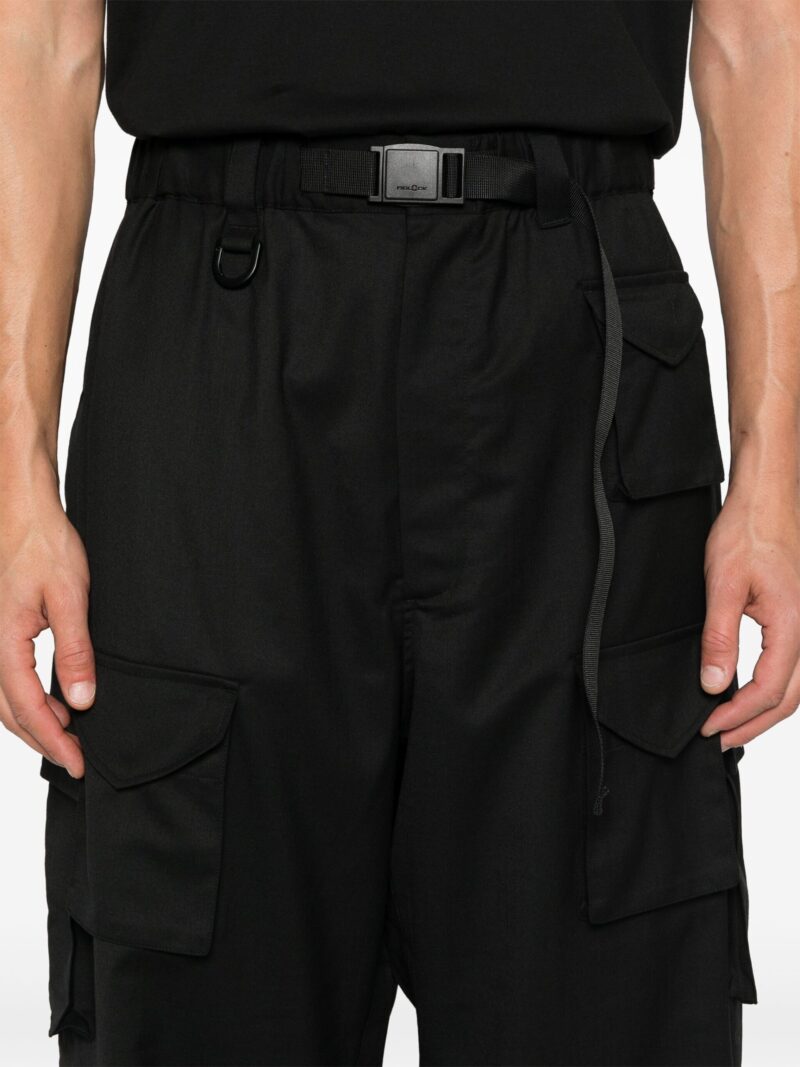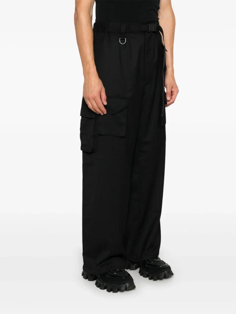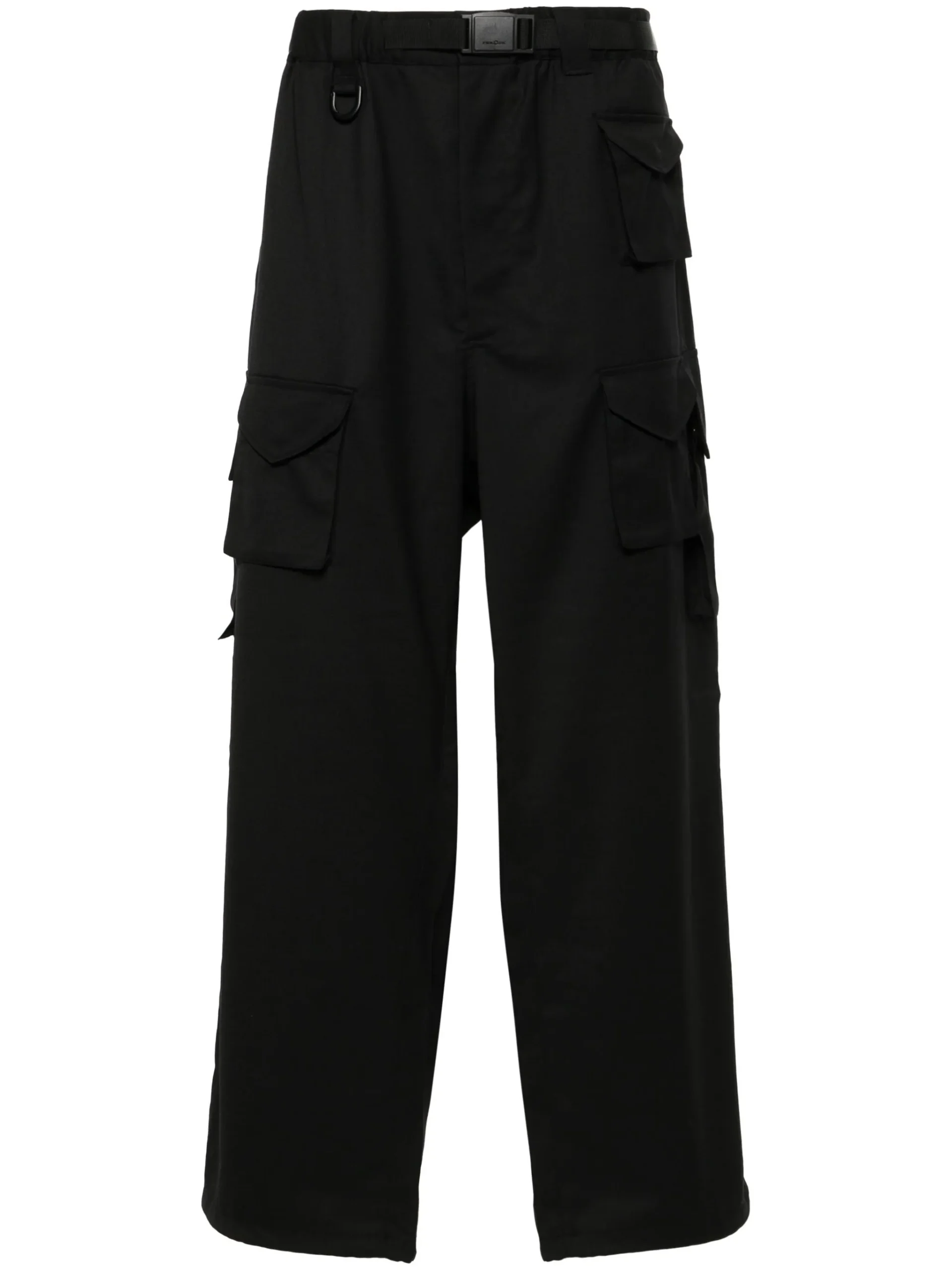 Pantaloni Y-3 Cargo negri din poliester reciclat si lana, cu nasture si fermoar, snur reglabil, buzunare laterale, buzunare cargo, pliuri si croiala larga a piciorului. Potriviti pentru sezonul primavara/vara. 70% poliester reciclat; 30% lana.