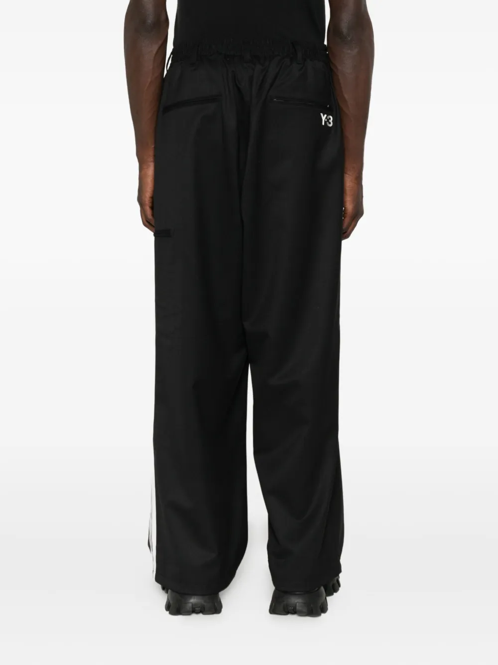 Pantaloni Y-3 Side-Stripe Pocket Track negru, wide-fit, cu talie elastica si inchidere snur, buzunare laterale cu inchidere fermoar, buzunare la spate, „3 stripes” pe laterale si tiv drept. Potriviti pentru sezonul toamna/iarna.5% nylon; 30% lana; 5% elastan.